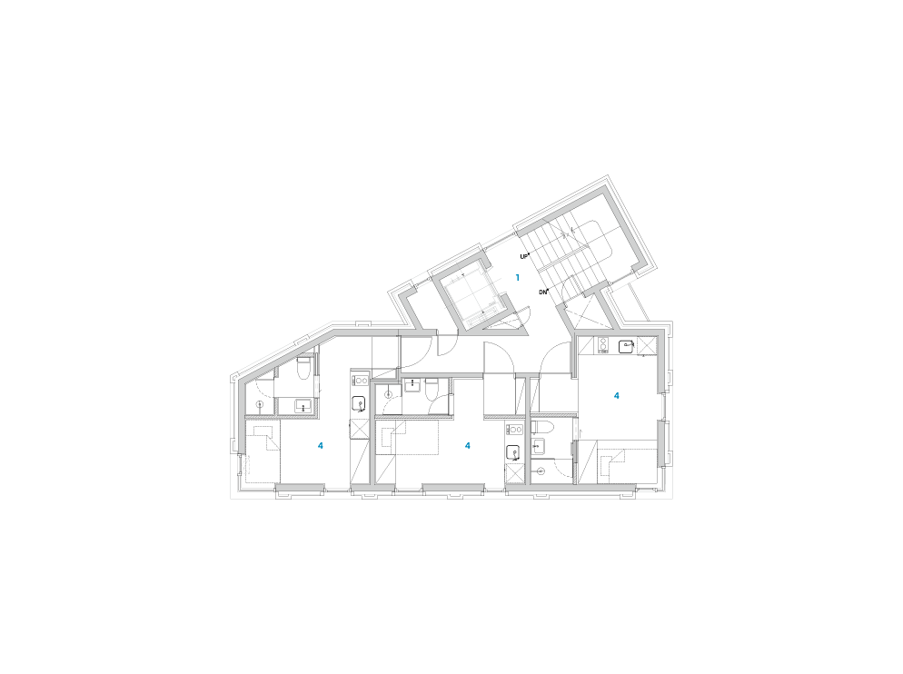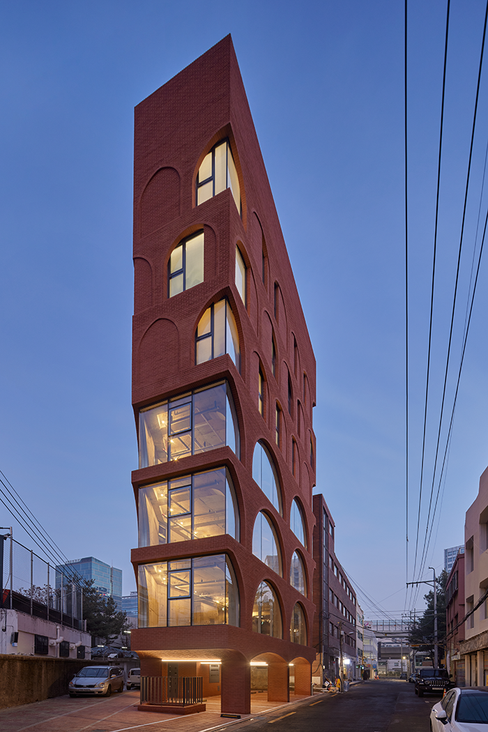 좁은 대지의 1층은 계단실을 제외한 대부분이 법정 주차로 채워진다. 이는 대부분의 소규모 건물에서 1층이 필로티 구조가 될 수밖에 없는 이유이다. 필로티의 기둥이 지상 7층의 거대한 구조물을 받치고 있는 건물에서 필로티 구조와 상부 건물의 이질적이지 않은 조화의 방식에 대한 고민이 중요했다. 필로티 구조의 건물과의 연결성을 만들기 위해 성수동 고가 구조물에서 착안하여 필로티를 두 개의 큰 아치 구조로 계획하였고, 상부층은 그 구조에서 자라나 하나로 엮여 있는 입면으로 계획했다. 필로티의 바닥도 붉은 벽돌로