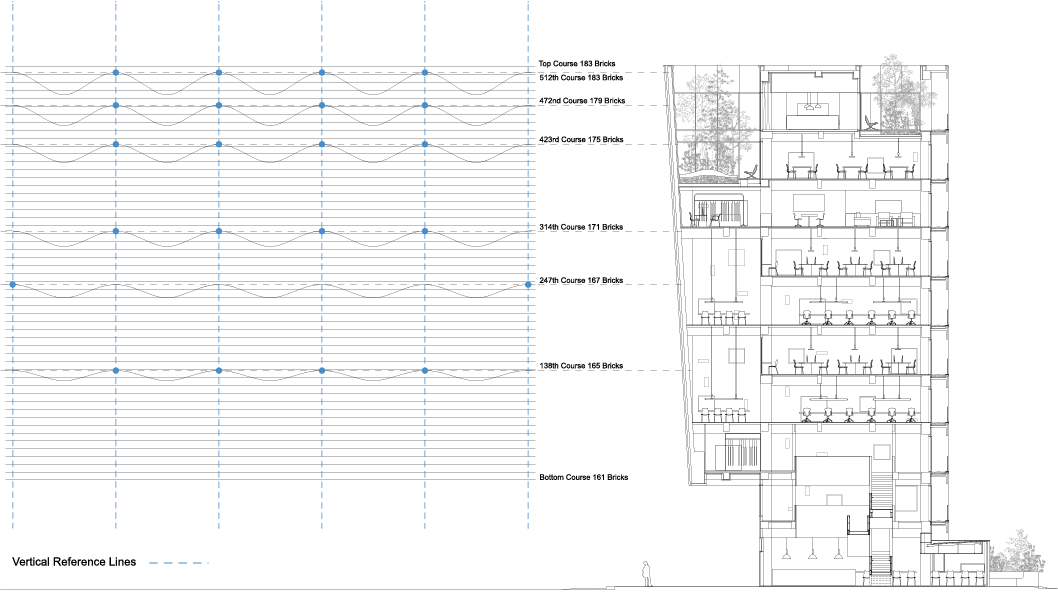 건물의 형태는 전면에서부터 회사의 정체성이 나타나도록 원단이 굽이치는 형태와 실이 짜인 조직감 등을 모티브로 설계되었다. 이러한 입면을 구성하기 위해 벽돌을 콘크리트 벽에 부착하는 ‘커튼 월’ 시스템을 채택했다. 입면의 벽돌은 총 520단이며, 24단마다 새로운 벽돌을 추가하였고, 파도 모양의 물결은 3층에서 시작하여 지붕 선까지 도달한다. 파도처럼 일렁이는 외관은 서쪽에서 성수동으로 향하는 도시와 거리의 전체적인 배경의 역할을 한다.
