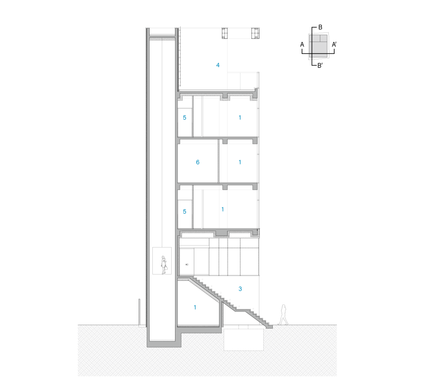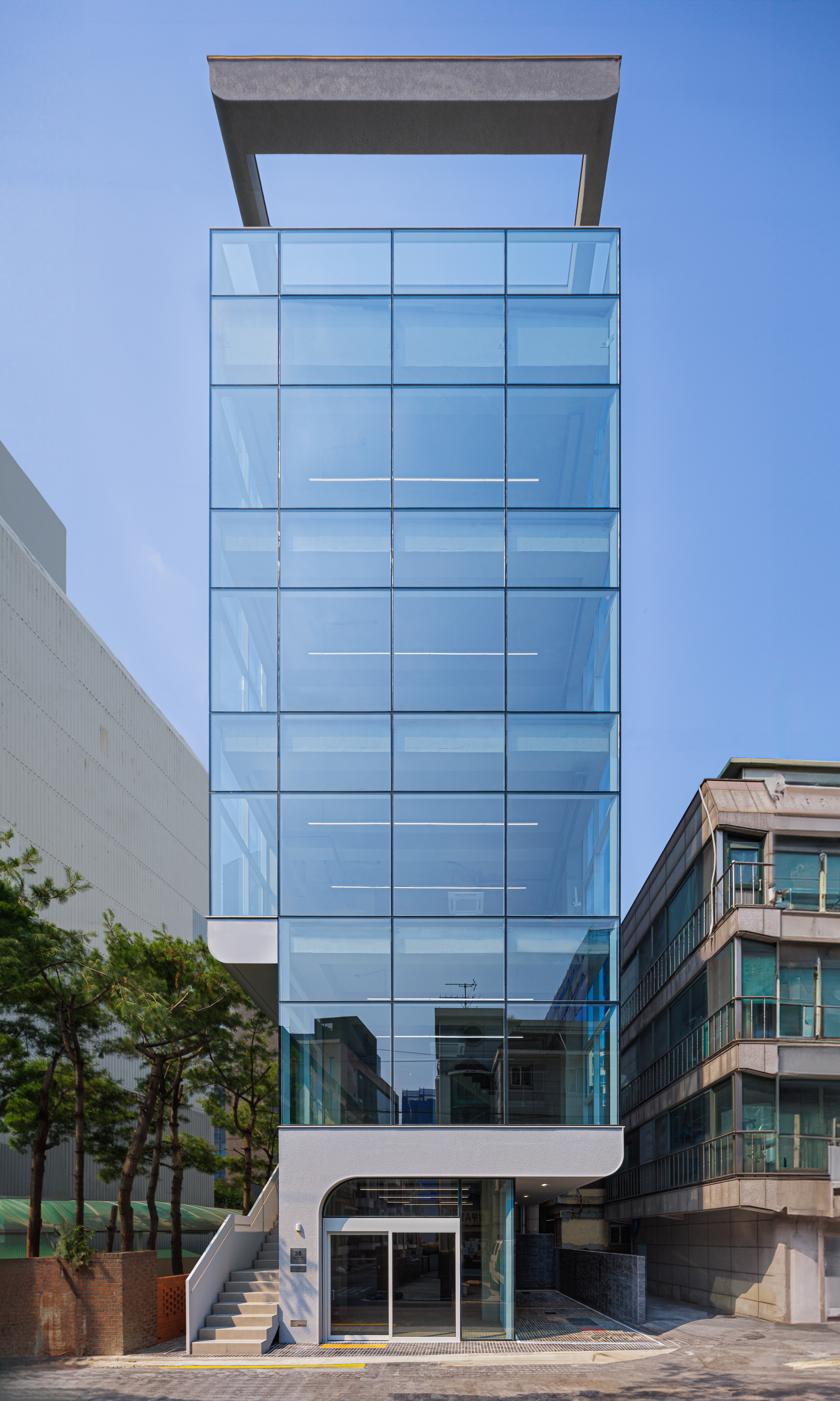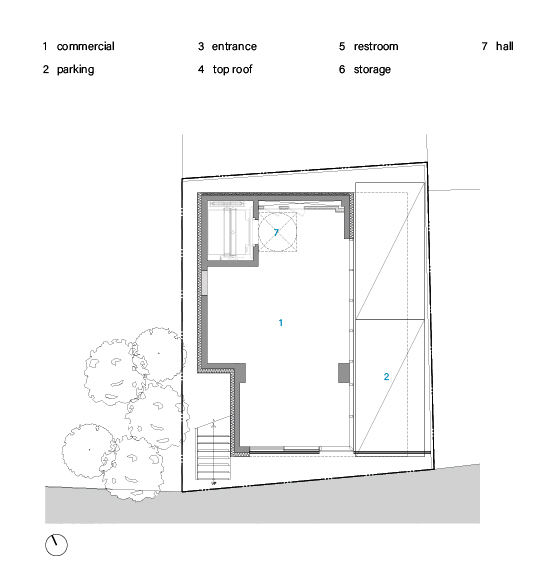 보행자 접근성을 고려한 저층부 계획으로 코어를 후면에 배치하여 건물의 전용률과 정면성을 최대로 확보했다. 외부 계단을 별도로 마련해 지상과 연결하고, 외부 계단에 의해 셋백된 공간을 인접 건물의 조경을 활용하여 조망을 확보하도록 서측 변에 배치했다. 내부는 투시형이 아닌 골조 난간으로 개방형 공용실과 전용실 영역과 구분 짓고 추후 임대 방향에 따라 가변적으로 활용할 수 있다. 지상 5층 규모의 기본적인 평면 형태는 온전한 전용 공간을 가질 수 있도록 범용성을 높였다.