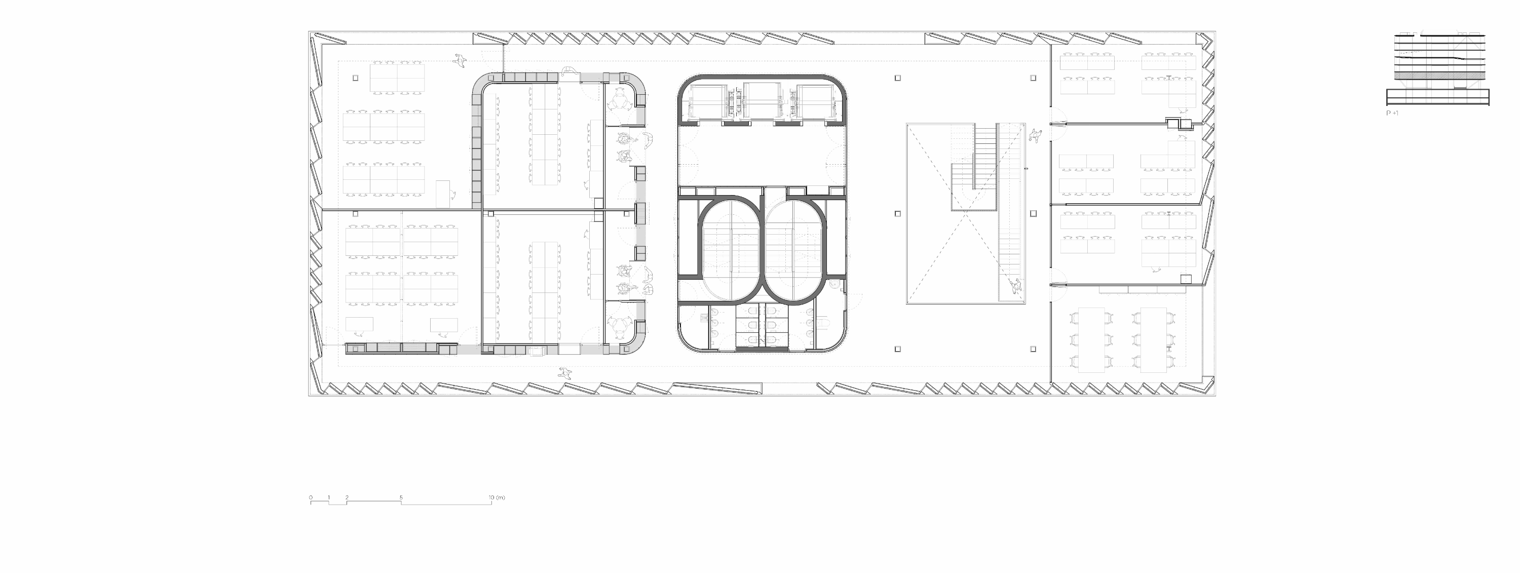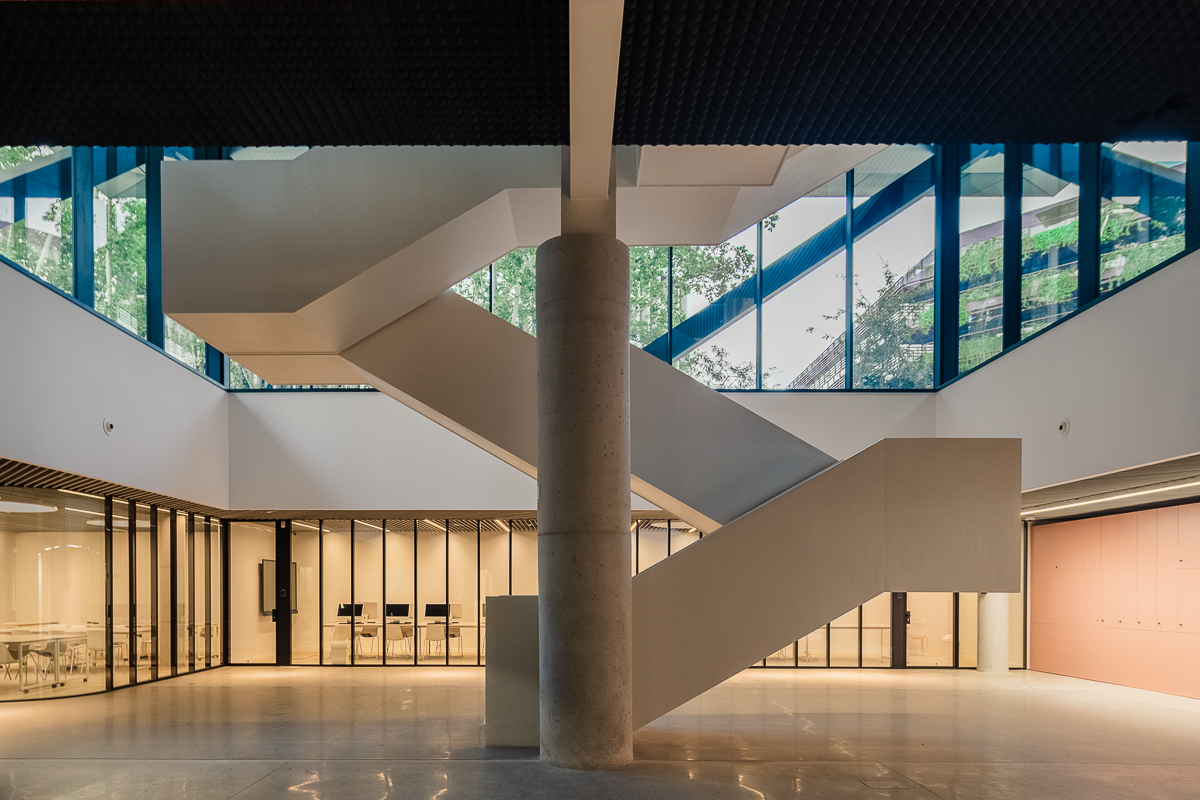 이 건물의 긴 측면은 북동쪽과 남서쪽을 향하고 있습니다. 지하에는 두 개의 원래 부지(약 2,500 m²)를 거의 덮을 수 있는 공간이 마련되었으며, 그 중 일부는 플라타너스 나무가 있습니다. 1층은 투명한 유리 파사드를 갖춘 공간으로, 건물의 외부와 내부가 자연스럽게 연결되도록 디자인되었습니다. 출입구는 건물 내부의 공공 공간과 연결되는 교량과 같은 역할을 하는데, 학생들과 지역 주민들이 상호작용할 수 있도록 돕습니다.