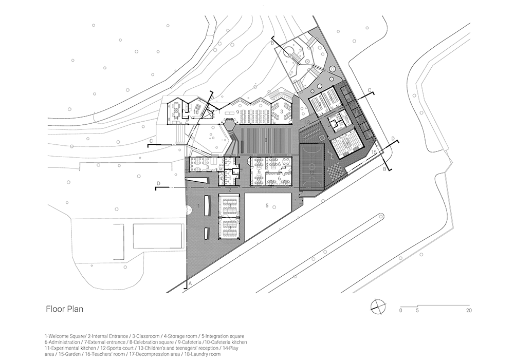 집단 활동을 수용하기 위한 중앙 광장이 계획됐다. 광장은 수백 년된 나무들의 위치를 기준으로 구성됐으며, 자연을 조망할 수 있는 계단식 원형극장이 설치됐다. 이러한 구성을 바탕으로 4개의 블록이 배치됐다. 1블록은 여성 교육실, 2블록은 행정 공간, 3블록은 아동 및 청소년 시설, 4블록은 구내식당, 창고, 직원 공간 등 성인 지원 시설이 들어섰다.