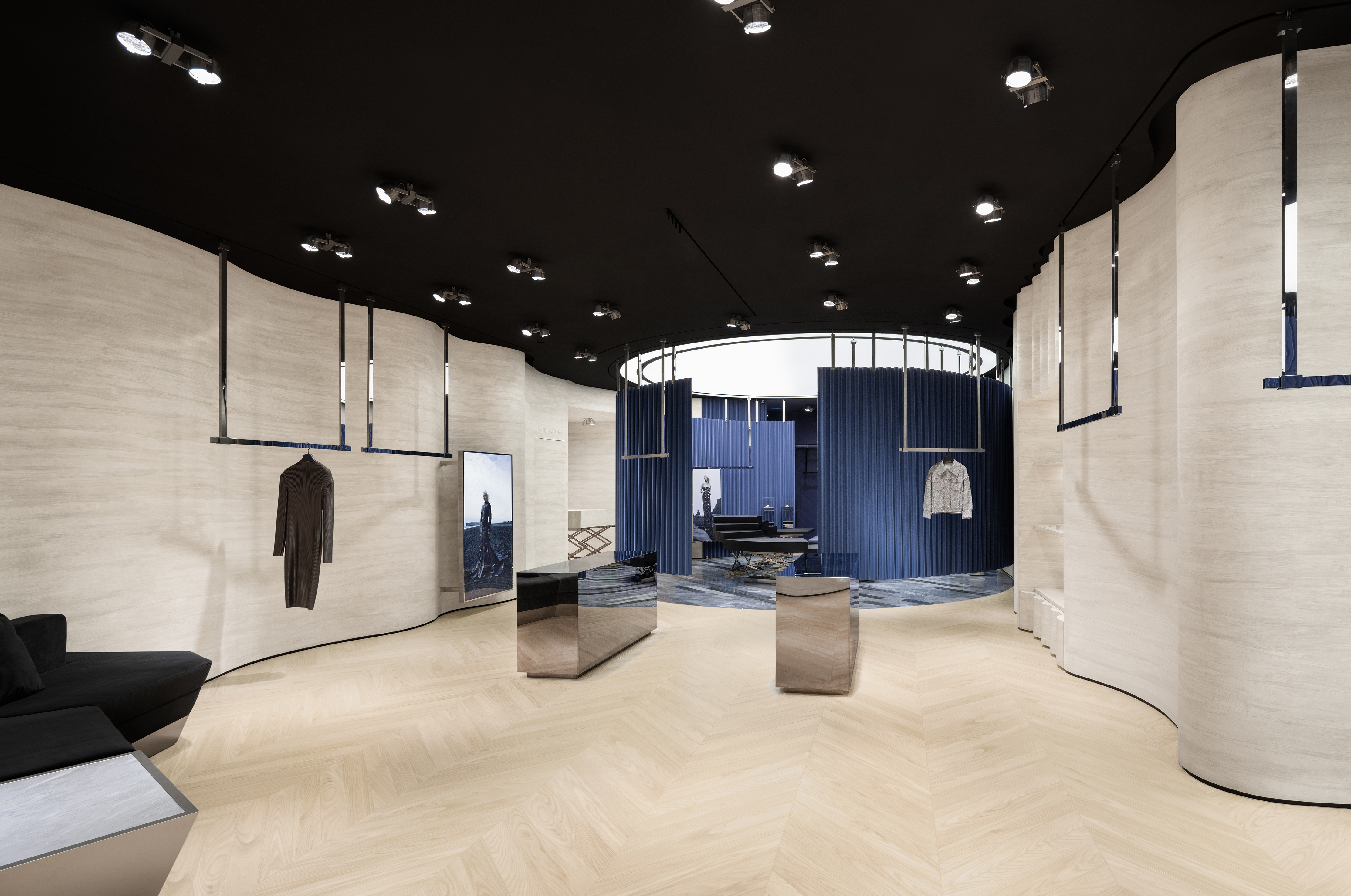 전략적으로 배치된 거울들은 반원형 디자인을 확장하고 반사시켜 실체와 환상의 경계를 흐리게 만든다. 이 매혹적인 공간에서 MITHRIDATE의 복잡한 프린트와 혁신적인 기법이 생동감 있게 드러나며, 방문자는 자신을 여러 측면에서 탐험하는 듯한 경험을 하게 된다. 기본 전시 공간으로 이동하면, 생동감 있는 스포트라이트가 내러티브의 흐름을 형성한다. 혁신적인 천장 트랙 시스템은 제품 전시 방식을 다양화하며, 다용도 걸이봉과 이동식 거울 캐비닛이 일상복과 정장 전시 사이의 유동적인 전환을 가능하게 한다.공간은 대비되는 재료들이 조화를 이루며 유기적으로 연결된다. 짙은 블루 색상의 커튼이 각 구역을 세심하게 구분하며, 부드러운 모래색 벽면과 니치에 걸린 날개 커튼이 내적 조화의 감각을 불러일으킨다.