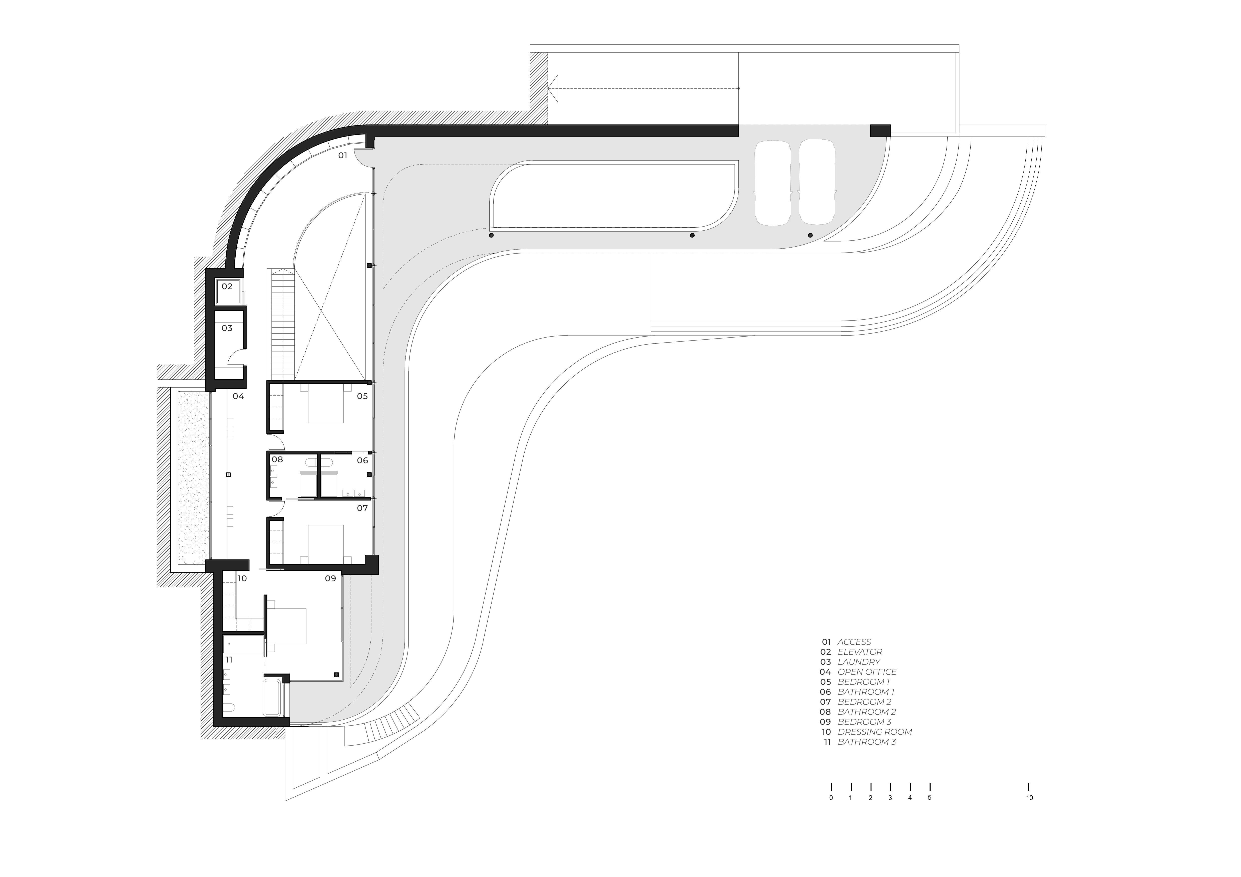 상층부에는 현관 홀과 각각의 테라스가 있는 3개의 침실이 있으며, 바다를 향한 전망대처럼 열려있다. 주택으로의 진입은 수직 동선 코어를 포함하는 이중 높이 공간 옆에서 이루어진다. 검은 마르키나 대리석으로 만든 조각적인 계단은 공간을 구획하며 집안의 다양한 공간에서 다양한 뷰를 제공하기도 한다.