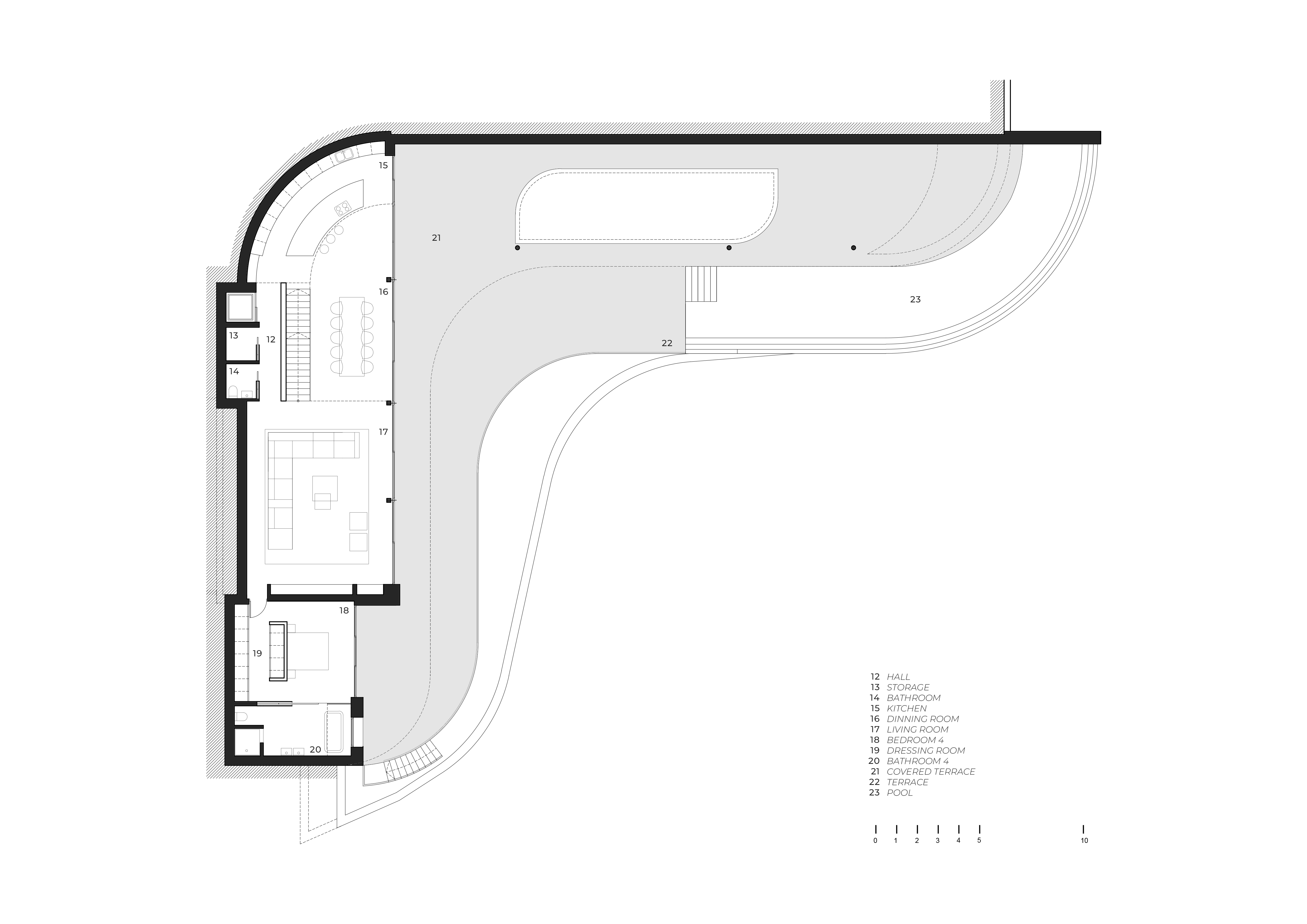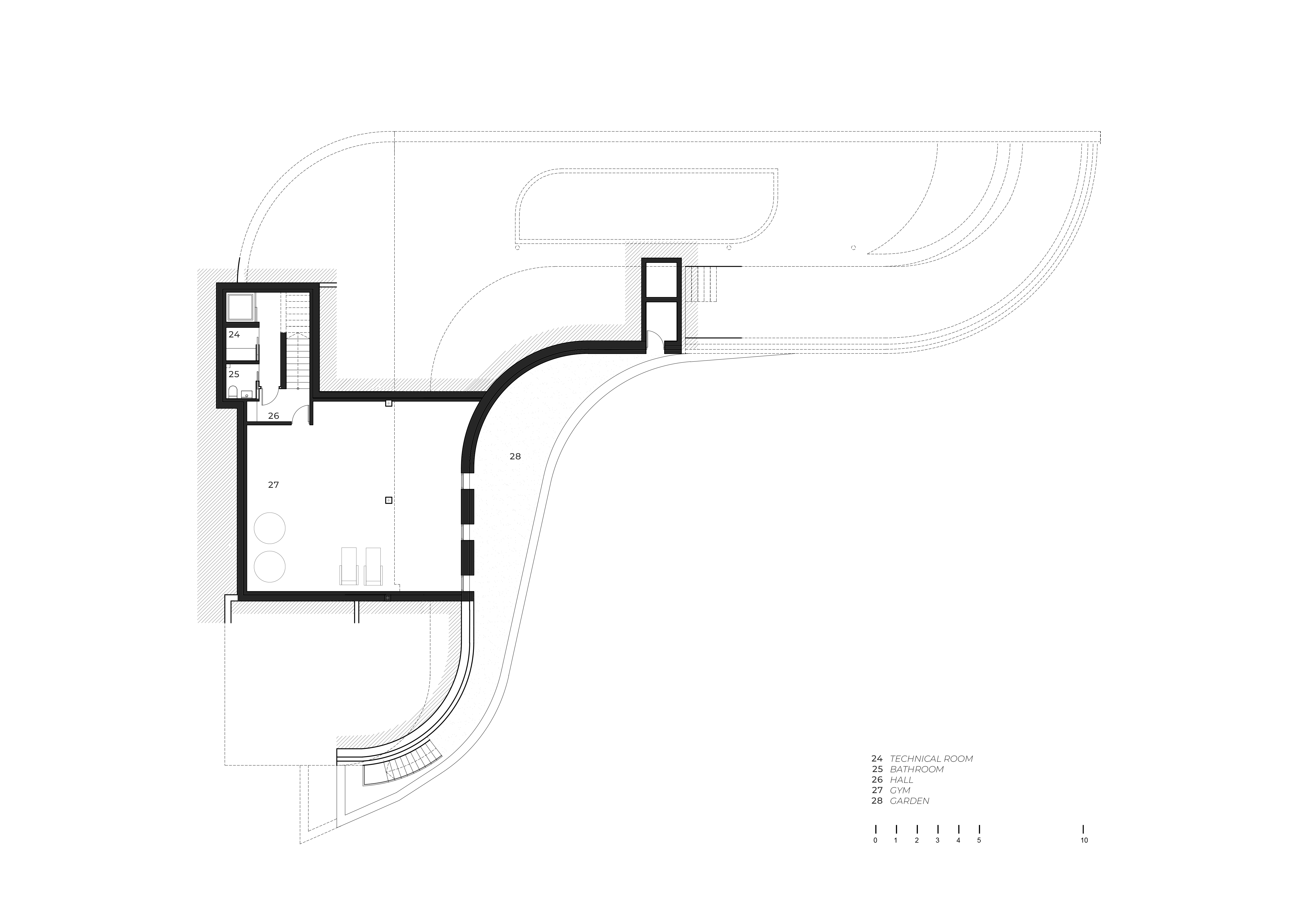 테라스는 직접적인 환경과 분리되어 시각적으로 수평선과 하나인 듯 보이며, 구불구불한 수영장으로 그 경계가 모호해진다. 또한 테라스는 주택 건축의 연장선으로 구상된 지중해식 정원을 품고 있다. 사이프러스 나무들은 또 다른 건축 요소로 계획되어 플랫폼의 구멍을 통과하도록 배치됐으며, 주택의 수평성을 강조한다.