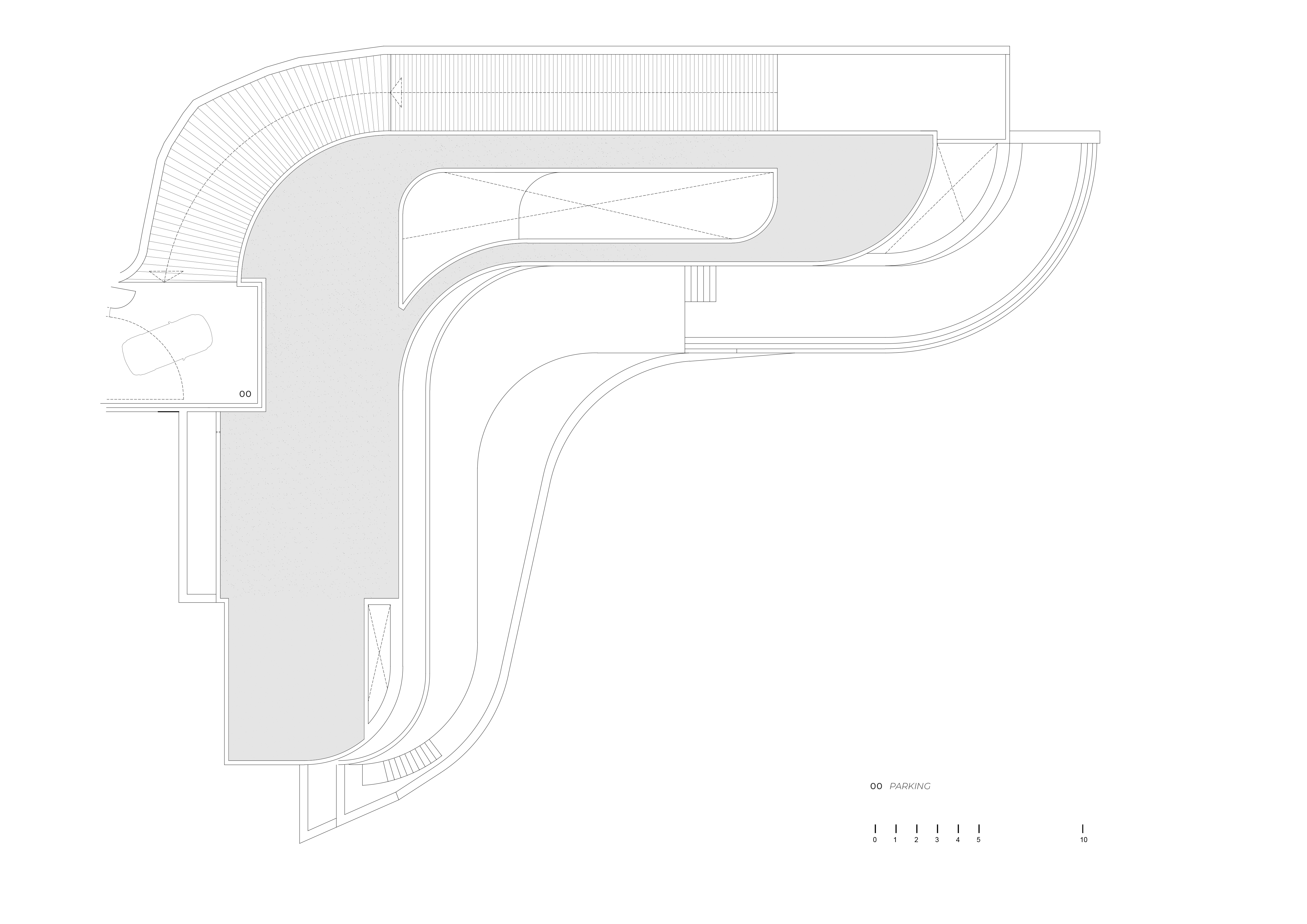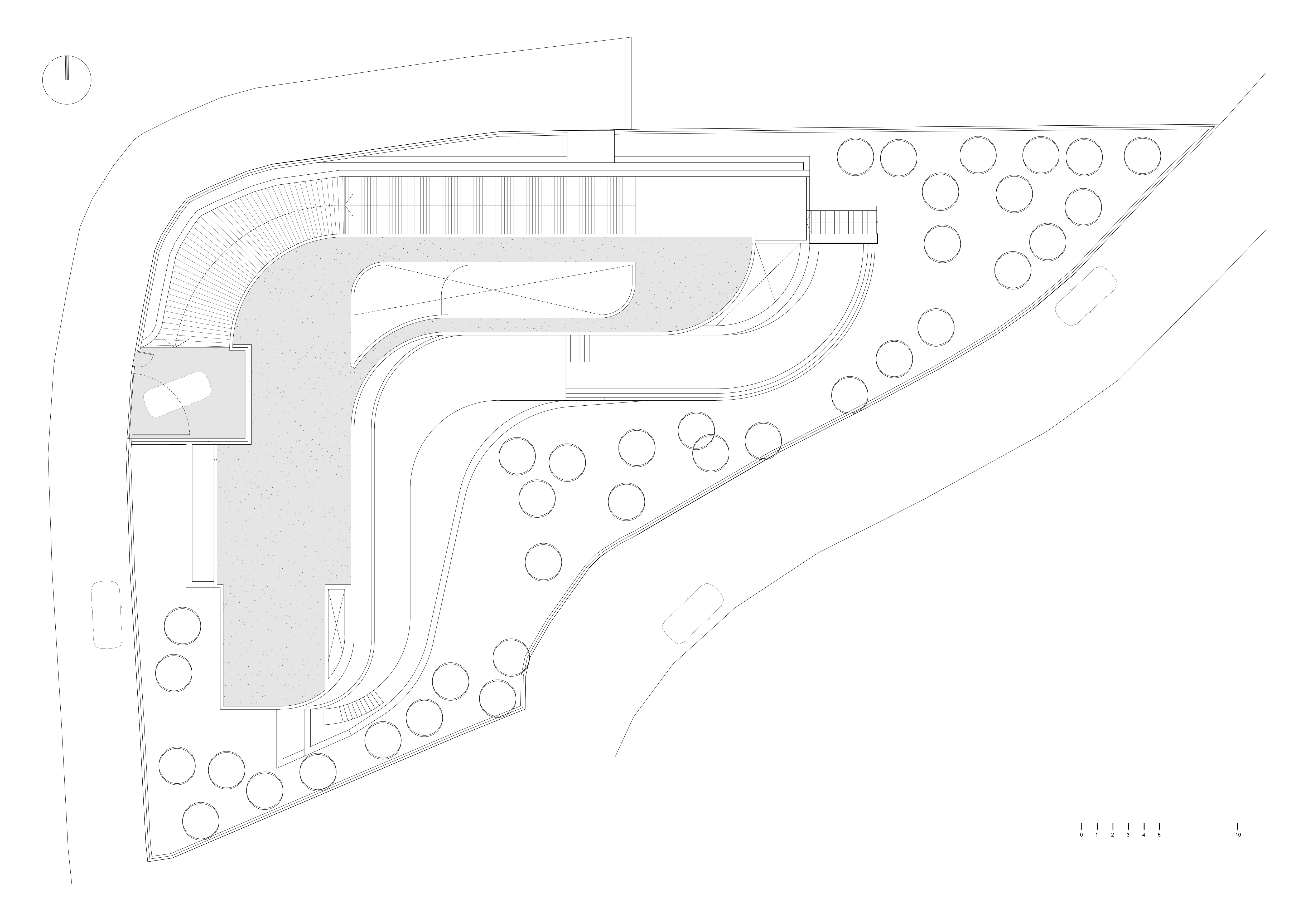 수평 요소들을 지지하는 구조는 지형을 고정하고 담는 건식 석벽과 가는 금속 기둥을 통해 해결됐으며, 이는 플랫폼의 수평성과 대비되는 이중성을 만들어낸다.