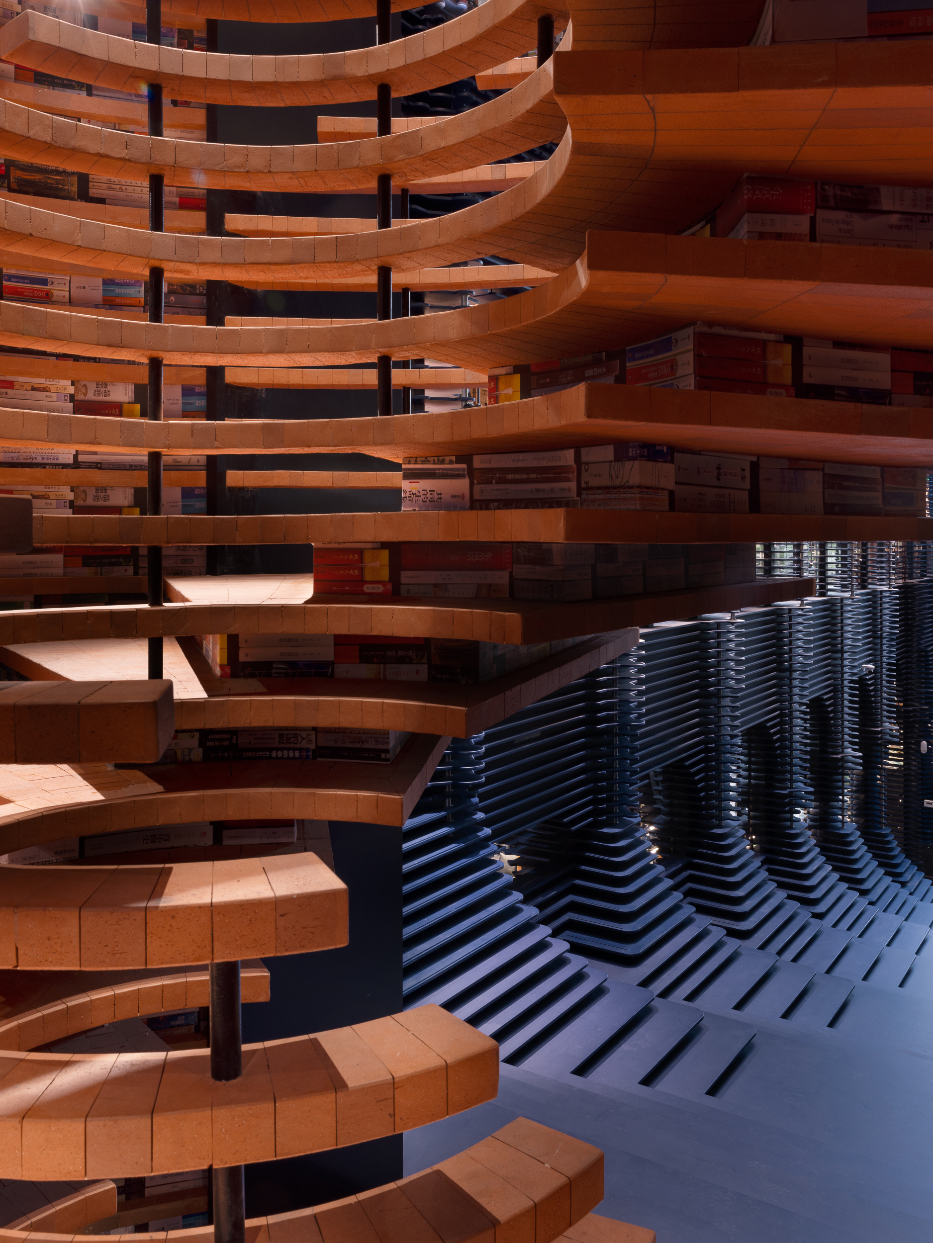 책장은 재료 적층의 틈에서 자연스럽게 나타나고, 좌석과 계단은 책장의 흐름을 따라 만들어져 공간 배치와 자연스럽게 연결된다.