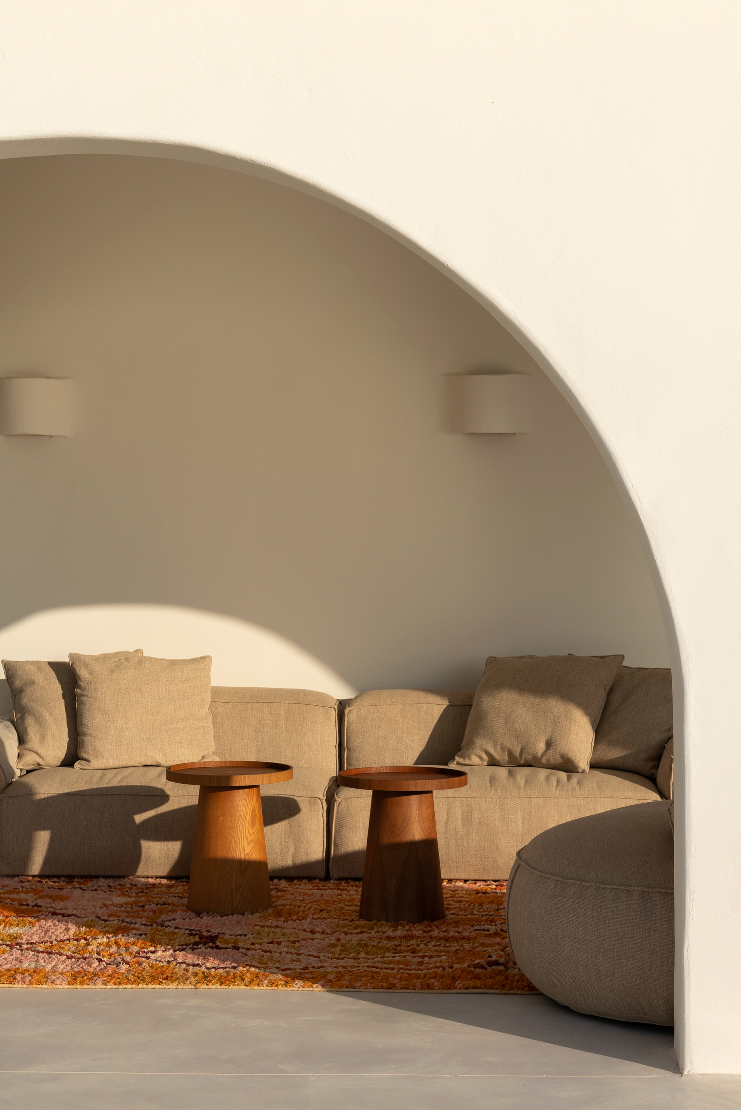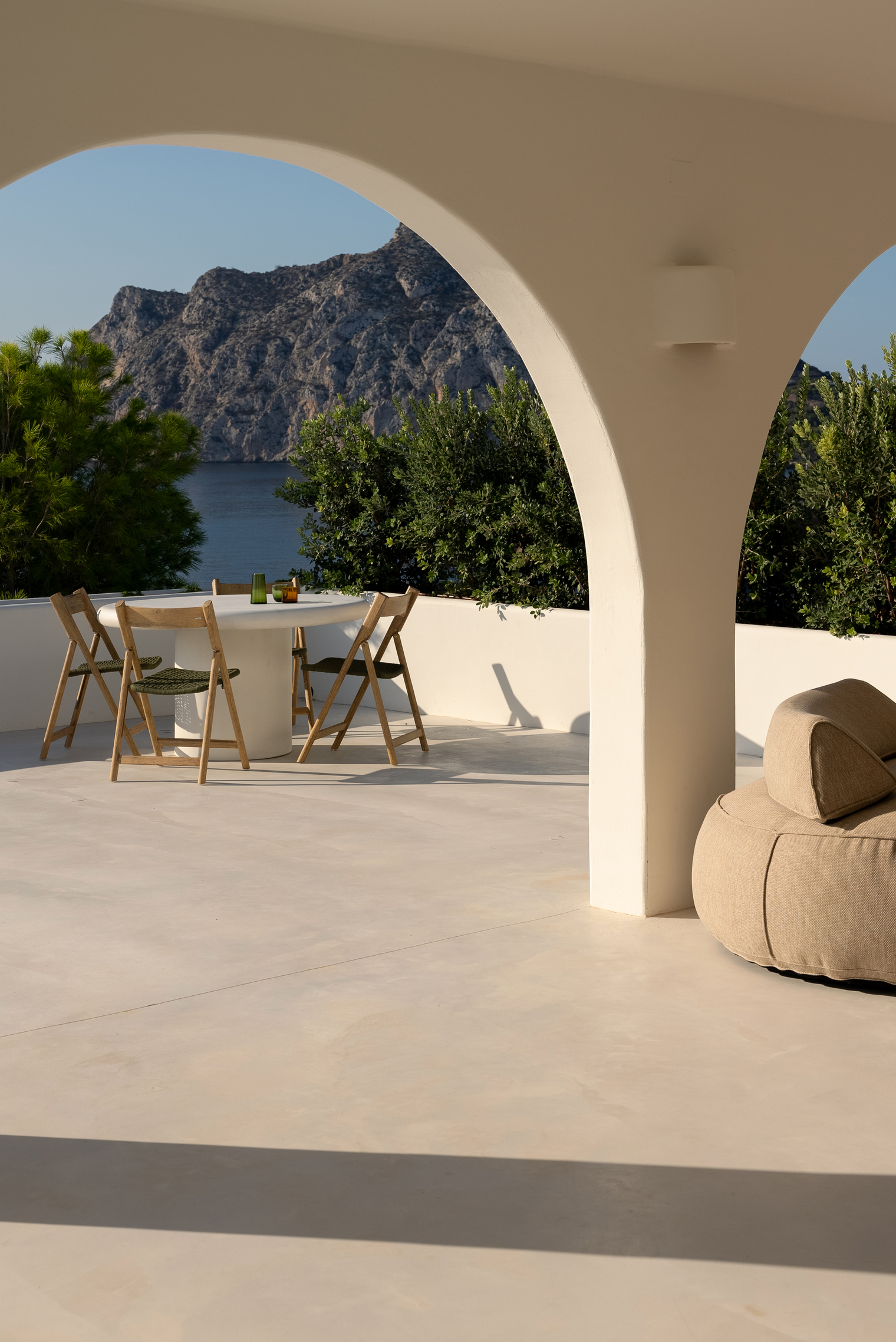 디자이너는 실내와 실외 공간 사이의 경계를 허물었다. 넓은 창문은 탁 트인 바다 전망을 담아내며 실내에 가득 찬 빛의 분위기를 연출하였다. 폴리싱된 시멘트 바닥은 실내에서 현관까지 이어지고, 캐비닛, 주방, 창틀에는 월넛 목재를 사용하여 시멘트 바닥과 대조를 이룬다. 건축물에서는 곡선이 두드러지는데, 콘크리트 소파가에서 그 부분을 확인할 수 있다.