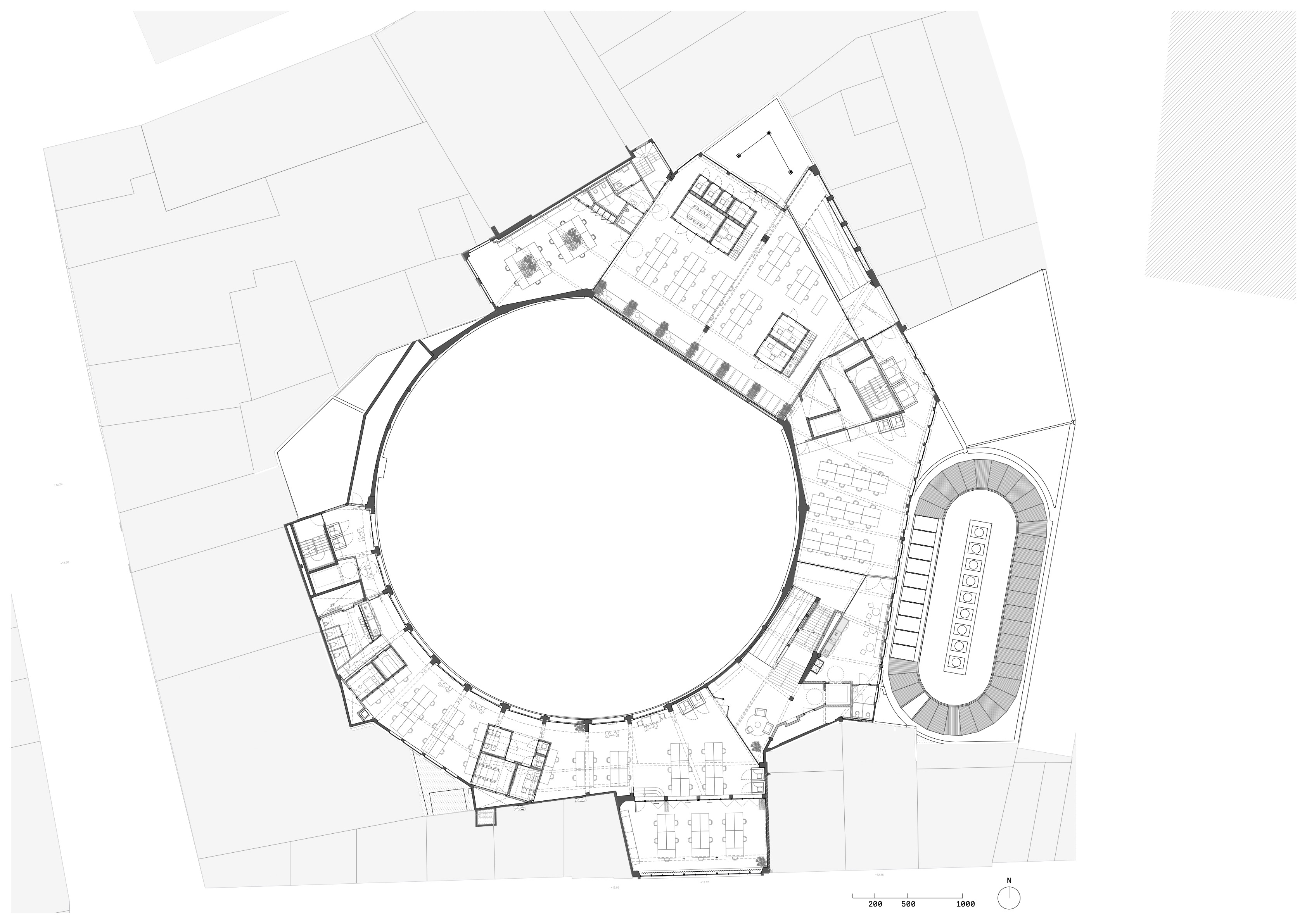 캠퍼스의 중심에는 아레나가 있으며, 발표에서 예술 설치에 이르기까지 다양한 이벤트를 개최할 수 있는 다목적 공간으로 설계되었다. 공간 상단에는 이동식 네온 조명 설치물이 돋보인다.