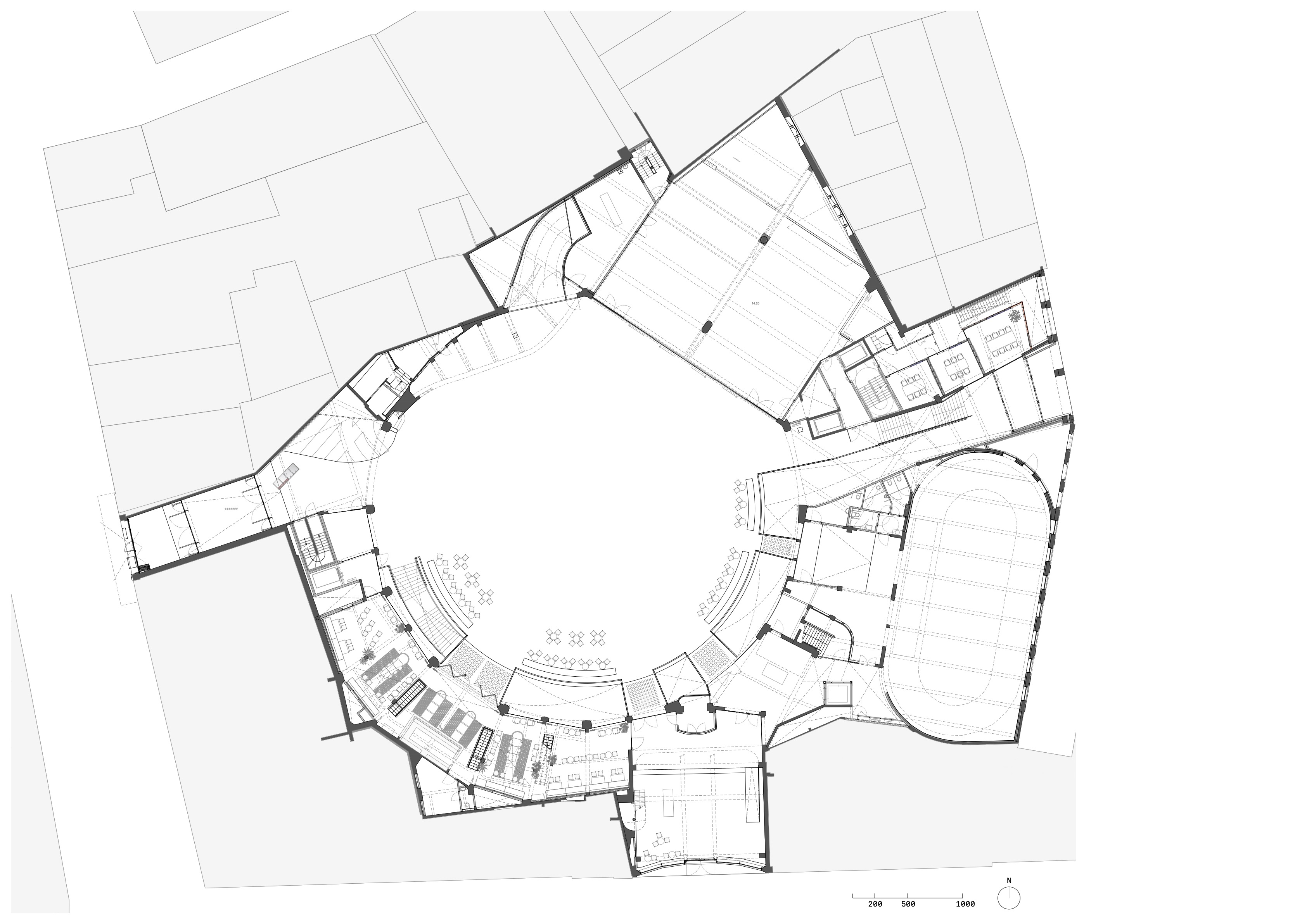 디자이너는 두 개의 식당도 설계하였다. 첫 번째는 1층에 위치한 일식 레스토랑이며, 두 번째는 아레나로 연결되는 중앙 카페이다. 카페는 '바 부지(Bar Bougie)'로 이름붙었으며, 과거 차량 윤활 작업장이었던 공간이다. 이곳은 목재와 따뜻한 조명과 녹색 철재와 콘크리트를 조합하여 현대성과 따뜻함의 균형을 이루는 디자인으로 눈길을 끈다.