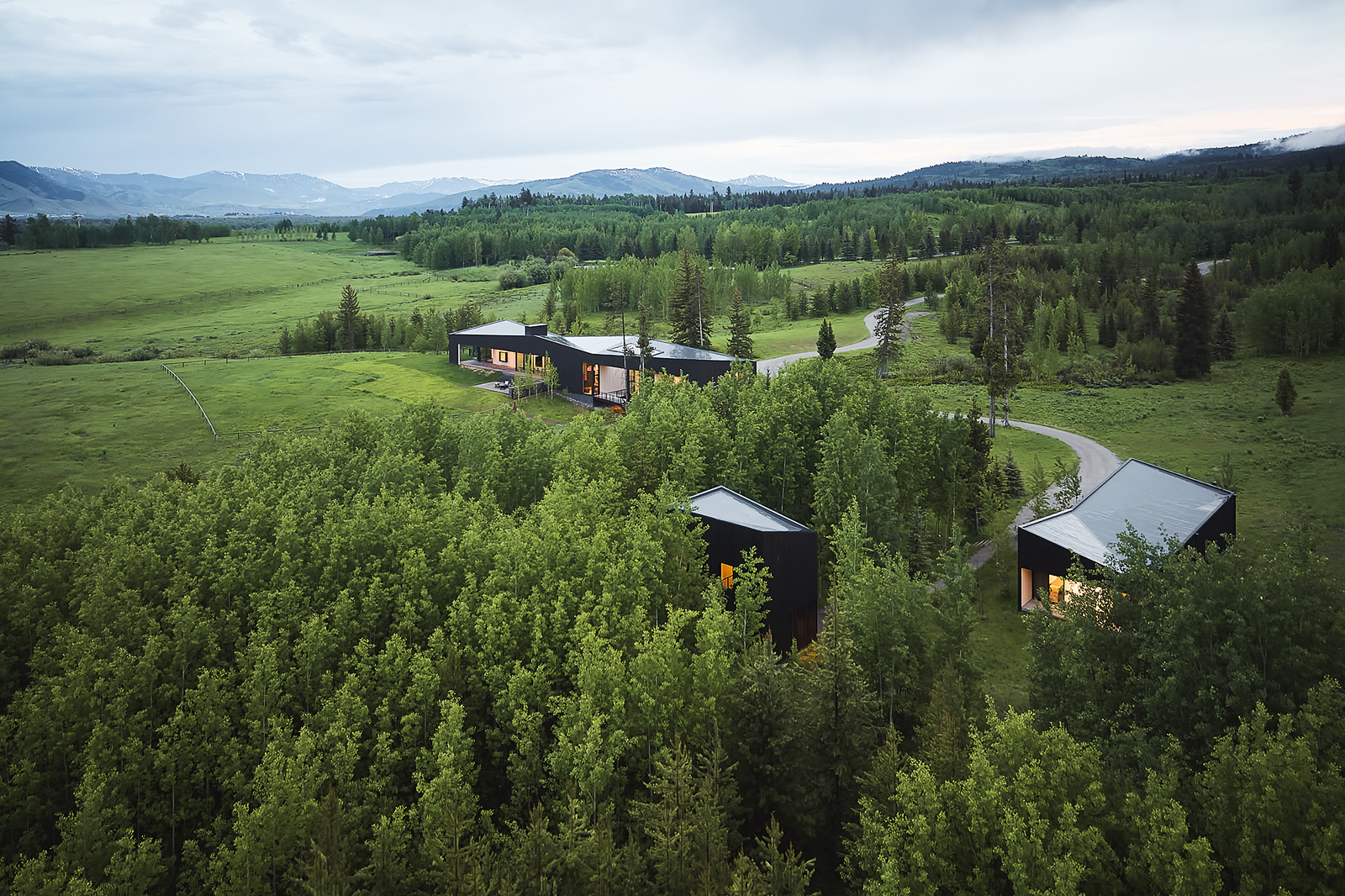 본채, 게스트하우스, 작가 스튜디오로 구성된 이 산장은 각각의 건물이 대지의 성격에 맞춰 설계되었다. 본채는 6,000제곱피트 규모로 들판과 숲의 경계에 자리한다. 게스트하우스는 1,577제곱피트 규모로 숲 속 깊이 자리하고, 작가 스튜디오는 580제곱피트 규모로 나무 숲 사이에 자리 잡았다. 네 번째 공간은 아직 준공되지 않았으며 남쪽에 배치될 예정이다. 건축물은 테톤 산맥, 자연 초원, 숲의 광활한 전망을 담기 위해 개방적인 디자인으로 설계되었다.