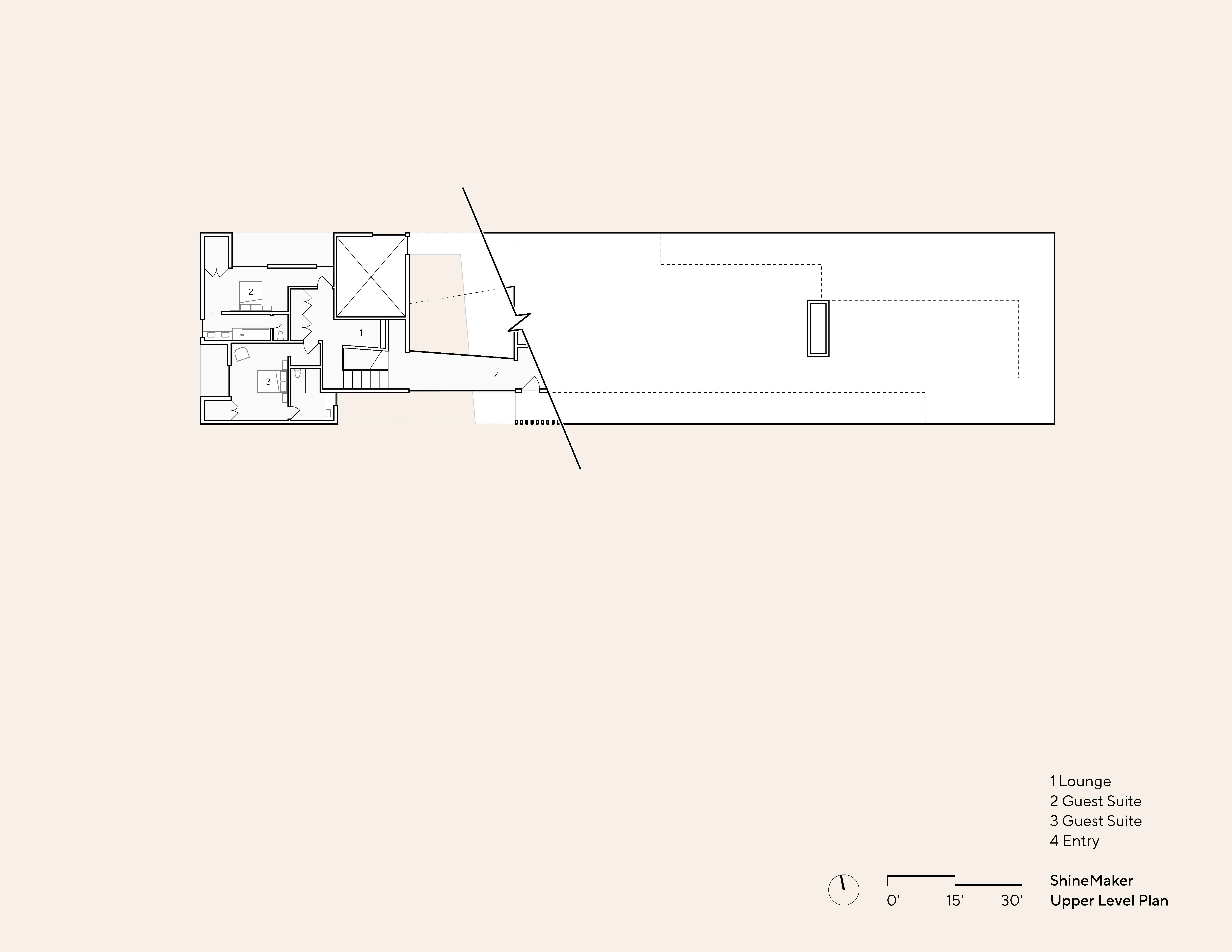 게스트하우스는 본채에서 몇 걸음 떨어진 곳에 위치하며 본채와 유사한 입구와 직사각형 형태를 가진다. 작가 스튜디오는 게스트하우스 바로 뒤에 자리해 다른 건물들과 대조인 형태를 띈다. 두 층으로 구성된 이 건물은 어린 아스펜 나무들로 둘러싸여 있다. 1층에는 생활 공간이, 2층에는 나무 캐노피에 둘러싸인 스튜디오가 있어 거주자가 사색에 몰입할 수 있다.