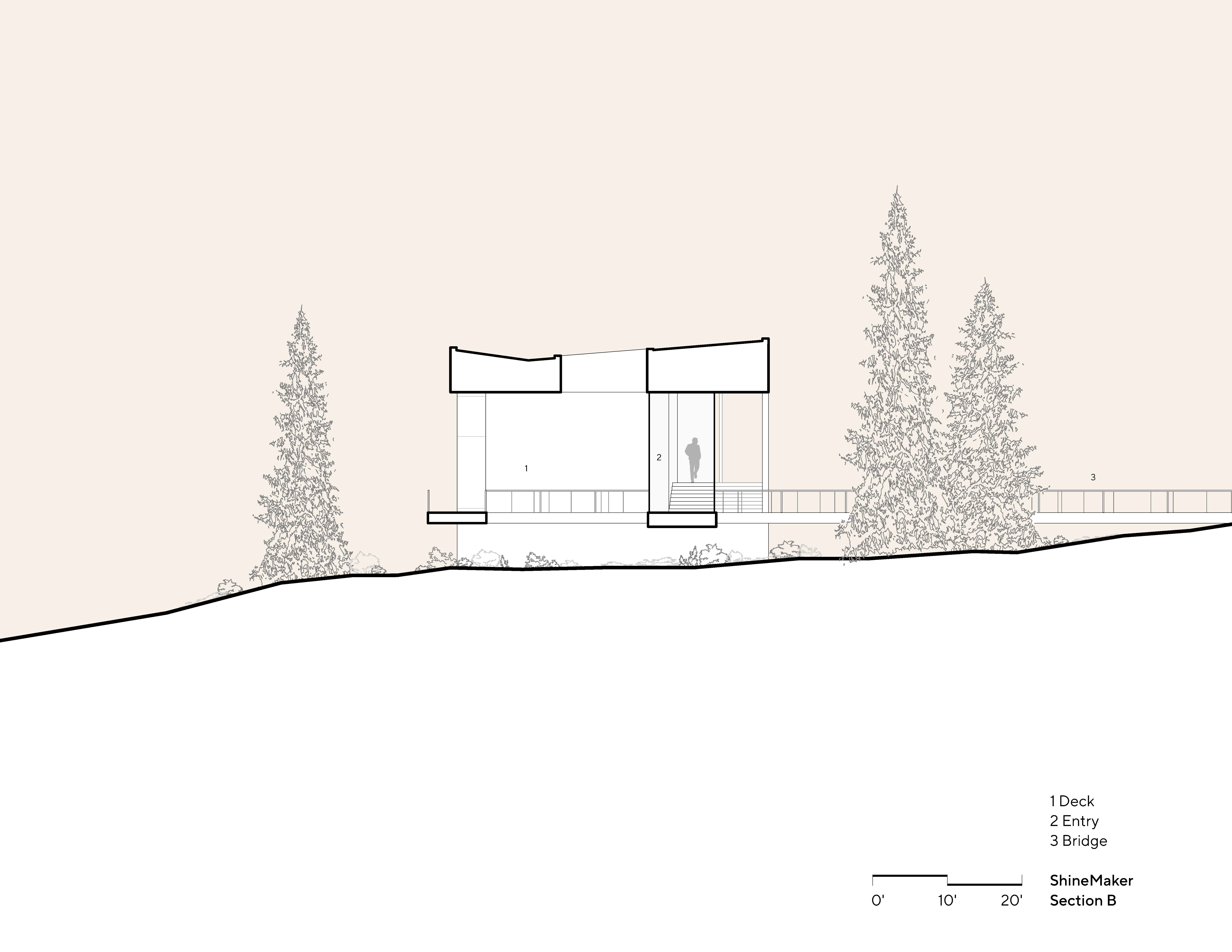 본채는 직사각형 평면으로 중심이 움푹 들어가 있으며 코너는 하늘을 향해 솟아오른다. 외관은 일본 전통 방식인 쇼우스를 기반으로마감되어 자연스럽게 조각된 돌출부와 개구부를 만든다. 집의 입구는 저지대 개울 위에 있어서 바닥에 투명한 창을 통해 자연과의 연결을 드러낸다. 내부는 밝은 아틀란틱 시더 목재로 마감되어 석고 벽과 천장까지 이어지며 바닥부터 천장까지는 유리창으로 연결된다.