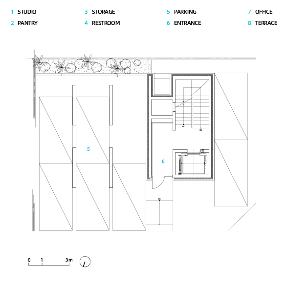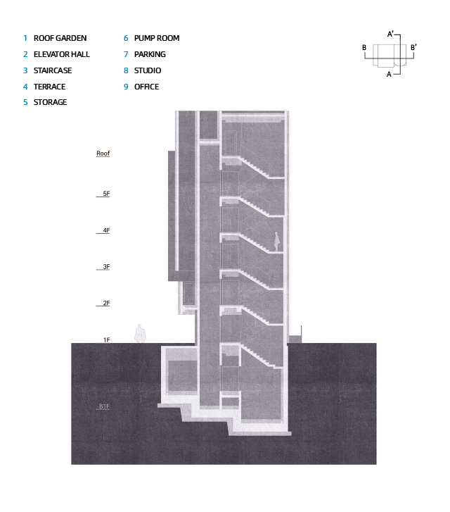 특히 현장에서 깨트린 반파 벽돌은 그 단면이 불규칙하여 건축물이 빛을 받는 시간에 따라 다양한 형상의 그림자가 건축물의 이미지를 변화시킨다. 지하 1층은 사진 스튜디오나 연습실로 사용될 것을 고려하여 전용 공간 내부에 계단을 두고 지상층에 비해 높은 층고를 확보했다. 1층은 매스를 뒤로 물러나게 하여 개방감을 부여하고 주 출입구 역할을 하는 작은 홀을 계획했다. 2층부터 5층까지는 엘리베이터와 계단실로 구성된 코어를 중심으로 전용 공간과 공용 공간을 분리하여 쾌적하고 편안한 사무 공간을 만들었다. 2층과 3층은 외부 테라스를, 옥상에는 정원을 조성하여 바쁜 일상과 업무 속에서 휴식할 수 있다.