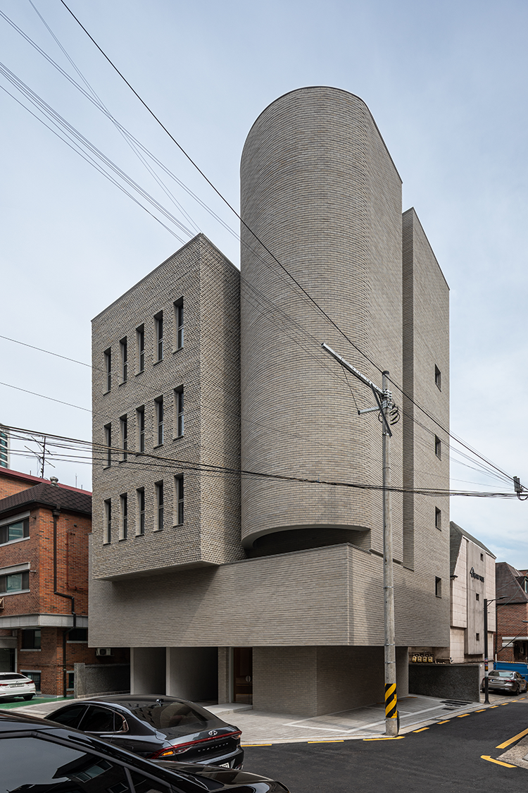 보행자의 시선과 가까운 1층 필로티 벽체는 노출 콘크리트 마감으로 회색 벽돌 파사드와 연속된다. 사선 형태의 대지 경계부에는 2층에서 옥탑 층까지 연속되는 곡면의 외피를 사용해 부드럽고 유연한 모습의 길모퉁이를 만들었다. 조적 공사는 하나의 벽돌로 두 가지의 쌓는 방식을 선택했다. 공장에서 생산된 표준 크기의 매끈한 벽돌을 쌓는 방식과 현장에서 조적공들이 표준 크기의 벽돌을 반파해 불규칙하고 서로 다른 요철 모양의 벽돌을 쌓는 방식이다.