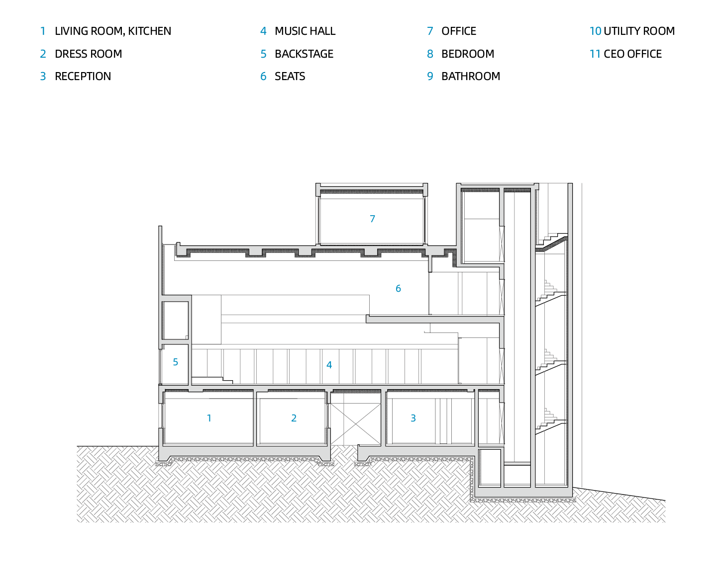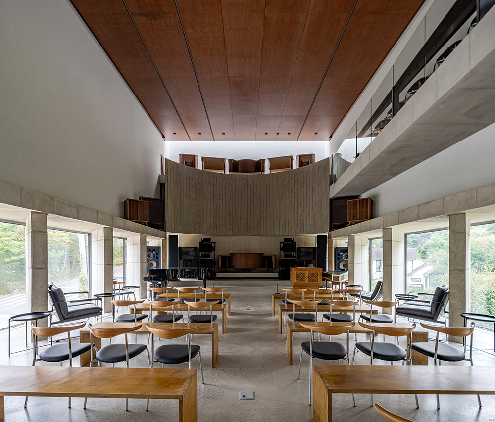 음악당을 들어오면 가장 먼저 보이는 것은 스피커와 그 위의 거대한 송판 무늬 노출 콘크리트 벽체다. 음악당의 벽체는 아름다운 곡선 형태의 스피커처럼 곡선 형태로 만들어진 디자인 요소이자 객석에 소리를 고르게 전달하는 역할을 한다. 내부는 7.5m의 높은 천장고를 가지고 있으며, 사선으로 배치된 기둥 사이로 길게 뻗은 유리창을 통해 다양한 빛의 모습을 볼 수 있다. 사선 기둥은 건물의 삼면에 모두 창호를 사용할 수 있도록 구조적으로 건물을 지지하며, 동시에 소리를 적절하게 반사하여 풍부한 음향을 경험할 수 있는 공간을 만드는 역할을 한다. 내부에서 파생된 사선 기둥은 외부로 확장되며 디자인적인 통일성을 부여한다. 이러한 공간 요소들은 사용자가 쉼과 명상을 통해 내면의 소리를 마주할 수 있는 특별한 공간을 만든다.