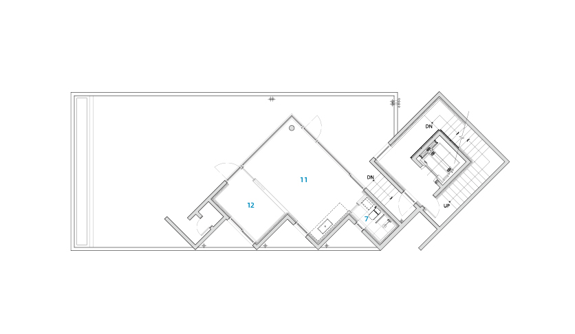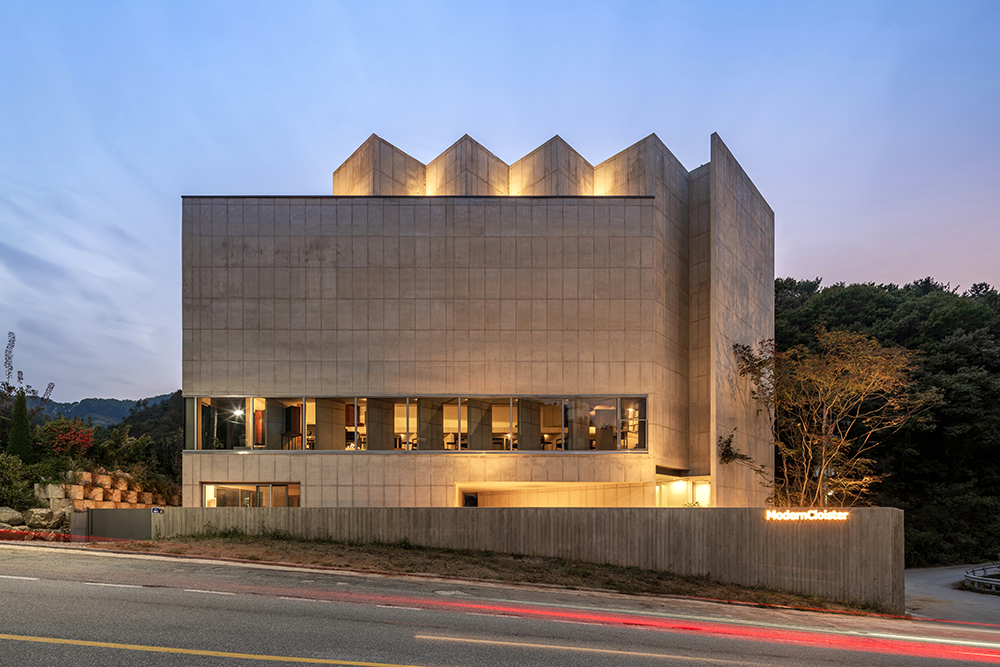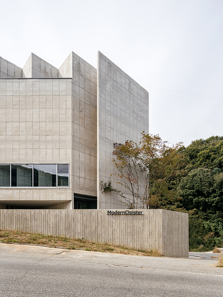 곧게 뻗은 직육면체의 매스와 최상층의 독특한 사선 벽체는 건물의 용도와 구조적 기능에 대한 궁금증을 불러일으키며 시선을 자연스럽게 사로잡는다. 모던클로이스터는 클래식 음악을 전공하고 오랜 기간 음악에 대한 이상적인 공간을 고민해 온 건축주를 위한 공간이다.