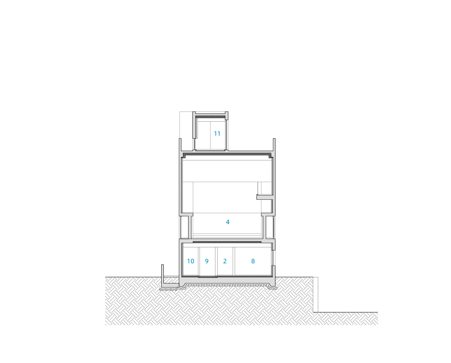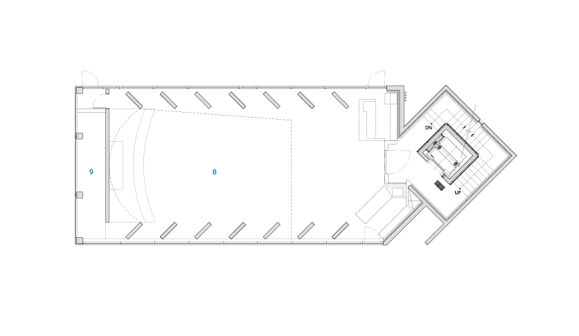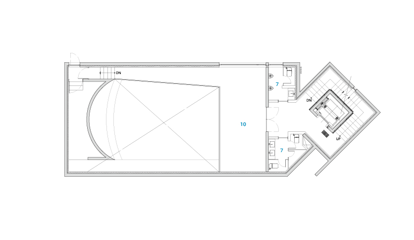 곧게 뻗은 직육면체의 매스와 최상층의 독특한 사선 벽체는 건물의 용도와 구조적 기능에 대한 궁금증을 불러일으키며 시선을 자연스럽게 사로잡는다. 모던클로이스터는 클래식 음악을 전공하고 오랜 기간 음악에 대한 이상적인 공간을 고민해 온 건축주를 위한 공간이다.