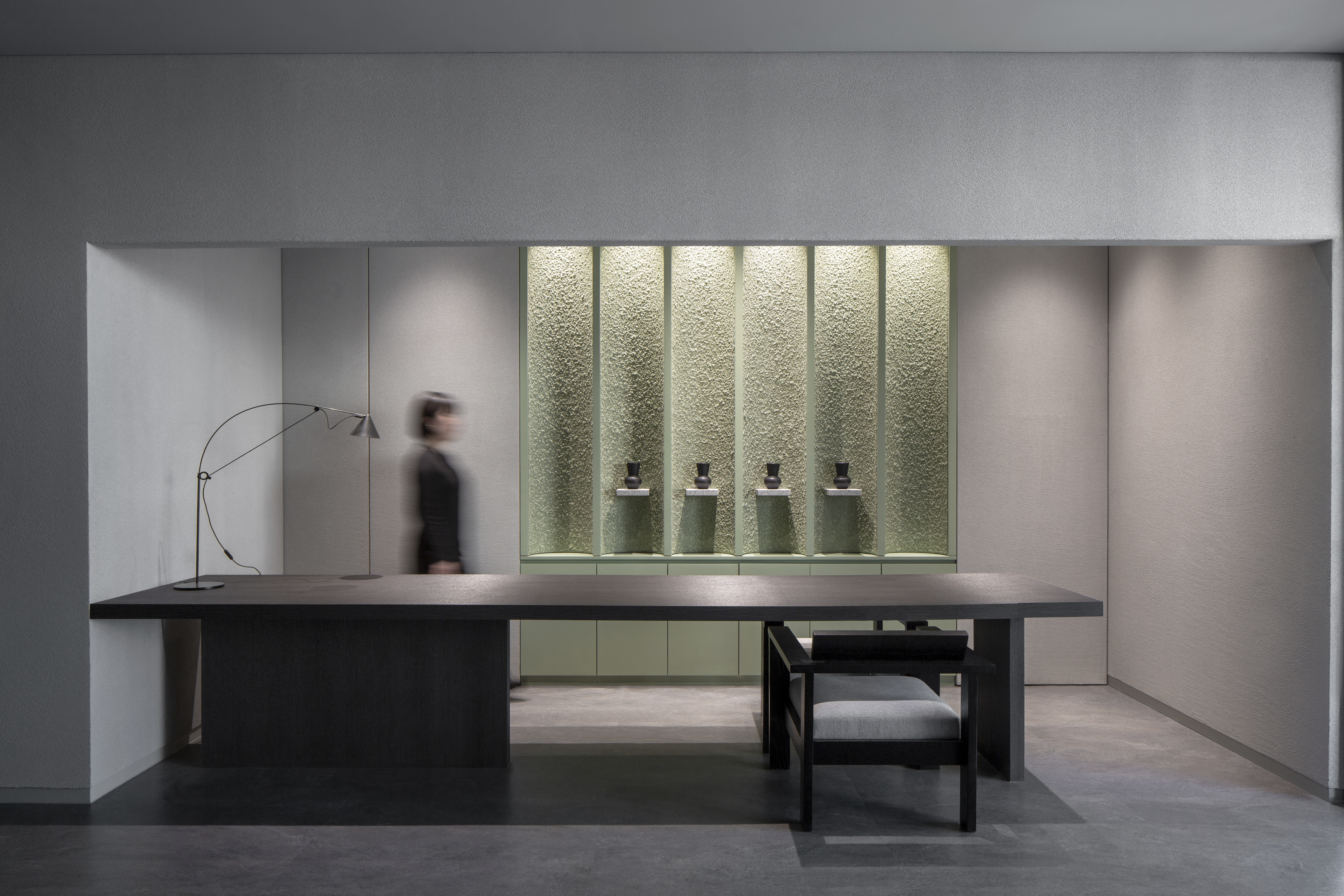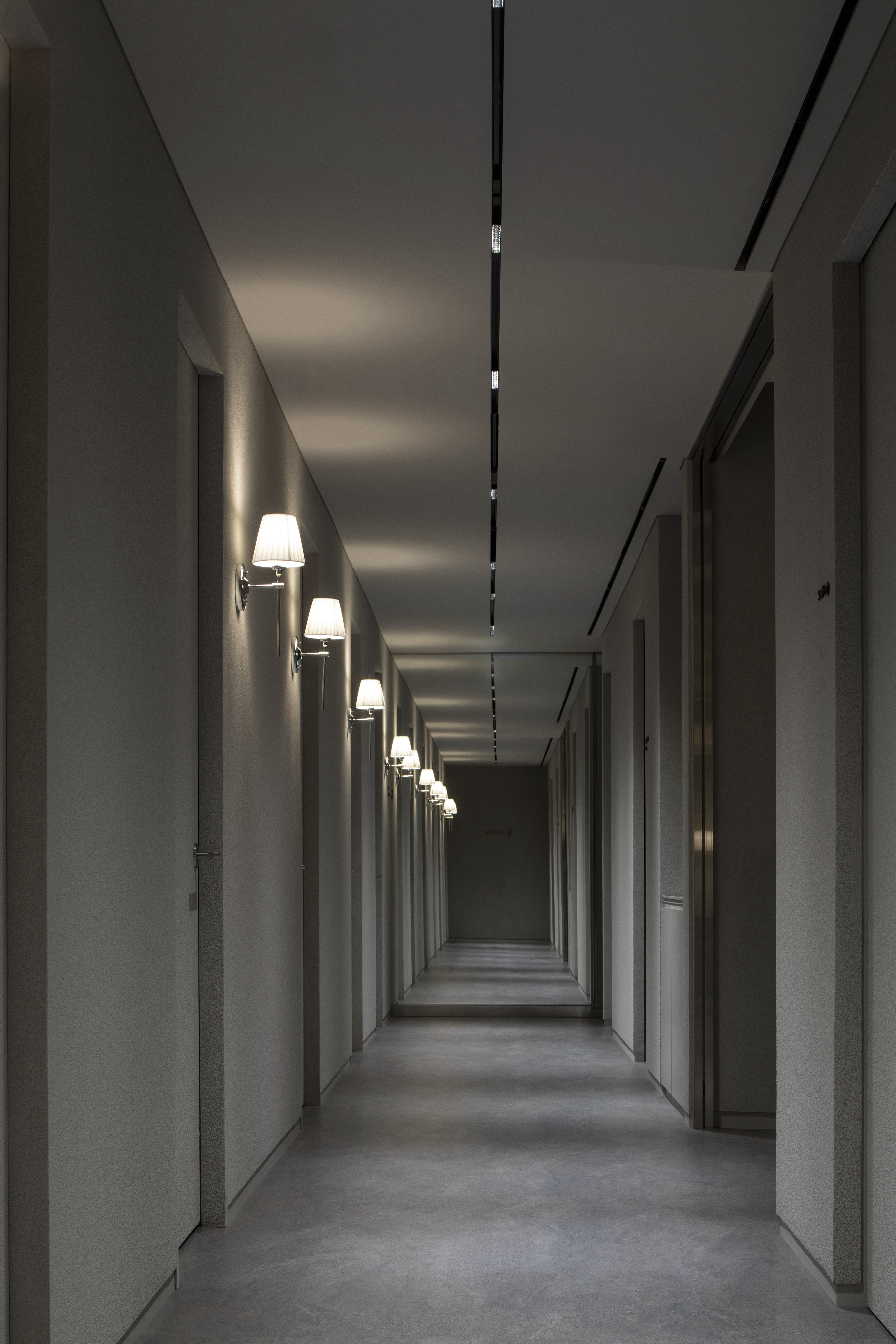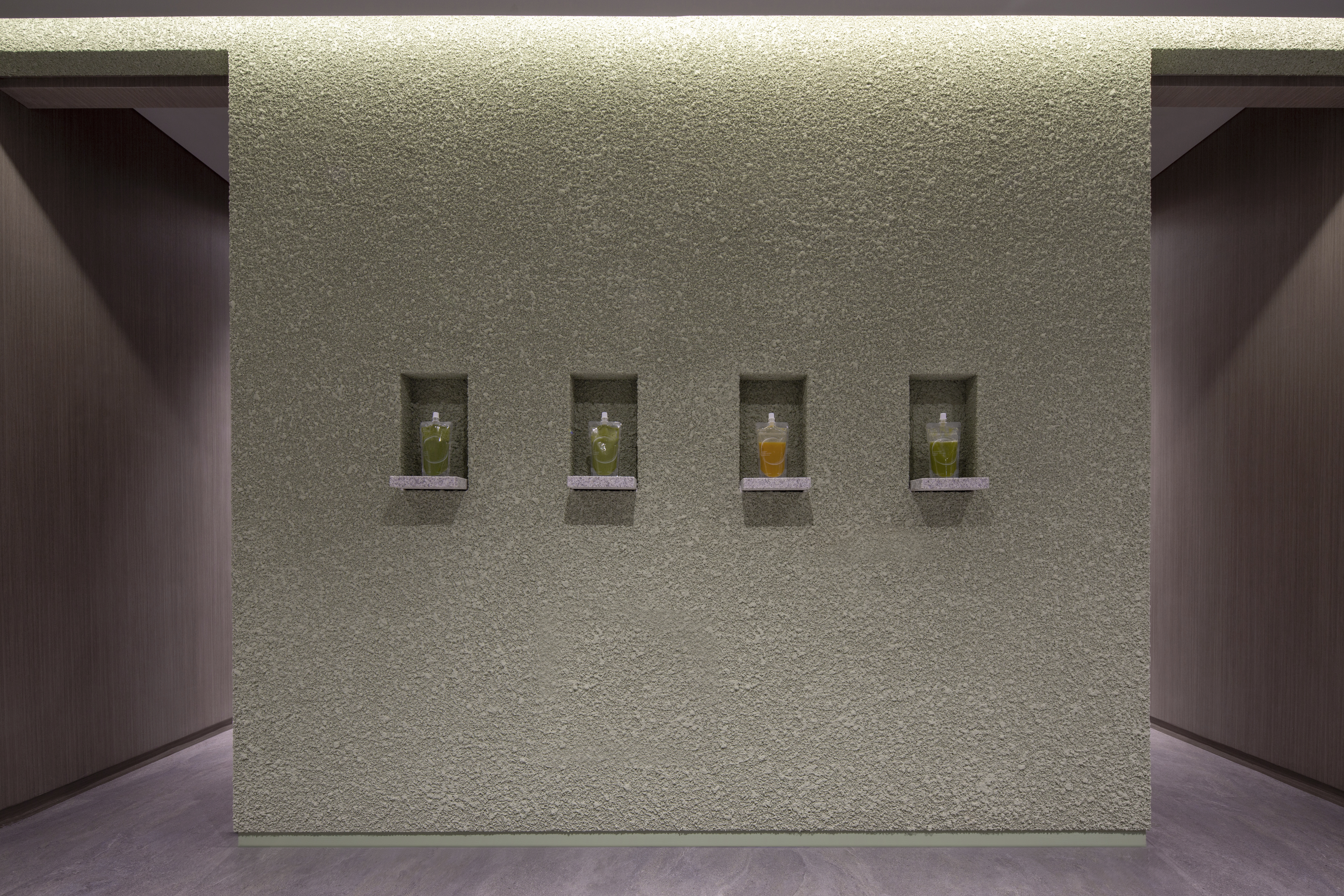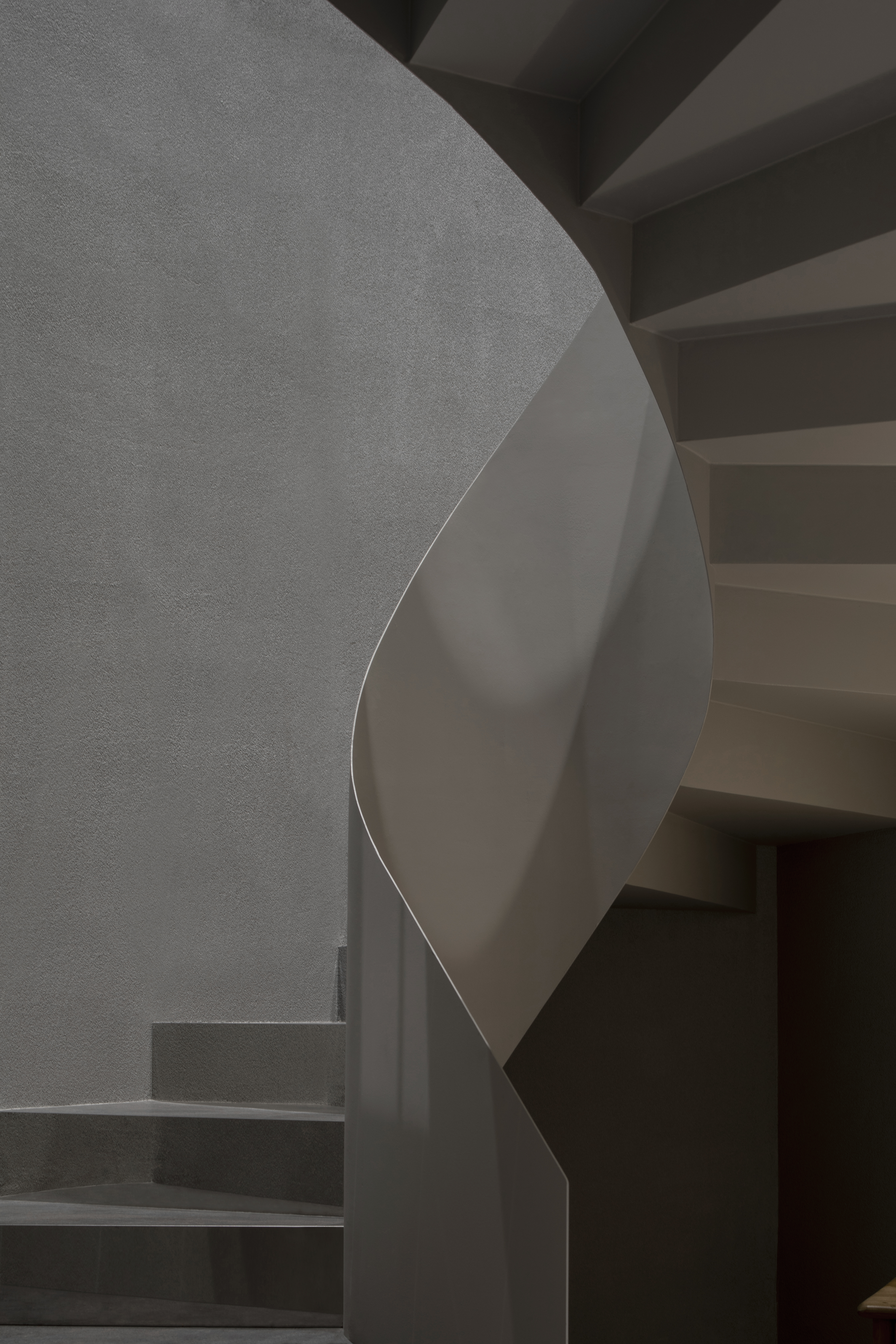나선형으로 이어지는 계단을 따라 내려가면 은은하고 짙은 색을 띄는 끝이 불분명한 복도를 마주한다. 그 너머 간극의 공간은 순수한 형태의 전이공간으로서 고요함으로 치유에 몰입하게 한다. 낮은 수평으로 뻗어진 가로선과 섬세하게 세로로 뻗어진 금속 축은 기능을 넘어 그 자체로의 형태를 공간에 새겼다.