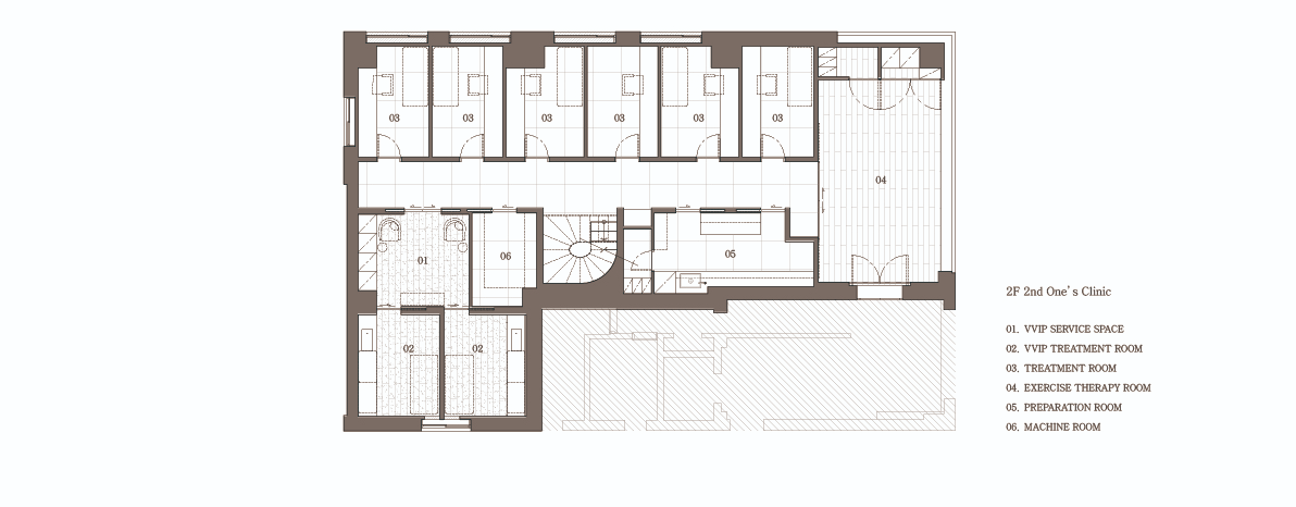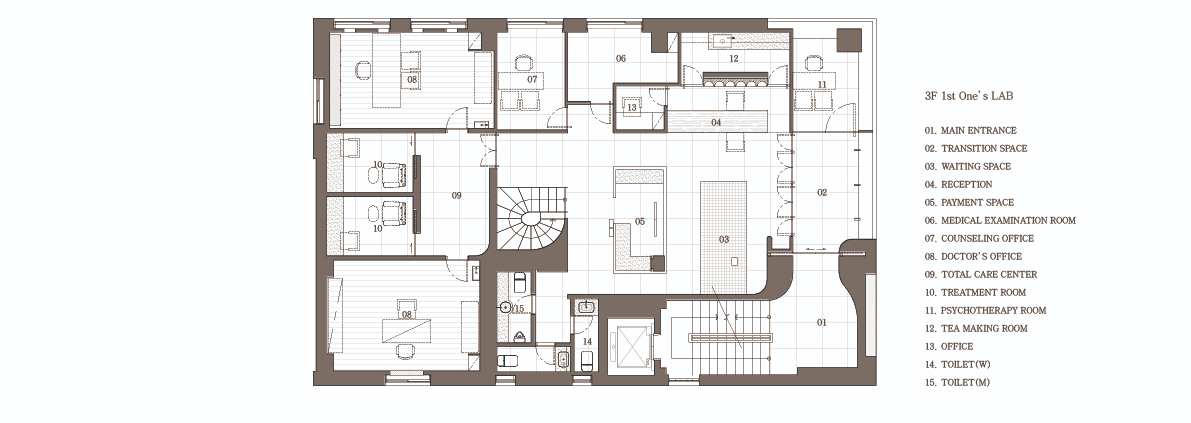 환자와의 소통을 통해 치유의 본질에 다가가고자 하는 One’s Clinic은 스스로 회복이 가능하도록 질병을 넘어 라이프 스타일을 관리하는 주치의의 철학을 지향하는 가정의원이다. 이곳을 찾아오는 모두를 귀하게 대접하고 싶다는 주치의의 말을 시작으로 치료의 진정한 목적에 대한 그들의 사유 지점을 연결하여 치유의 순수성 속 One’s Clinic의 정체성을 공간에 담아내고자 했다.