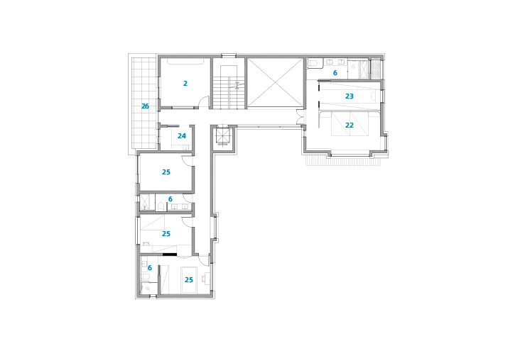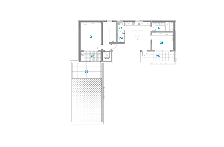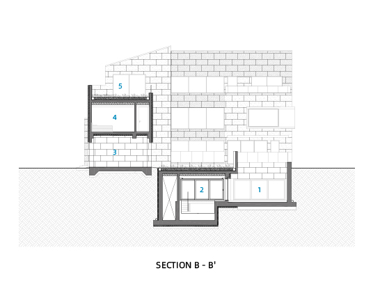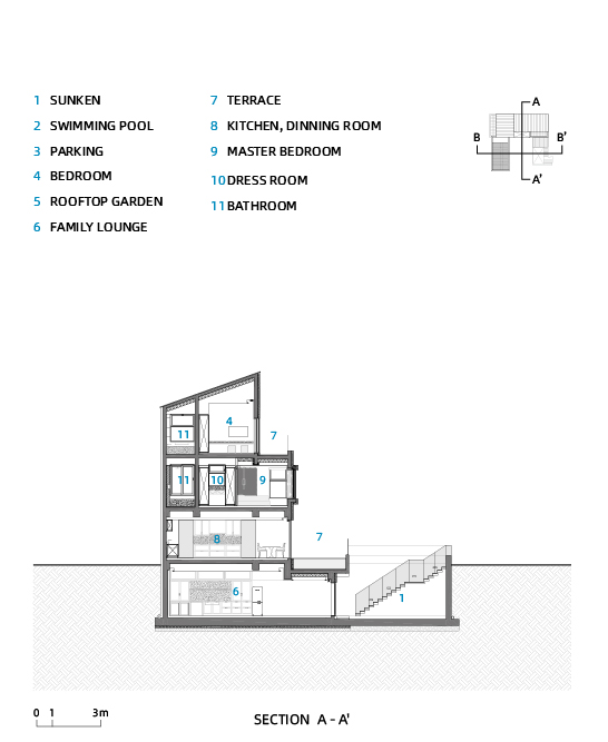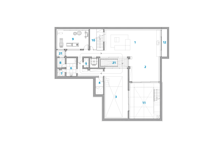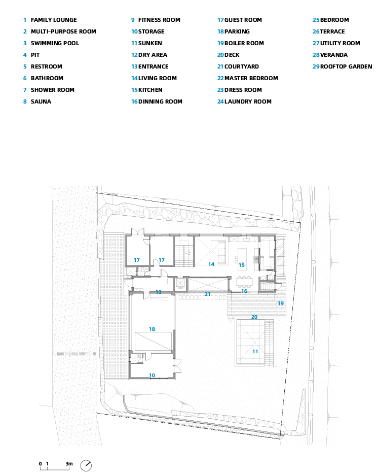 지하층은 가족을 위한 프라이빗한 휴식 영역으로 일상의 스트레스를 해소할 수 있는 공간이 마련되어 있다. 썬큰을 중심으로 피트니스실, 수영장, 사우나, 시청각 시설 등의 여가 생활 공간이 있으며, 스파 영역과 다른 취미영역이 자연스럽게 구분되어 있다. 열린 썬큰 공간은 지하층의 채광과 환기를 통해 쾌적함을 더하고 각 공간에서 자연을 느낄 수 있게 한다.