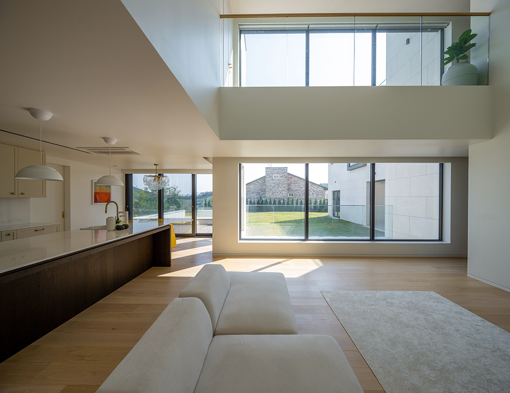거실은 상부 오픈형으로 중정을 통해 2층 및 지하와 연결된다. 앞마당을 향해 큰 유리 통창이 있고, 뒷마당을 향한 하부 띠 창이 앞, 뒷마당을 다른 시각으로 조망한다.