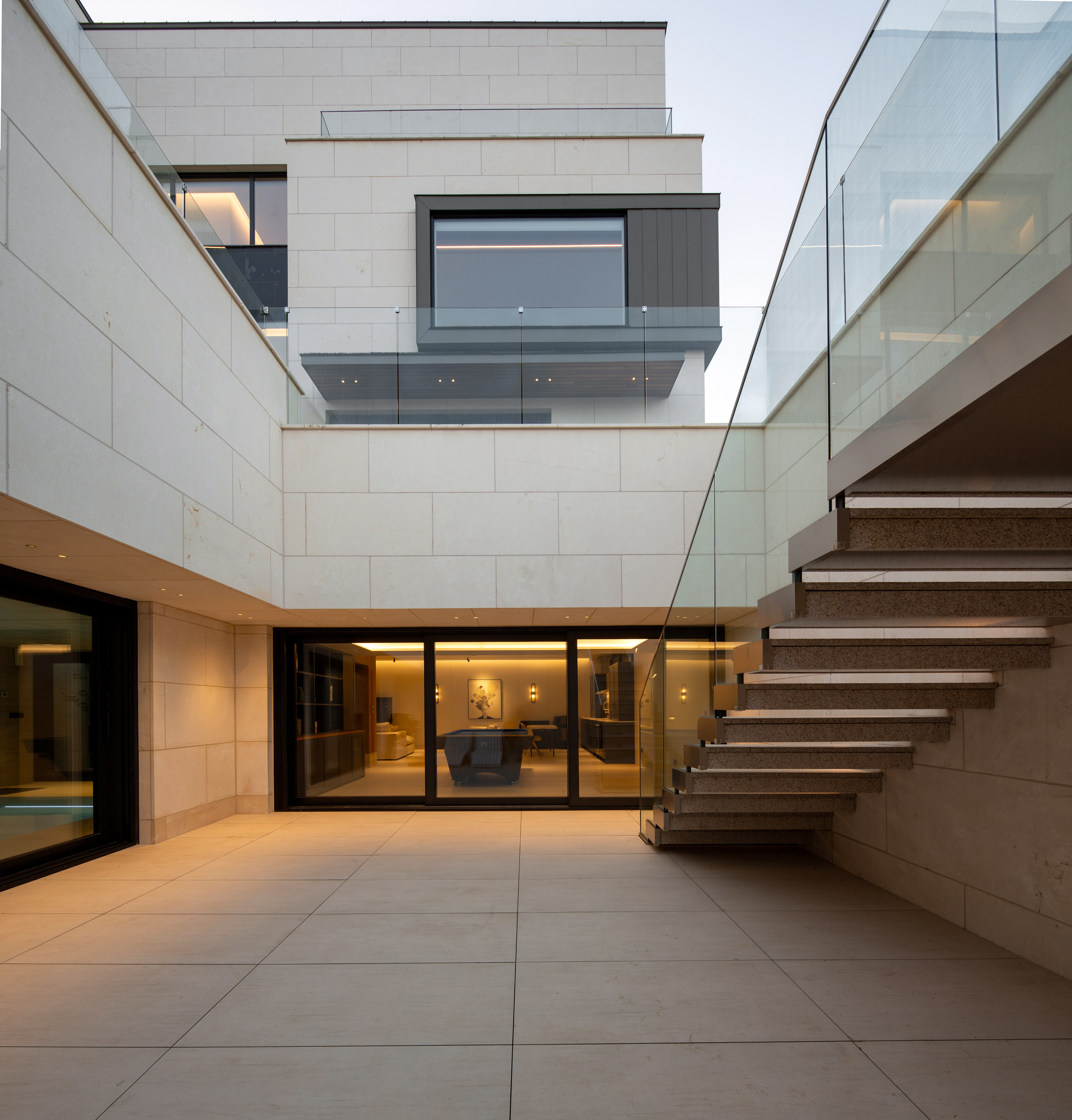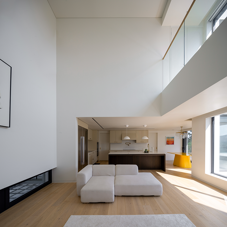 거실은 상부 오픈형으로 중정을 통해 2층 및 지하와 연결된다. 앞마당을 향해 큰 유리 통창이 있고, 뒷마당을 향한 하부 띠 창이 앞, 뒷마당을 다른 시각으로 조망한다.