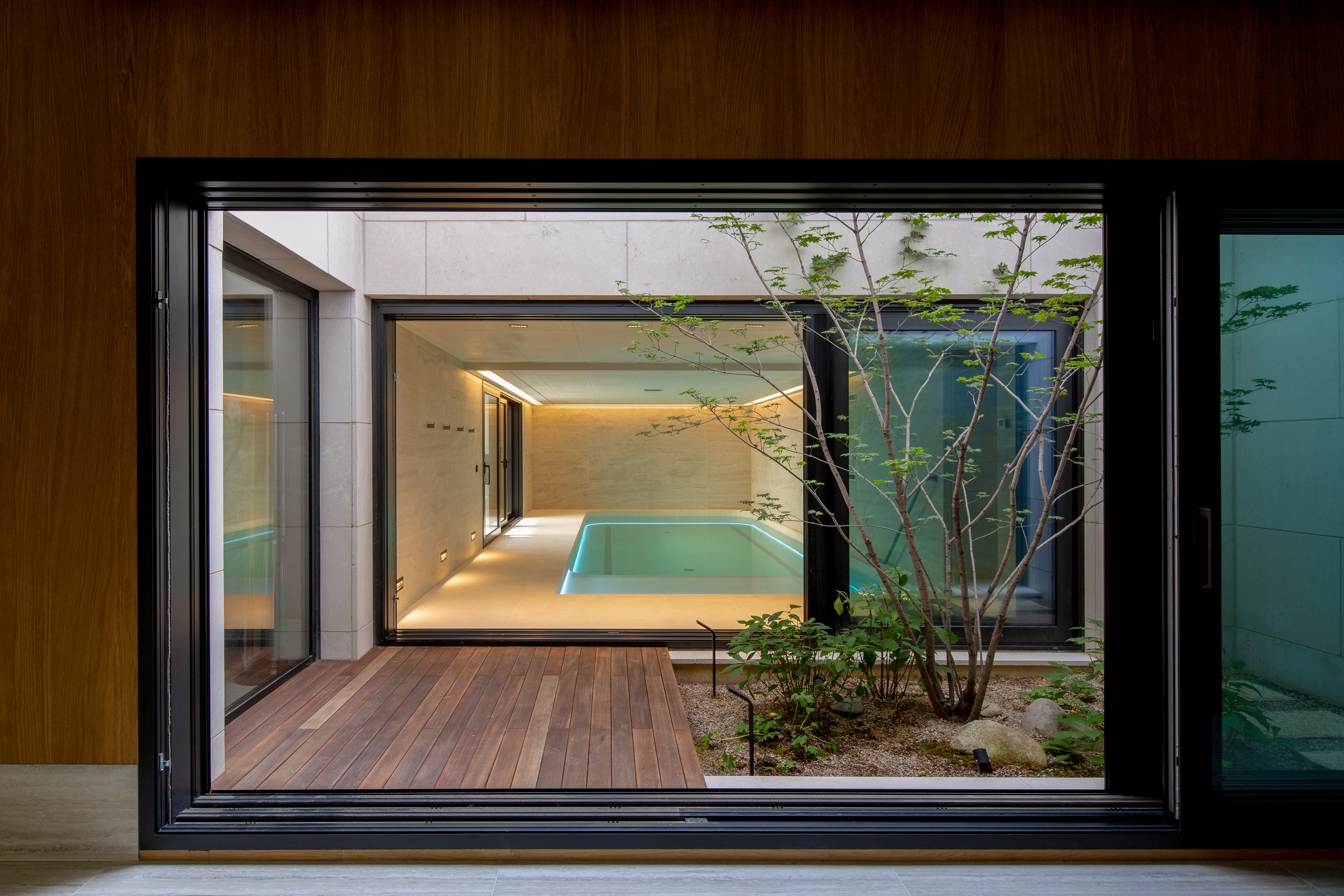 지하층은 가족을 위한 프라이빗한 휴식 영역으로 일상의 스트레스를 해소할 수 있는 공간이 마련되어 있다. 썬큰을 중심으로 피트니스실, 수영장, 사우나, 시청각 시설 등의 여가 생활 공간이 있으며, 스파 영역과 다른 취미영역이 자연스럽게 구분되어 있다. 열린 썬큰 공간은 지하층의 채광과 환기를 통해 쾌적함을 더하고 각 공간에서 자연을 느낄 수 있게 한다.