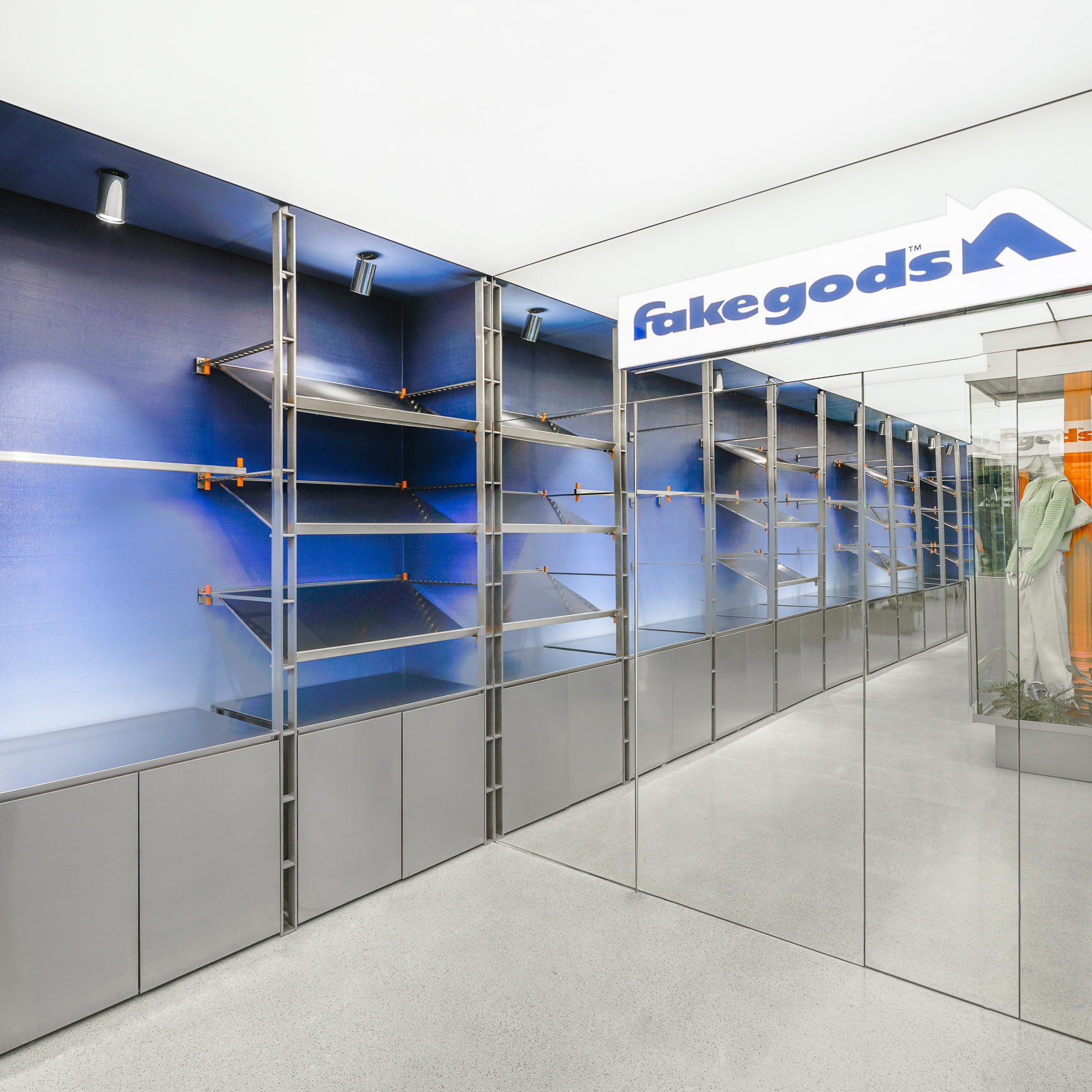 Fake Gods 플래그십 스토어의 디자인은 에덴동산에 관한 성경 이야기를 현대적으로 재해석하는 데서 출발했다. 유리 진열장 안에 있는 마네킹은 공간의 핵심 요소로 전시물처럼 배치되었다. 진열장은 식물로 둘러싸여 제한된 낙원을 연상시키며 공간을 박물관 같은 분위기로 만든다. 내부에는 활기찬 오렌지 톤의 기둥이 캡슐들을 지지할 뿐만 아니라 아크릴과 스테인리스 스틸 같은 주요 재료들과 역동적인 대비를 이룬다. 아크릴 파사드는 브랜드의 백라이트 로고로 강조된다. 오픈된 쇼윈도에서는 돌과 식물로 구성된 정원 위에 마네킹을 두어서 현대적 낙원으로 들어오고 싶게 만드는 유혹적인 장면을 연출한다.