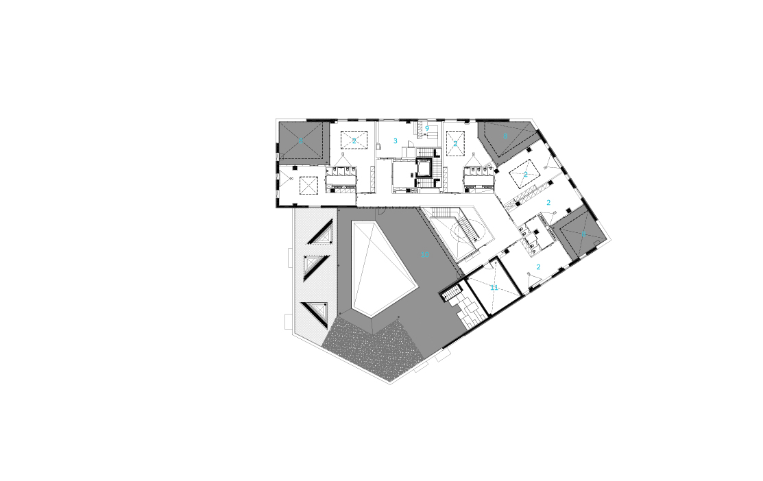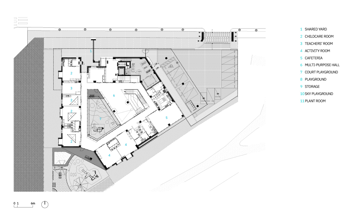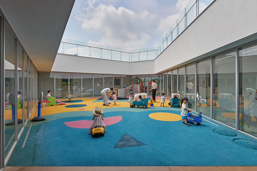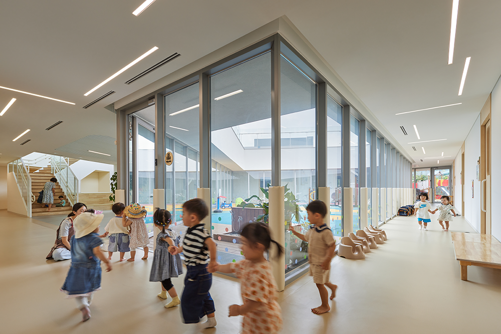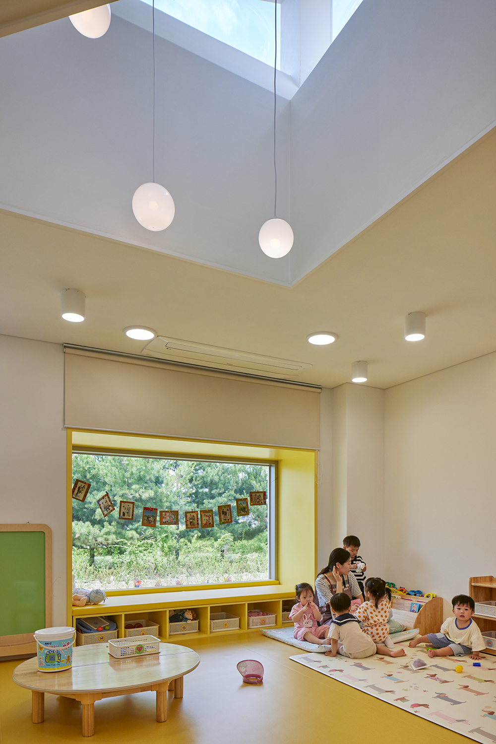 건물 곳곳에는 다양한 높이와 형태의 창이 있어 아이들이 각기 다른 풍경과 시간에 따라 변화하는 그림자의 움직임을 느낄 수 있다. 공용 공간에는 천창과 테라스, 중정을 배치해 실내로 충분한 자연 채광이 유입된다. 더불어 건물의 에너지 효율성을 높이기 위해 사선 형태의 태양광 패널과 더운 공기를 효율적으로 배출할 수 있는 천창을 설치했다.