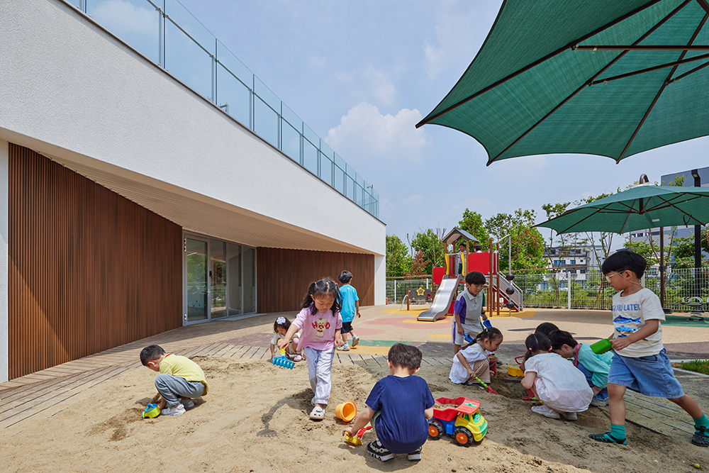 1층의 유아용 놀이터와 2층의 넓은 테라스는 장지천 방향으로 열려 있어 어린이들이 자연을 가까이에서 느끼며 뛰어놀 수 있는 공간이다. 유아반은 야외 놀이 공간에서 또래와 함께 빗소리를 듣고 눈사람을 만들며 작은 텃밭을 가꾸는 등 자연과 함께하는 경험을 할 수 있다. 반면, 영아반은 안전을 고려하여 야외 놀이 공간을 이용하는 대신 아늑한 중정 놀이터를 이용할 수 있다.