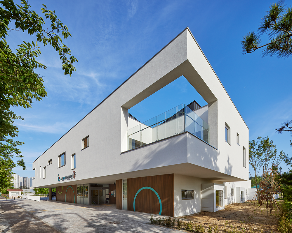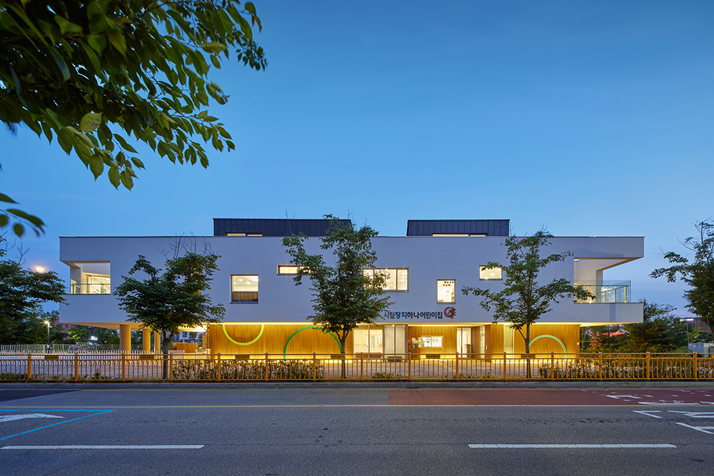 시립장지하나어린이집은 대지경계선에서 건축선을 3m 후퇴하여 계획된 프로젝트다. 건축가는 후퇴한 대지에 필로티 구조를 더해 넓은 어린이집 앞마당을 구성했다. 이 공간은 자전거를 타는 아이들, 유모차를 끌며 아이를 기다리는 학부모 등 지역 주민들이 자연스럽게 모이는 소통의 장소로 활용되고 있다. 입구에서 가장 먼저 마주하는 다목적 홀은 도서관, 체육관, 영화관, 소강당 등 다양한 용도로 활용이 가능하며 어린이들의 행동에 따라 용도가 정해진다. 시립장지하나어린이집은 장지천 변을 따라 조성된 공원과 인접해 있다. 건물의 높이는 공원의 경사 지형에 어울리게 조정되어 공원과 조화를 이룬다. 또한 어린이들의 놀이 환경도 자연과 연결된다.
