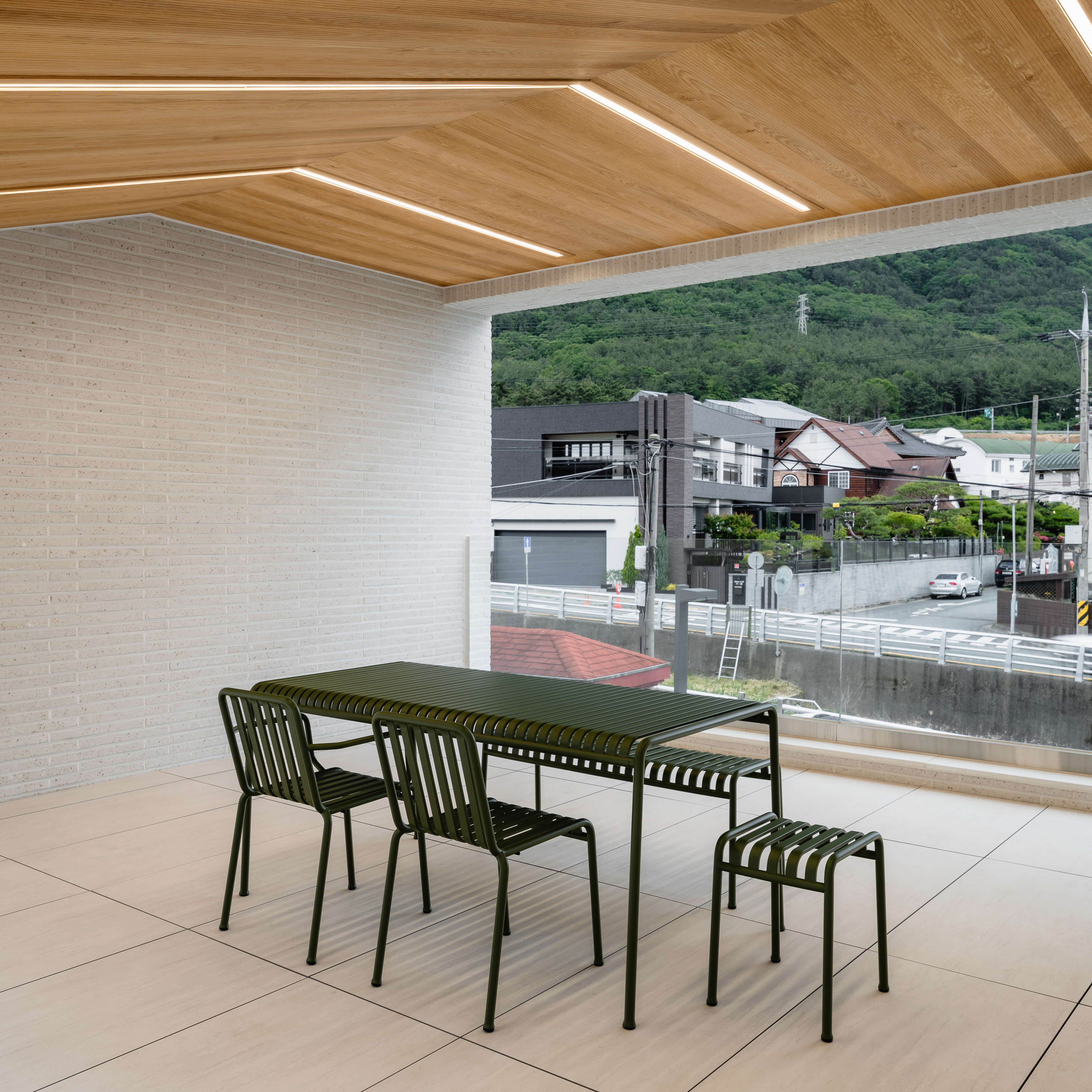 2층의 가족실은 미니 홈 바와 테라스를 연계하여 활용도를 높였다. 1층의 면적 차이에 의해 생긴 2층의 공간은 야외 테라스가 되었다. 건축주의 프라이버시를 보장하기 위해 마당 대신 2층에 넓은 테라스를 마련했는데, 지구단위계획 지침상 경사 지붕 면적이 필요하여 평지붕인 테라스에 사선 지붕을 씌우는 방안을 고안했다. 2층 테라스의 지붕은 실내로 조망을 최대한 끌어들이면서 바깥으로 열린 형태로 계획되어 풍경을 담는 프레임 역할을 한다.