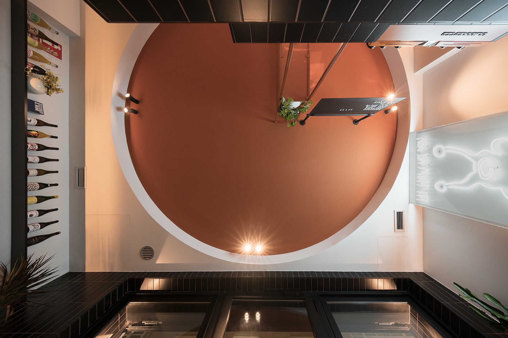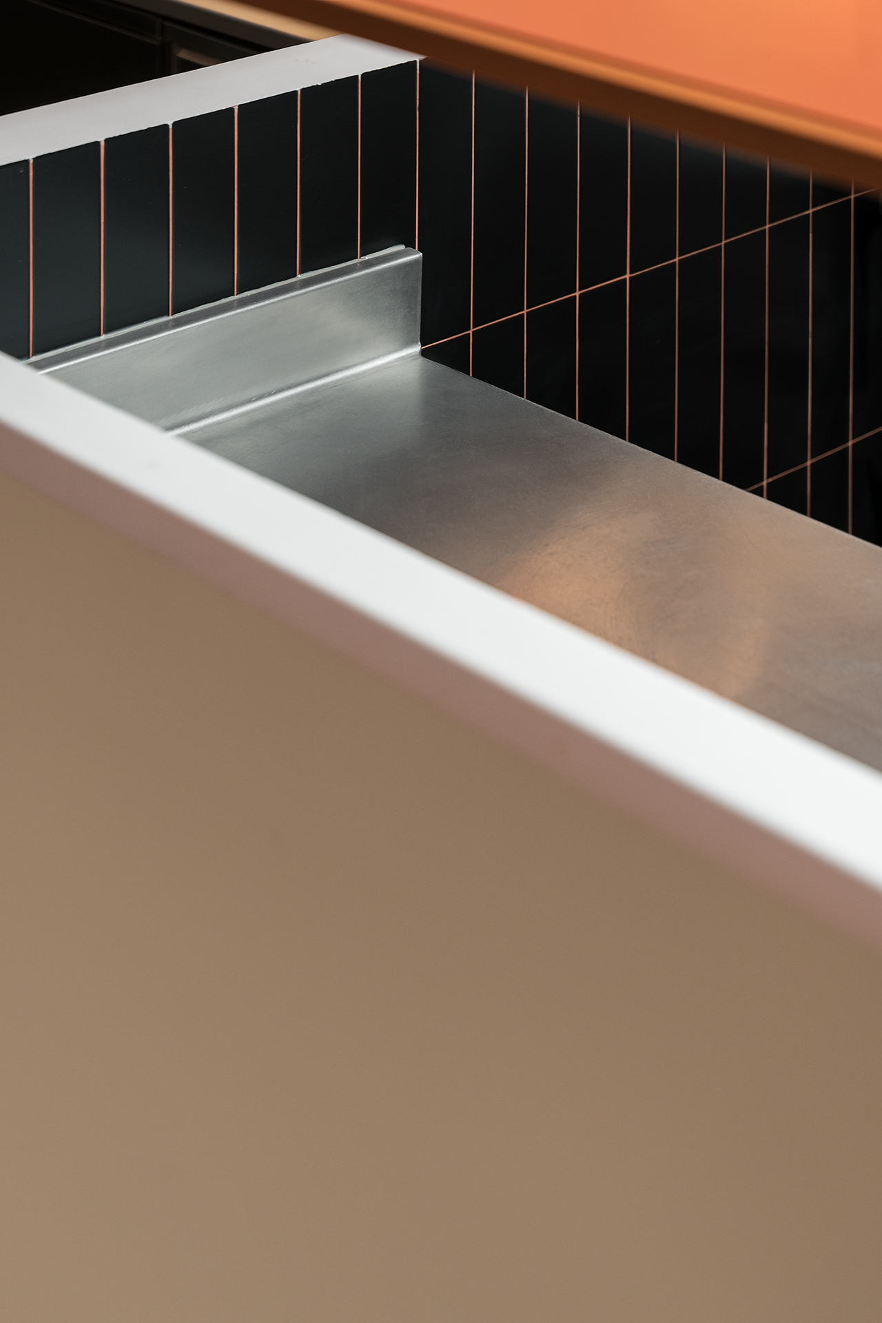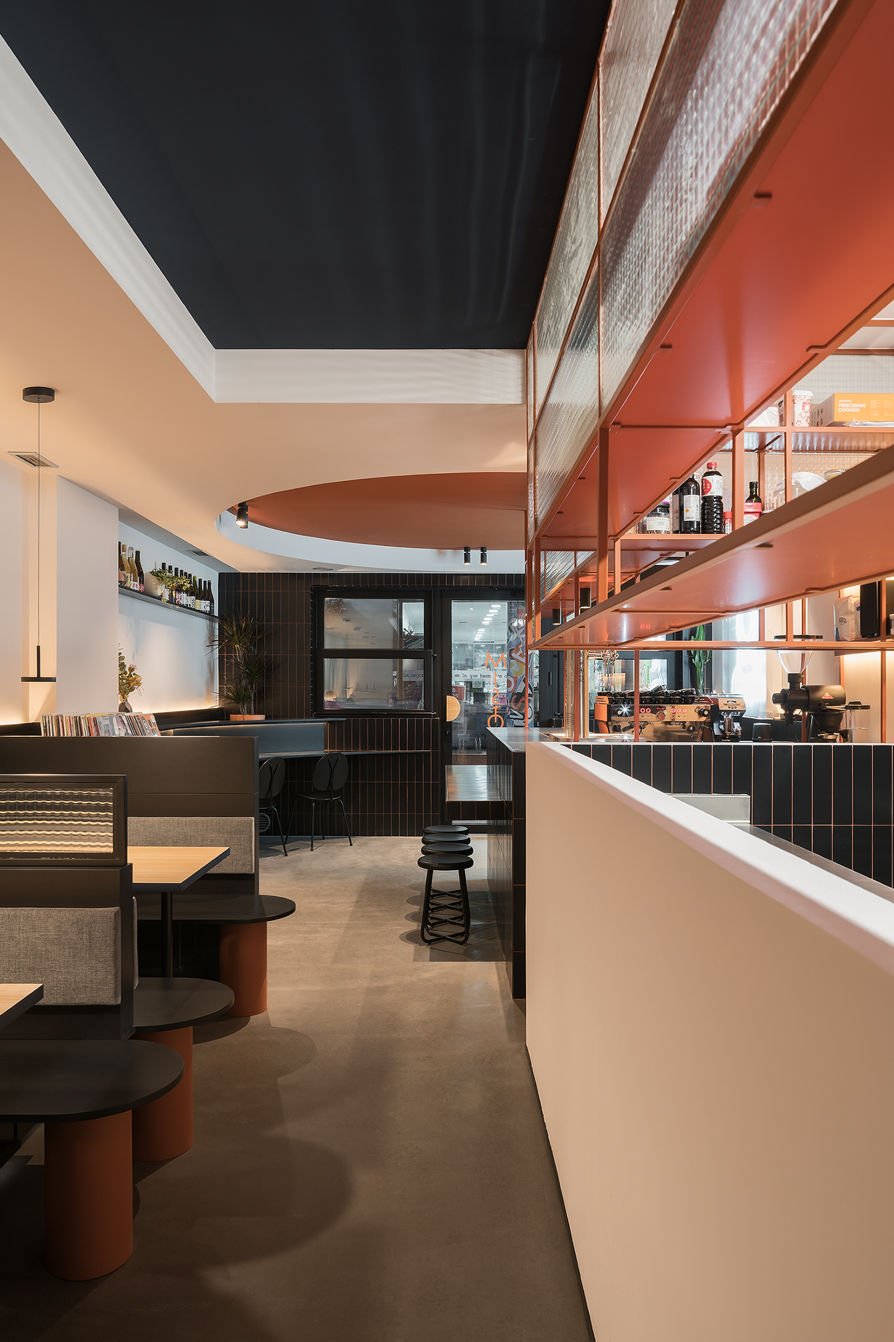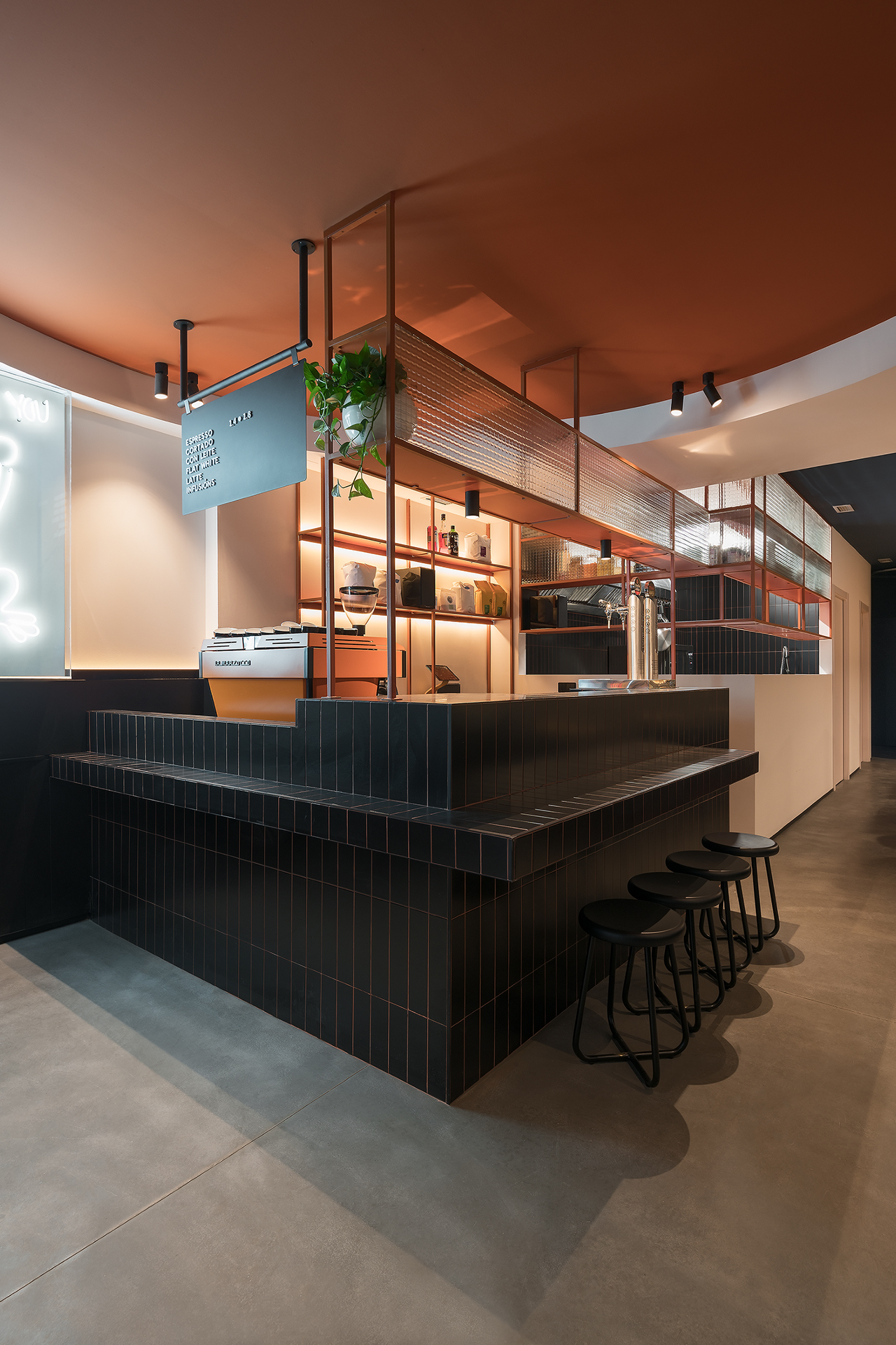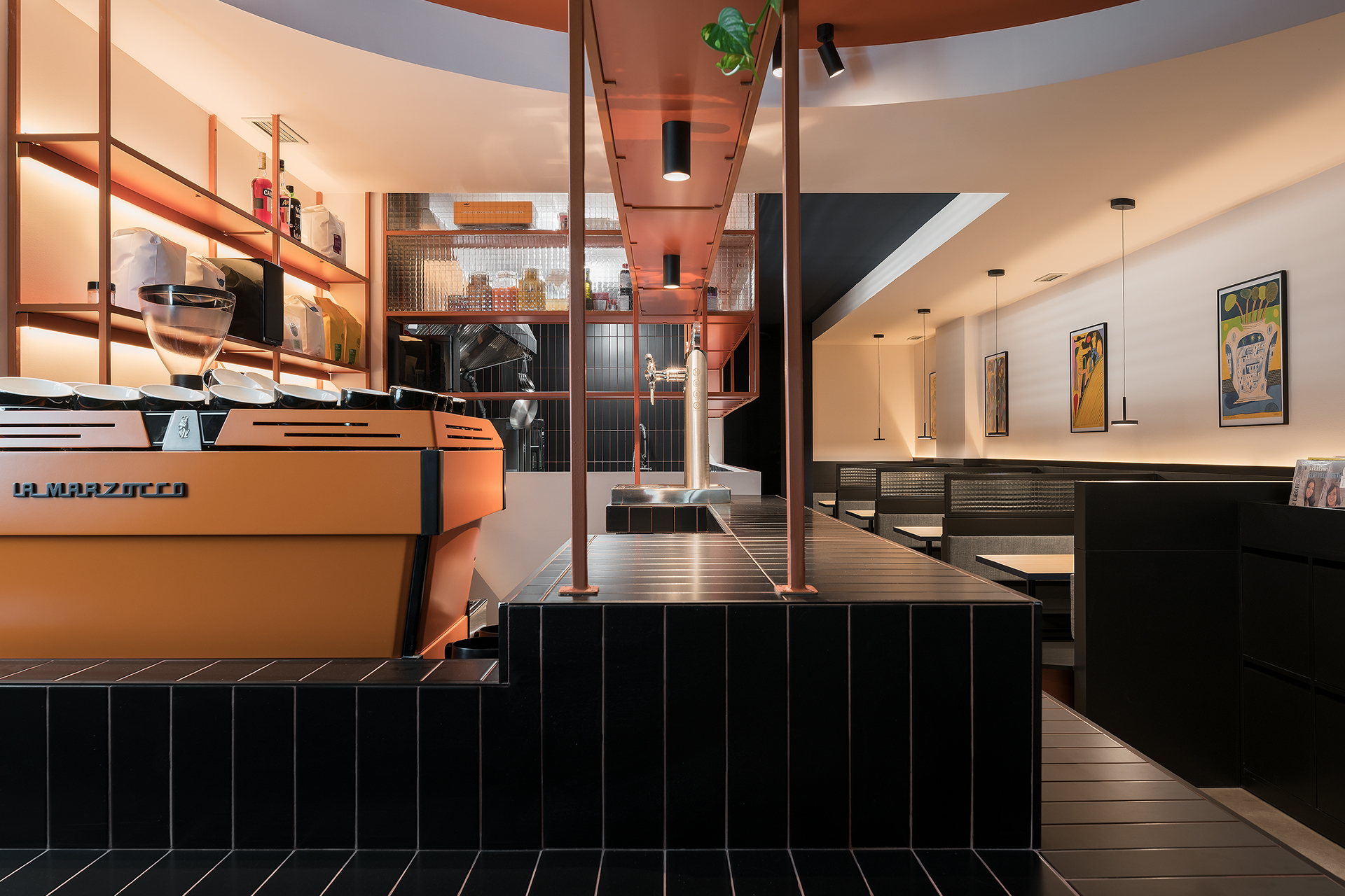 작은 68㎡ 규모의 공간은 현대적이고 대담한 이미지로 구성됐다. 파사드는 주황색 줄눈과 검은색 배경의 세라믹 타일로 강렬한 비주얼을 보여준다. 바닥재는 재료 연속성을 유지하기 위해 레벨링 페이스트를 사용하여 디자인 요소가 돋보이도록 했다. 조명 디자인은 따뜻한 색온도의 조명을 활용해 편안한 분위기를 연출했다. 공간 곳곳에는 심플한 펜던트 램프, 조정 가능한 프로젝터, LED 스트립 등 다채로운 조명 솔루션이 배치되어 각 공간의 특성을 살렸다.