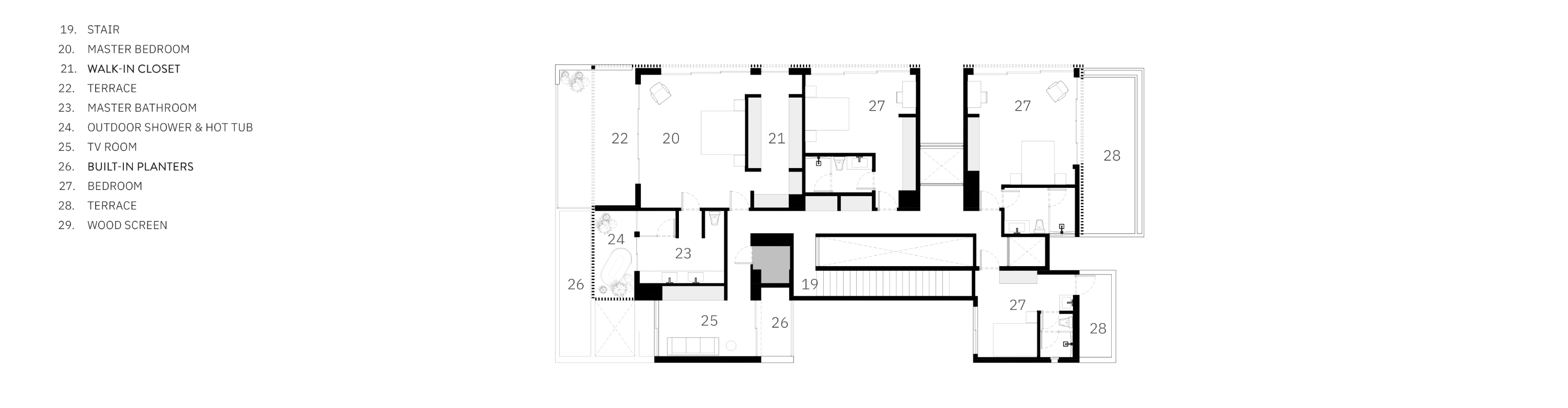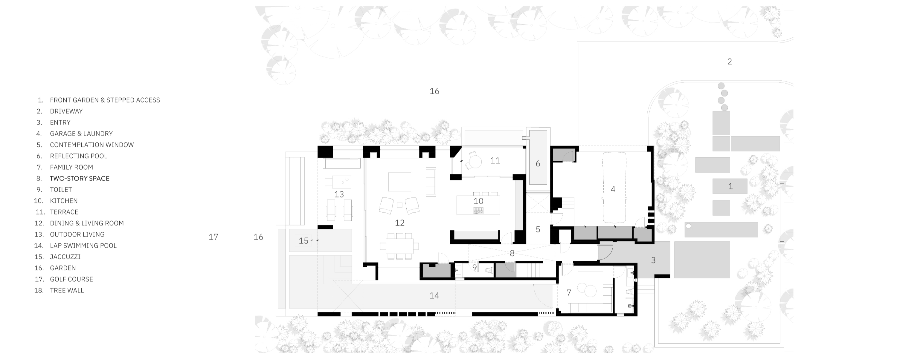 입구 정원은 경사진 잔디밭에 놓여진 디딤석을 따라 가면 현관으로 갈 수 있는 차양을 만날 수 있다. 차양을 통과하면 동선이 전환되며 빛이 조각해낸 일련의 공간들을 발견할 수 있다. 이러한 공간은 북쪽 정원을 향한 프레임 뷰를 제공하며 공용 공간으로 이어진다. 공용공간에는 정원과 그 너머의 골프 코스를 향한 테라스가 있다. 1층 동선은 침실로 이어지는 계단으로 연결되며, 이 과정에서 2층 높이의 공간을 경험하게 된다.