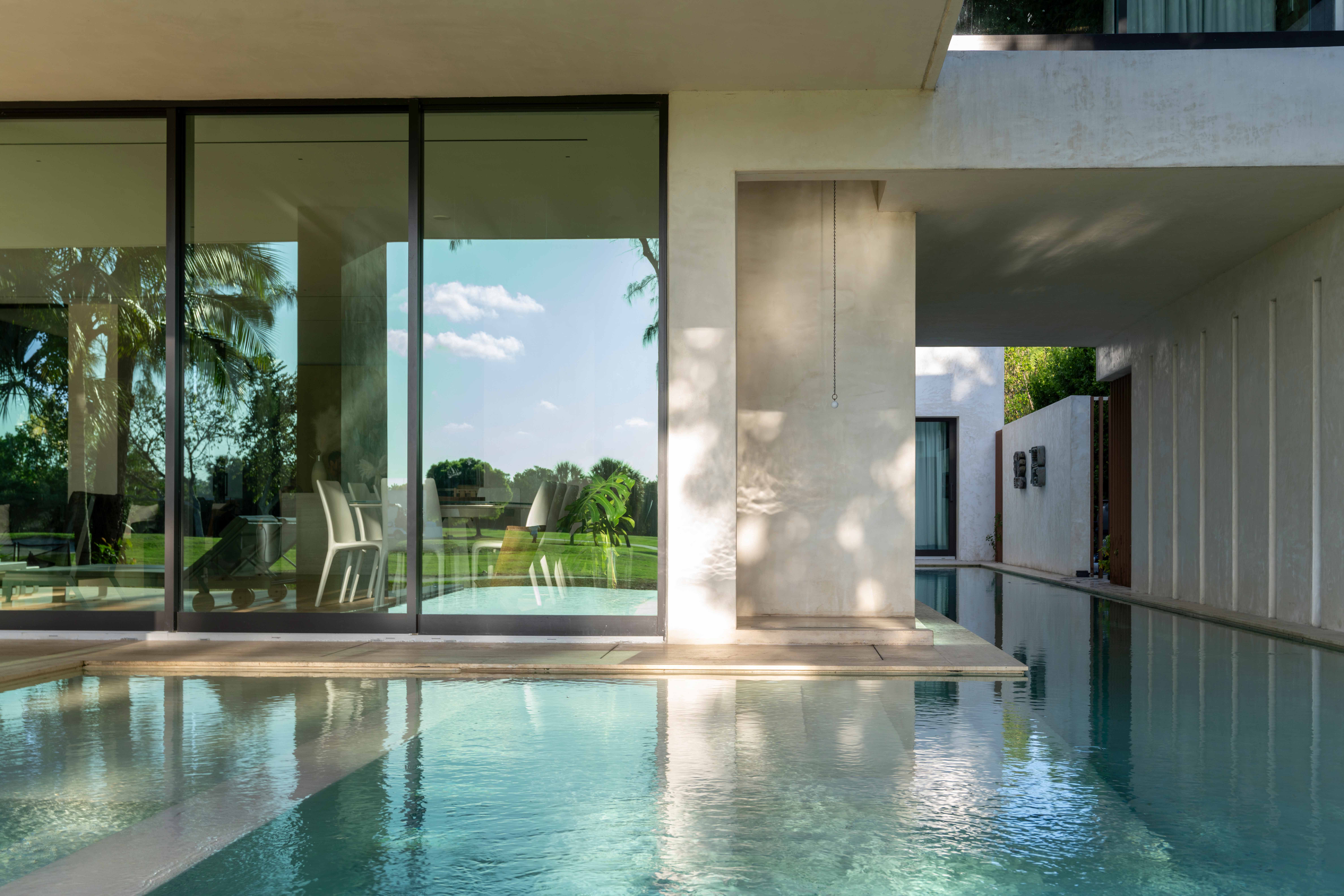 목재 스크린은 나무 그림자와 함께 벽면에 그림자를 드리워 하루 종일 표면이 끊임없이 변화하도록 만들었다. 내부는 대리석과 목재로 마감하여 공간에 따뜻한 분위기를 더했다.