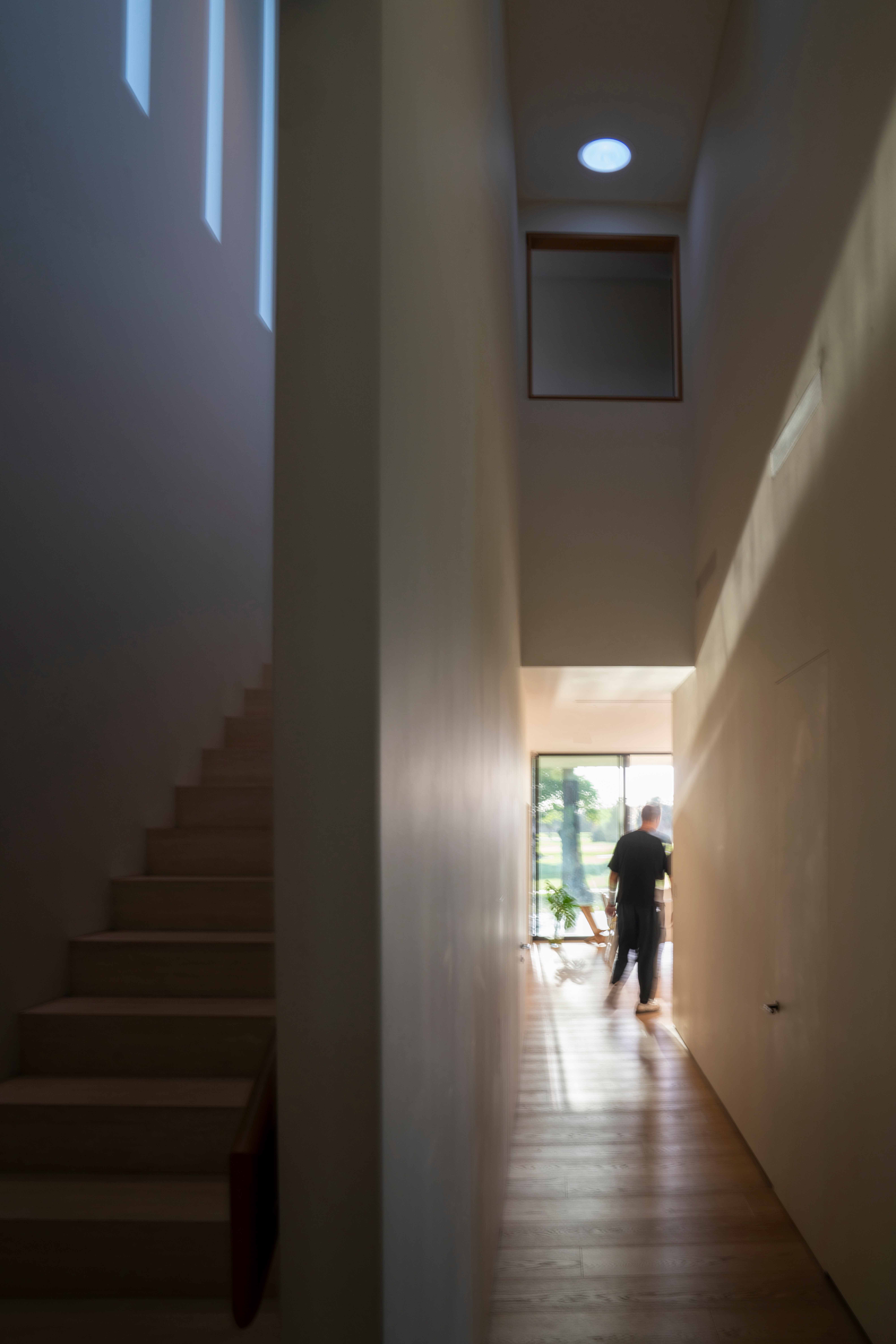 입구 정원은 경사진 잔디밭에 놓여진 디딤석을 따라 가면 현관으로 갈 수 있는 차양을 만날 수 있다. 차양을 통과하면 동선이 전환되며 빛이 조각해낸 일련의 공간들을 발견할 수 있다. 이러한 공간은 북쪽 정원을 향한 프레임 뷰를 제공하며 공용 공간으로 이어진다. 공용공간에는 정원과 그 너머의 골프 코스를 향한 테라스가 있다. 1층 동선은 침실로 이어지는 계단으로 연결되며, 이 과정에서 2층 높이의 공간을 경험하게 된다.