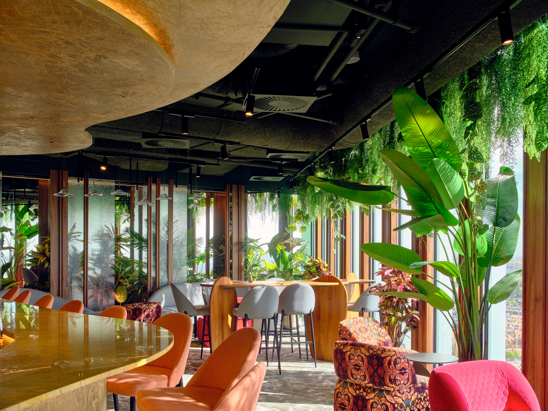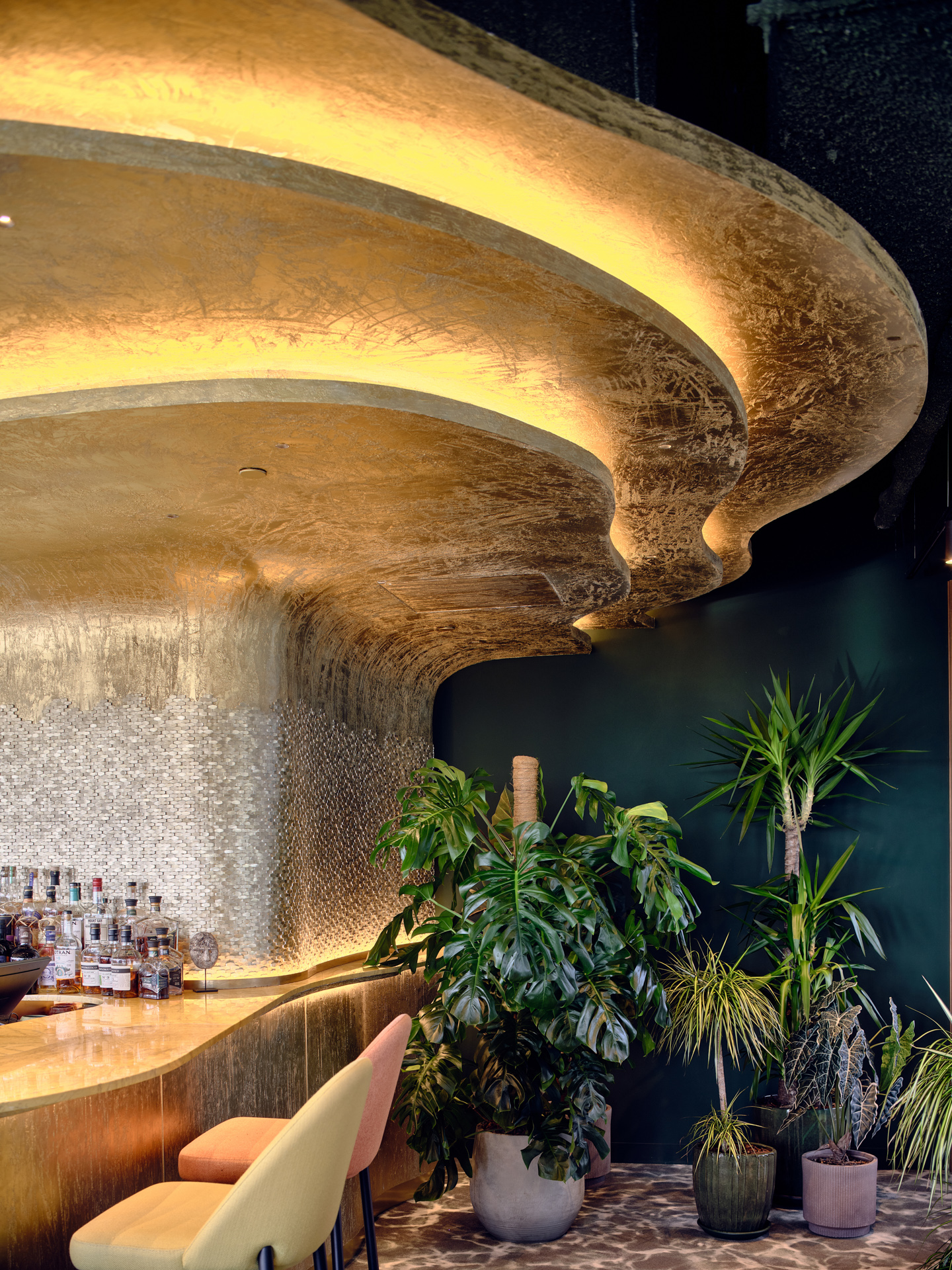 바의 중심에는 황금빛으로 빛나는 구조물이 있다. 천장까지 뻗은 디자인은 마치 고대 해양 생물을 연상시킨다. 공간 전체는 이러한 콘셉트를 더욱 극대화하는 방식으로 꾸며졌다. 녹색 인테리어와 울창한 식물 그리고 패턴이 어우러져 마치 라틴아메리카 정글에 들어온 듯한 분위기를 자아낸다. 반사되는 유리 표면은 흐르는 물의 이미지를 연출하며, 물결무늬 카펫과 자연스럽게 조화를 이룬다.