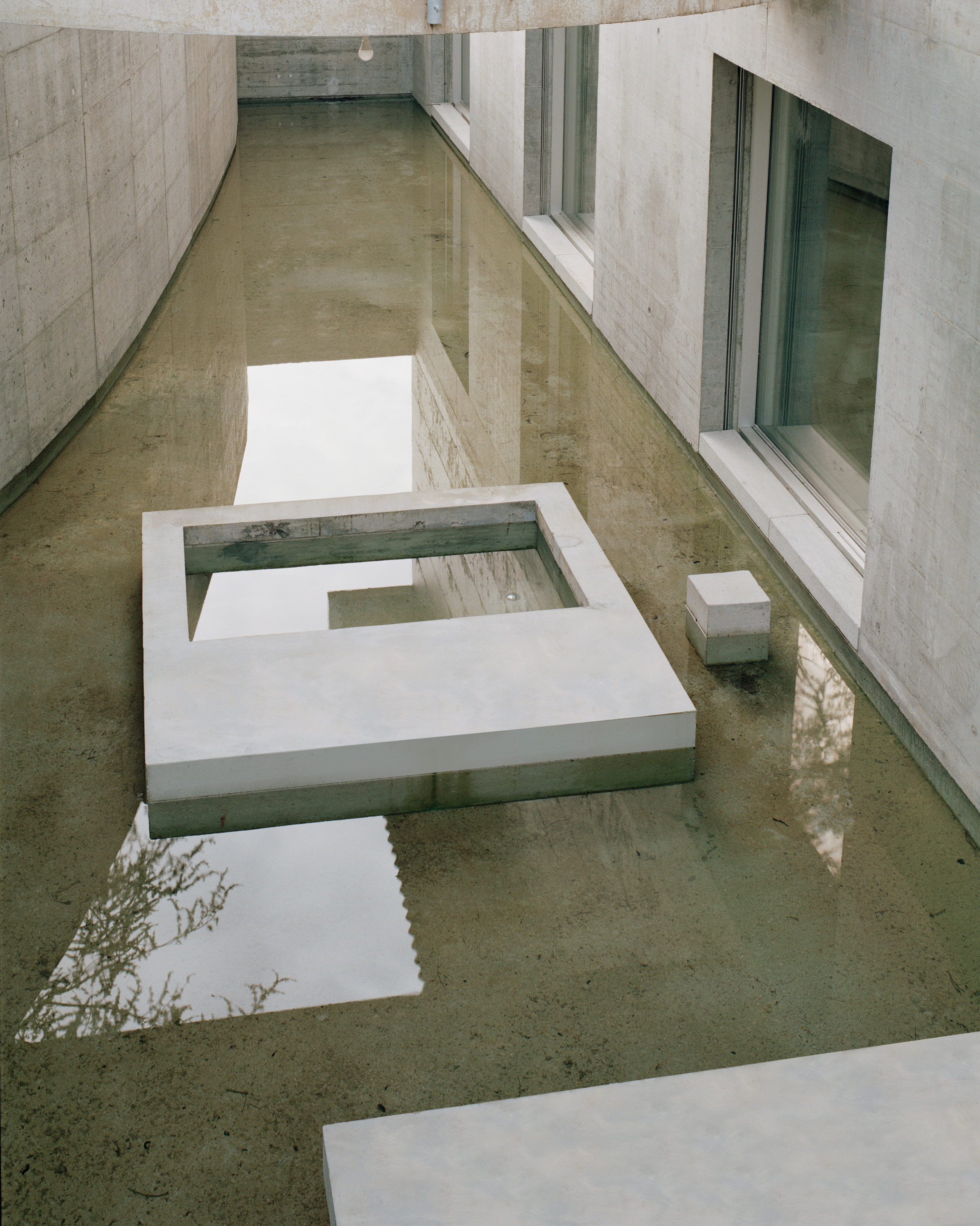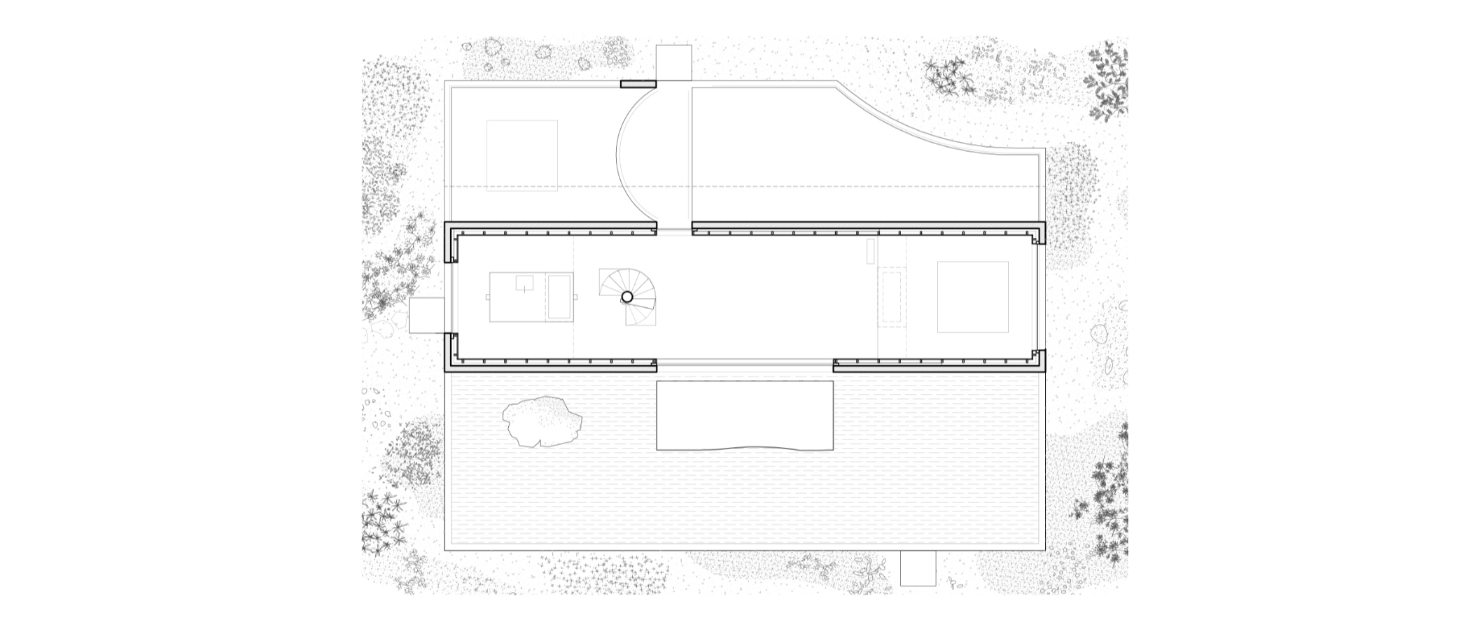 길고 단순한 파사드는 같은 길이의 수면에 반사되어 마치 빈 캔버스처럼 보인다. 긴 창문 하나가 같은 크기의 떠 있는 테라스로 이어진다. 주택은 긴 직사각형의 평면으로, 세 개의 층으로 구성된다. 지상층의 거실 공간은 외부 환경에 활짝 열려 있지만, 지하 침실은 외부에서 접근이 불가능하도록 중정과 가까이 있다.