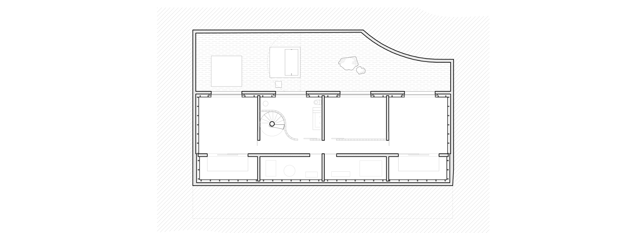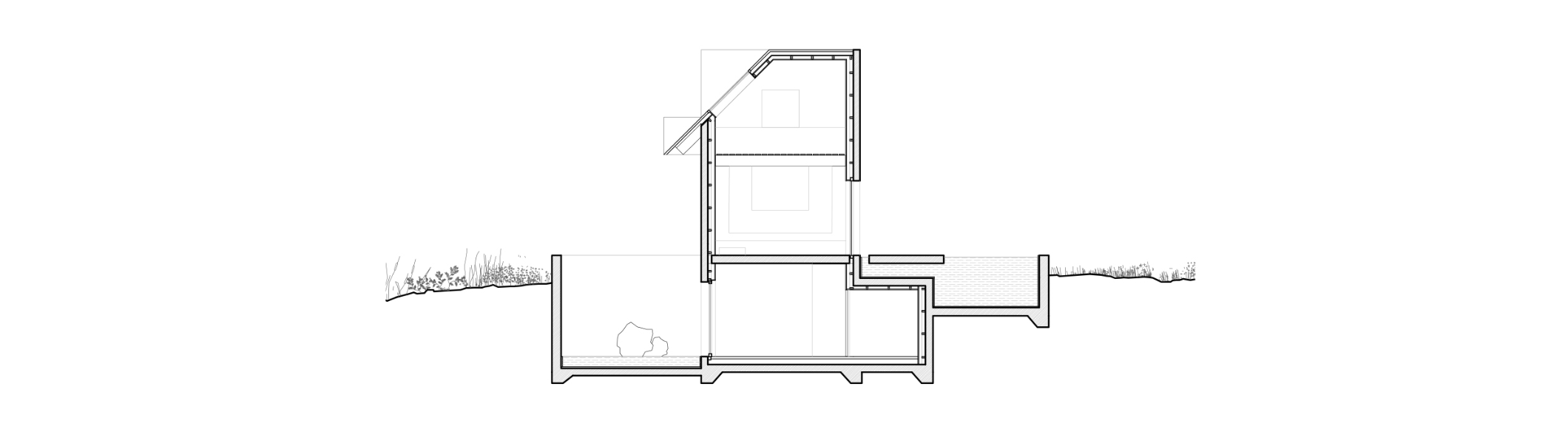 길고 단순한 파사드는 같은 길이의 수면에 반사되어 마치 빈 캔버스처럼 보인다. 긴 창문 하나가 같은 크기의 떠 있는 테라스로 이어진다. 주택은 긴 직사각형의 평면으로, 세 개의 층으로 구성된다. 지상층의 거실 공간은 외부 환경에 활짝 열려 있지만, 지하 침실은 외부에서 접근이 불가능하도록 중정과 가까이 있다.