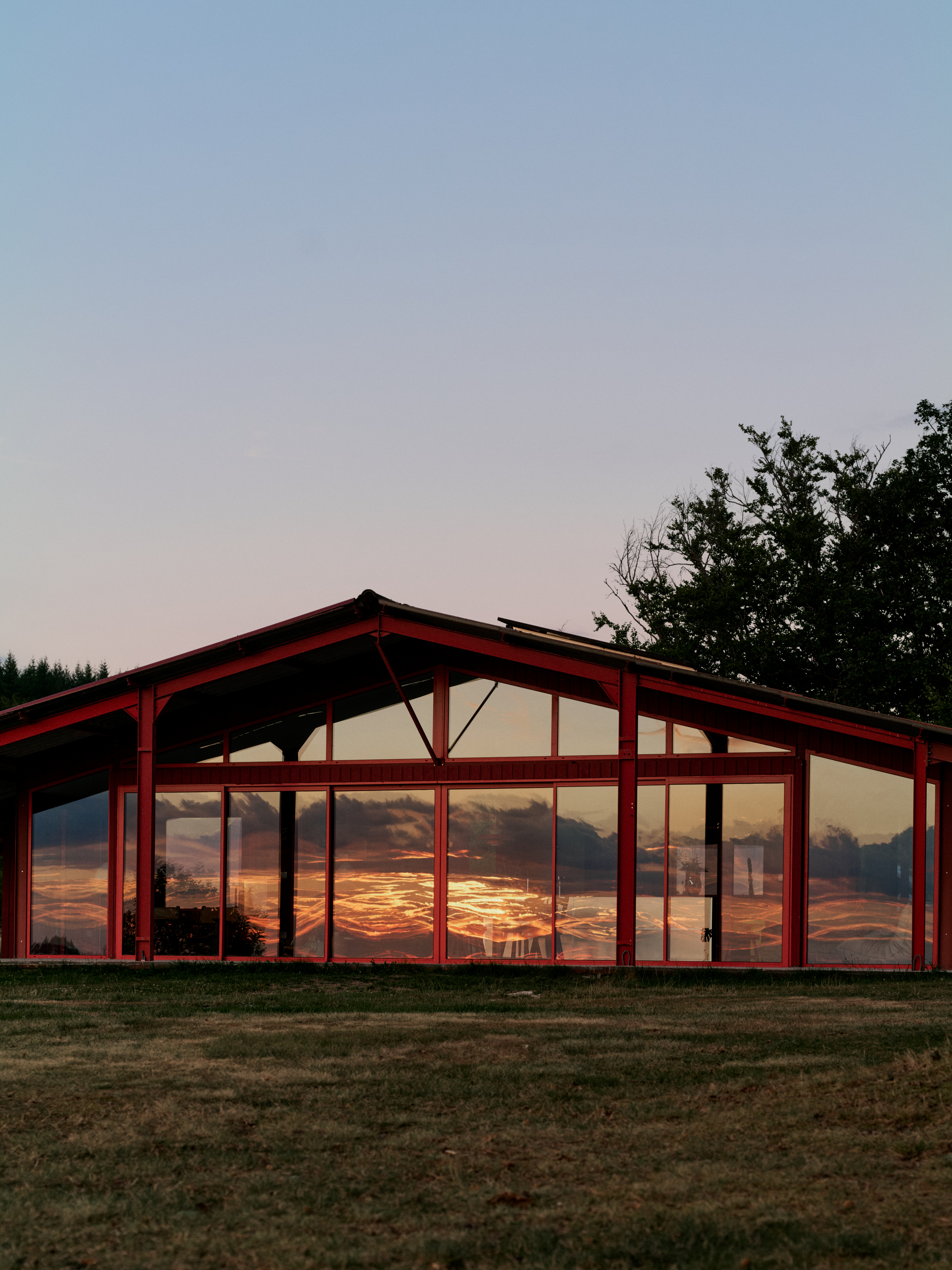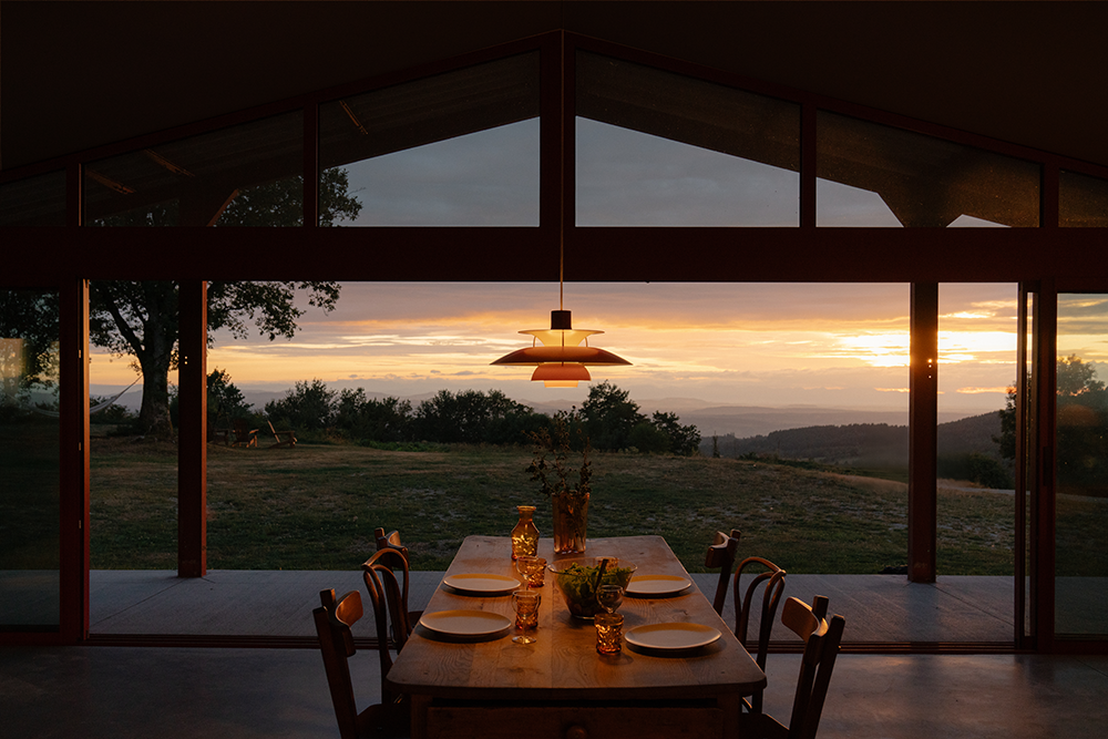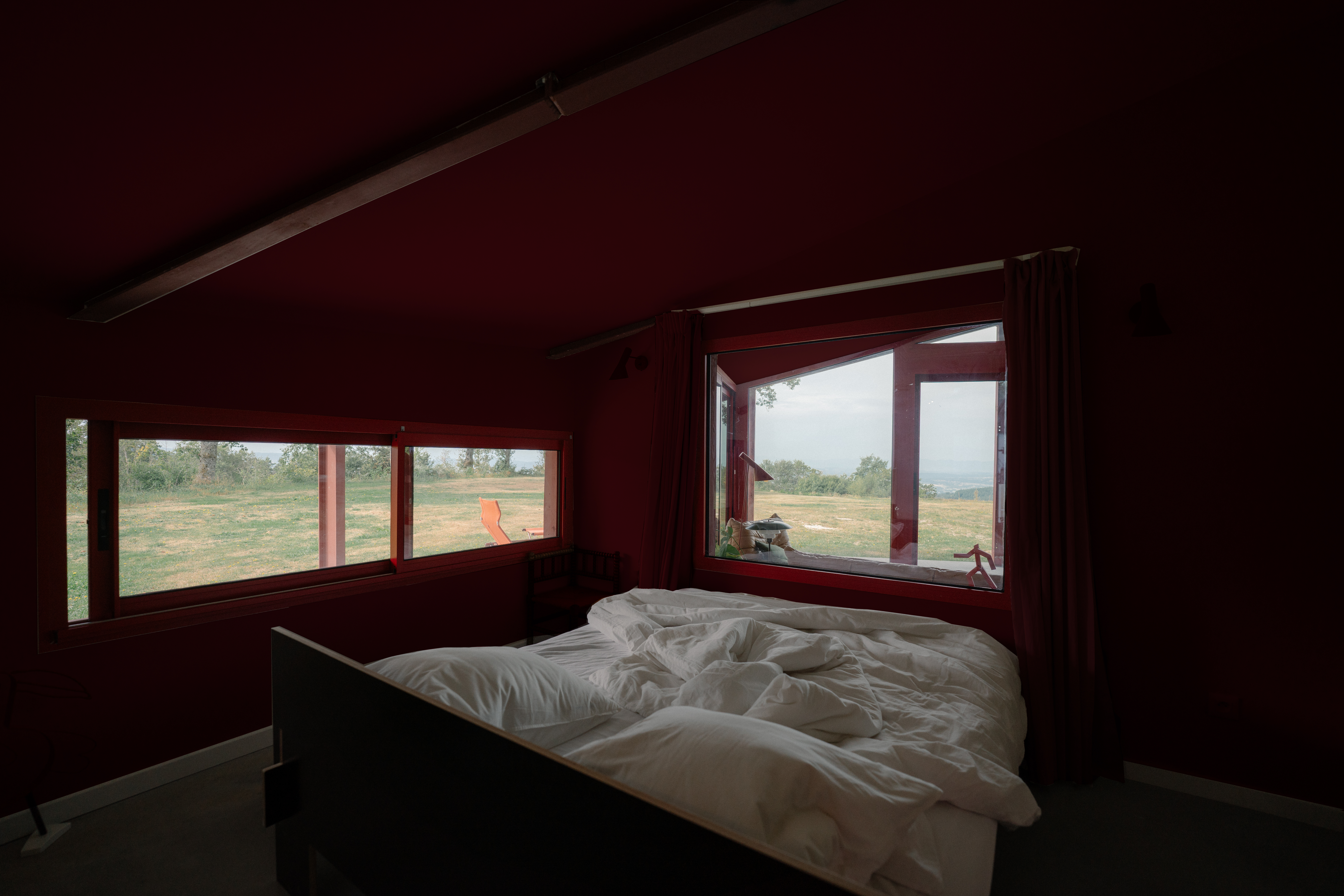 라 그랑 루즈는 마치 연극 무대처럼 설계되었으며, 매일 저녁 자연이 펼치는 장대한 공연의 무대가 된다. 정상에 자리한 집에서는 탁 트인 파노라마 전망이 펼쳐지며, 특히 서쪽 계곡을 향한 일몰은 황금빛과 붉은빛이 어우러져 황홀한 풍경을 감상할 수 있다. 기존 헛간의 강철 골조는 그대로 유지하되, 붉은색으로 칠했다. 이 색은 해질녘 하늘에서 영감을 받은 것으로, 집 전체에 따뜻한 분위기를 더하며 주변의 푸른 자연과 조화를 이룬다.
