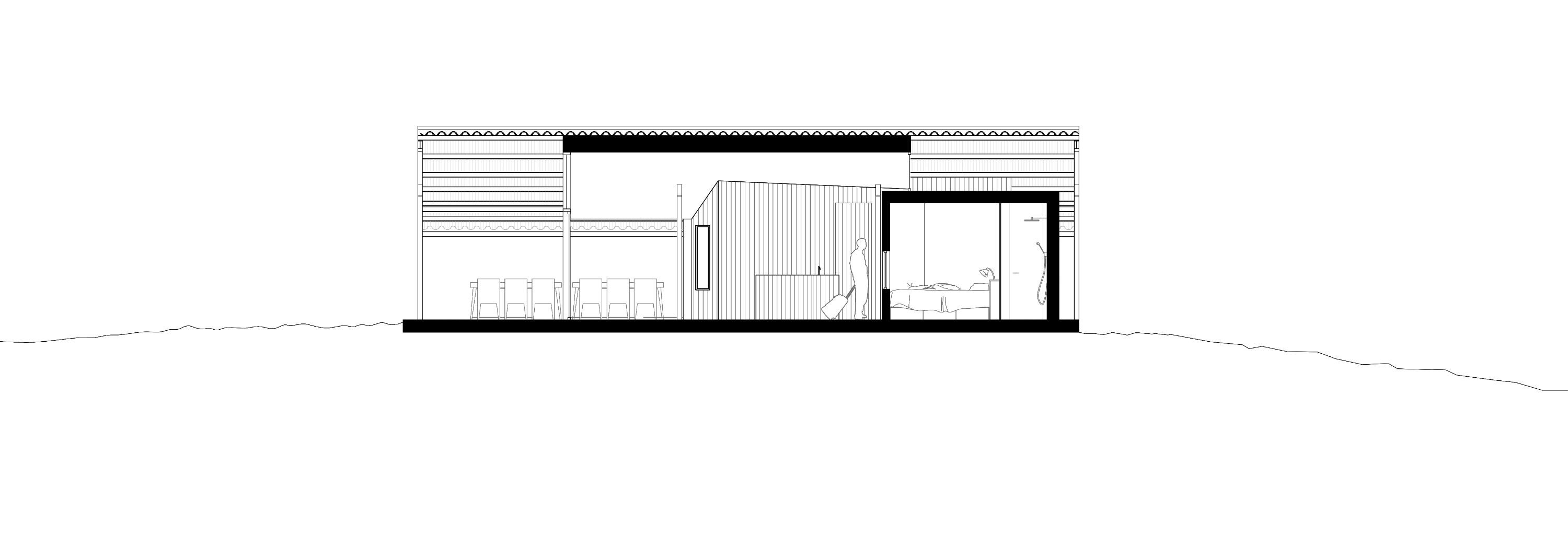 이 프로젝트의 세 개의 침실은 각각 독립된 작은 집처럼 보인다. 각 침실은 이용자에게 안식처가 되어 주며, 침대에 누운 채로도 계곡의 경이로운 풍경을 감상할 수 있도록 배치되었다. 개인 공간 사이에는 마치 작은 마을 광장처럼 공용 공간이 자리 잡고 있다. 서로 다른 개인 공간들을 자연스럽게 연결하며 모두가 함께 서쪽 지평선을 가득 채우는 장대한 풍경을 감상할 수 있도록 했다. 주방은 공용 공간의 중심 역할을 하며 다이닝 테이블은 자연을 향해 길게 뻗어 있어 식사 시간에 자연 속 으로 빨려들어가는 듯 한 경험을 할 수 있다. 이 집의 가장 독특한 요소 중 하나는 지붕 처마 아래 마련된 야외 욕조다. 투숙객들은 아침 햇살을 맞으며 여유로운 목욕을 즐길 수도 있고, 차가운 겨울 공기를 맞으며 온수에 몸을 담글 수도 있다. 계절에 상관없이 자연과 연결되는 특별한 순간을 선사하는 공간이다.