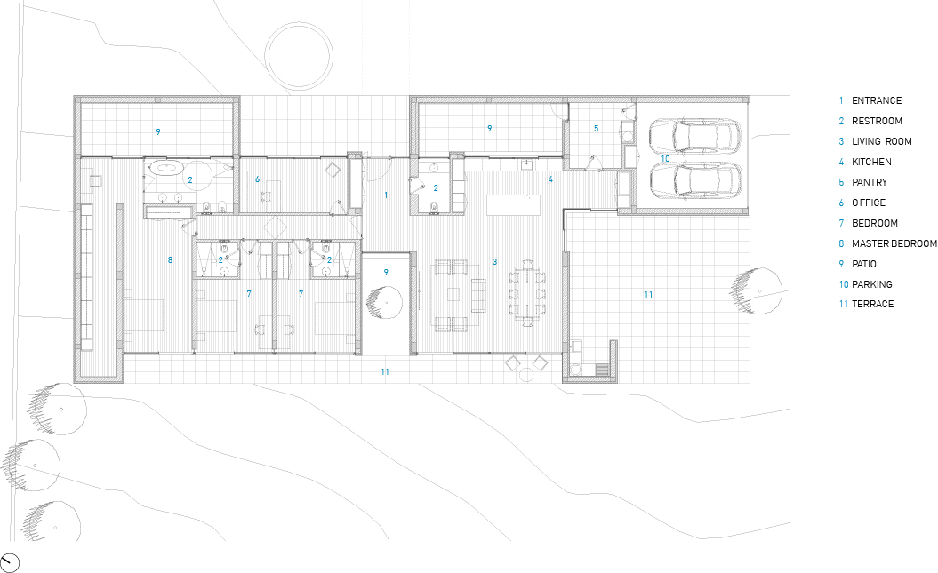 동쪽에 위치한 안뜰은 주방, 욕실과 같은 거주자들의 사생활 공간에서 충분한 자연광과 환기를 가능하게 한다. 지디 하우스는 아름다운 자연 경관과 건축이 조화롭게 존재할 수 있음을 보여주는 프로젝트다.