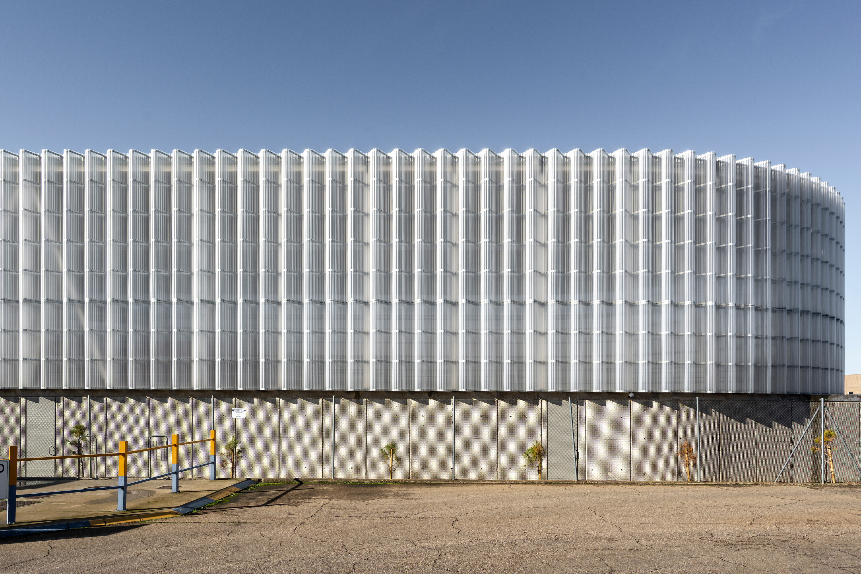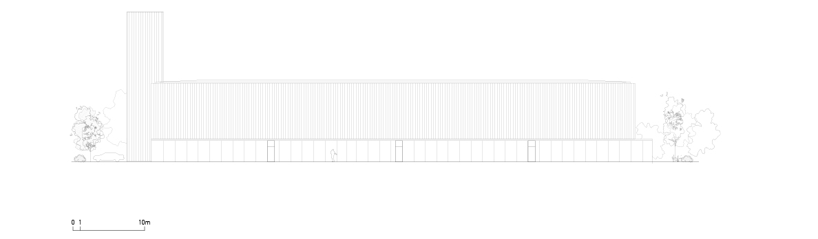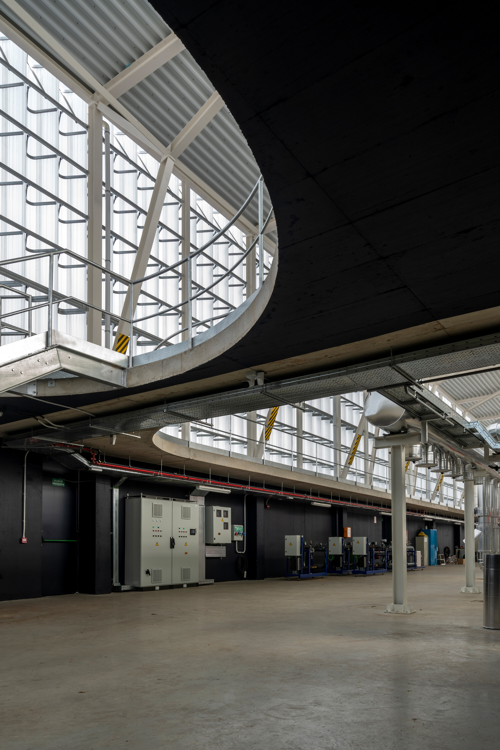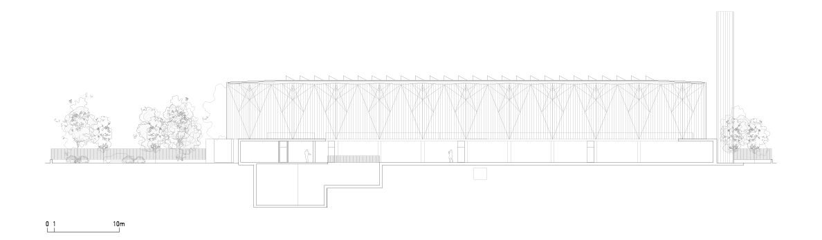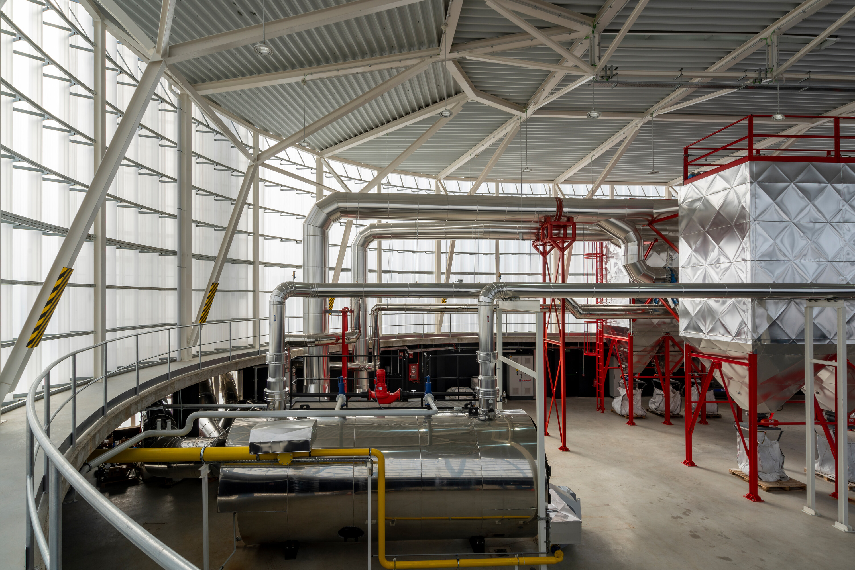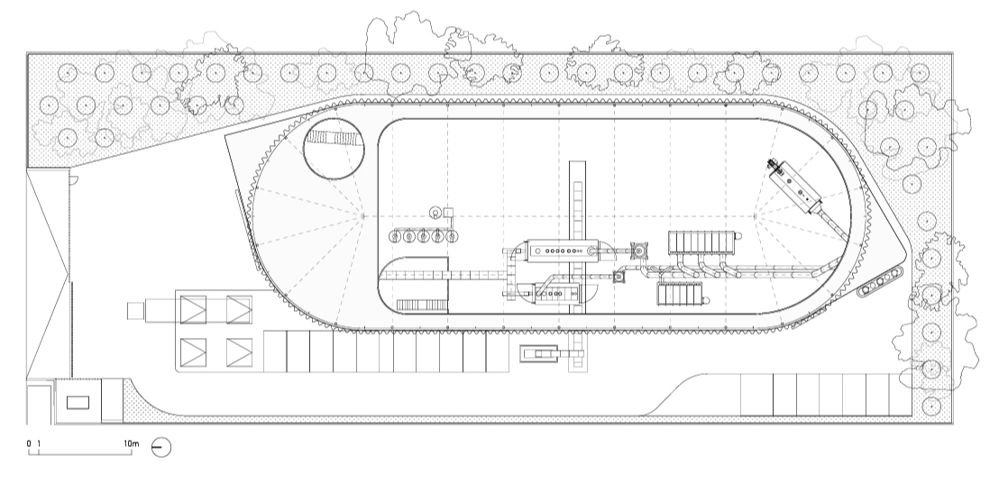 건물은 묵직한 콘크리트로 된 기반부와 가볍고 재활용 가능한 강철 및 플라스틱으로 만들어진 외피로 구성된다. 기반부는 모든 기계 장비를 지탱하며, 외부와의 연결을 담당한다. 이는 두 개의 큰 아연 도금 강철 게이트와 지하의 바이오매스 사일로를 통해 이루어진다. 콘크리트 기반부 내부에는 주변 기계들을 둘러싼 이동 동선이 있다. 강철과 플라스틱으로 된 외피는 산업 건물의 경제적 설루션을 재해석하여 지역 사회와의 상징적인 연결성을 지닌다. 다층의 골이 있는 반투명 폴리카보네이트 패널로 된 외벽은 섬세하게 도색된 강철 와이어 구조가 지지하고 있다. 별도로 분리된 타워는 필터링 과정을 거친 후 발생하는 하얀 연기를 배출한다.
