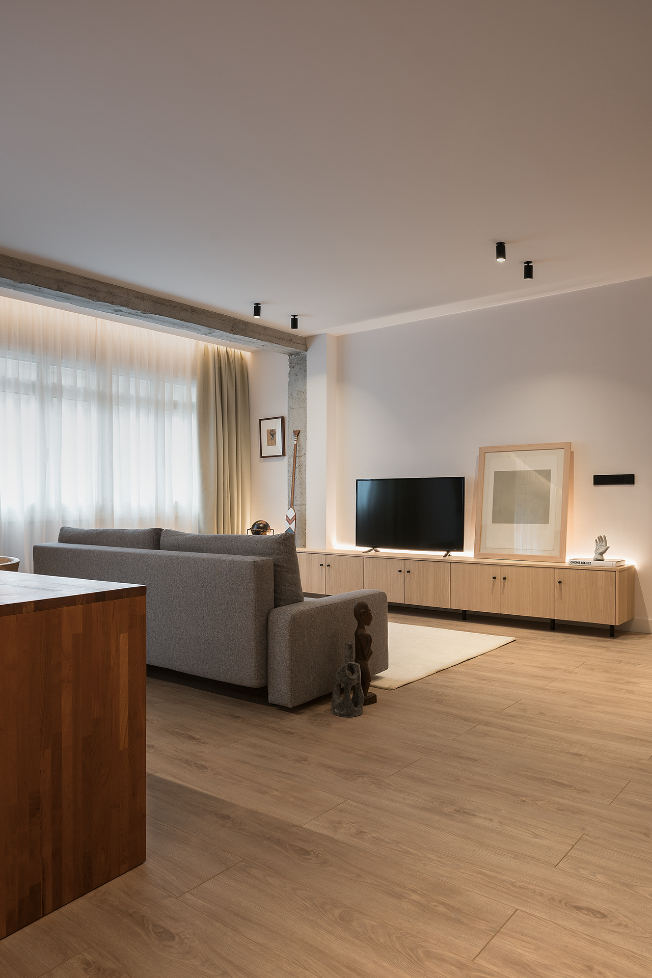 콘크리트 빔과 커튼 레일에는 간접 조명이 배치되었으며, 모든 가구 요소에도 조명을 통합시켜 깔끔한 공간을 연출했다. 일반 조명은 천장 마감에 매입되어서 공간에 은은한 빛을 더하며, 클라이언트가 소장한 예술 작품에 초점을 맞췄다. 이 아파트는 미니멀한 디자인 안에서 가족의 생활 방식과 예술적 감각이 조화를 이루며, 단순함과 우아함을 동시에 갖춘 공간으로 완성됐다.