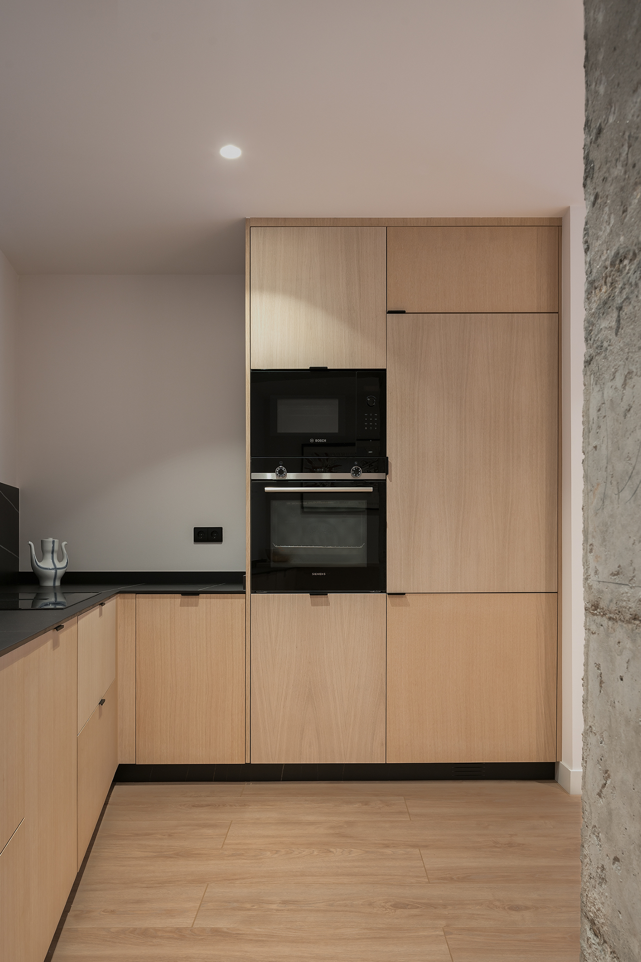 폰테베드라 중심부에 위치한 오래된 주택이 새롭게 탈바꿈 되었다. 리노베이션의 핵심은 간결한 평면 구성과 가구의 완벽한 통합이었다. 입구에서부터 이어지는 거실과 주방은 하나의 공간으로 통합되었고, 작은 복도를 지나 침실과 세탁실, 욕실이 배치된 공간으로 자연스럽게 연결된다. 모든 가구는 맞춤형으로 설계되어 공간의 일관성을 극대화했다.