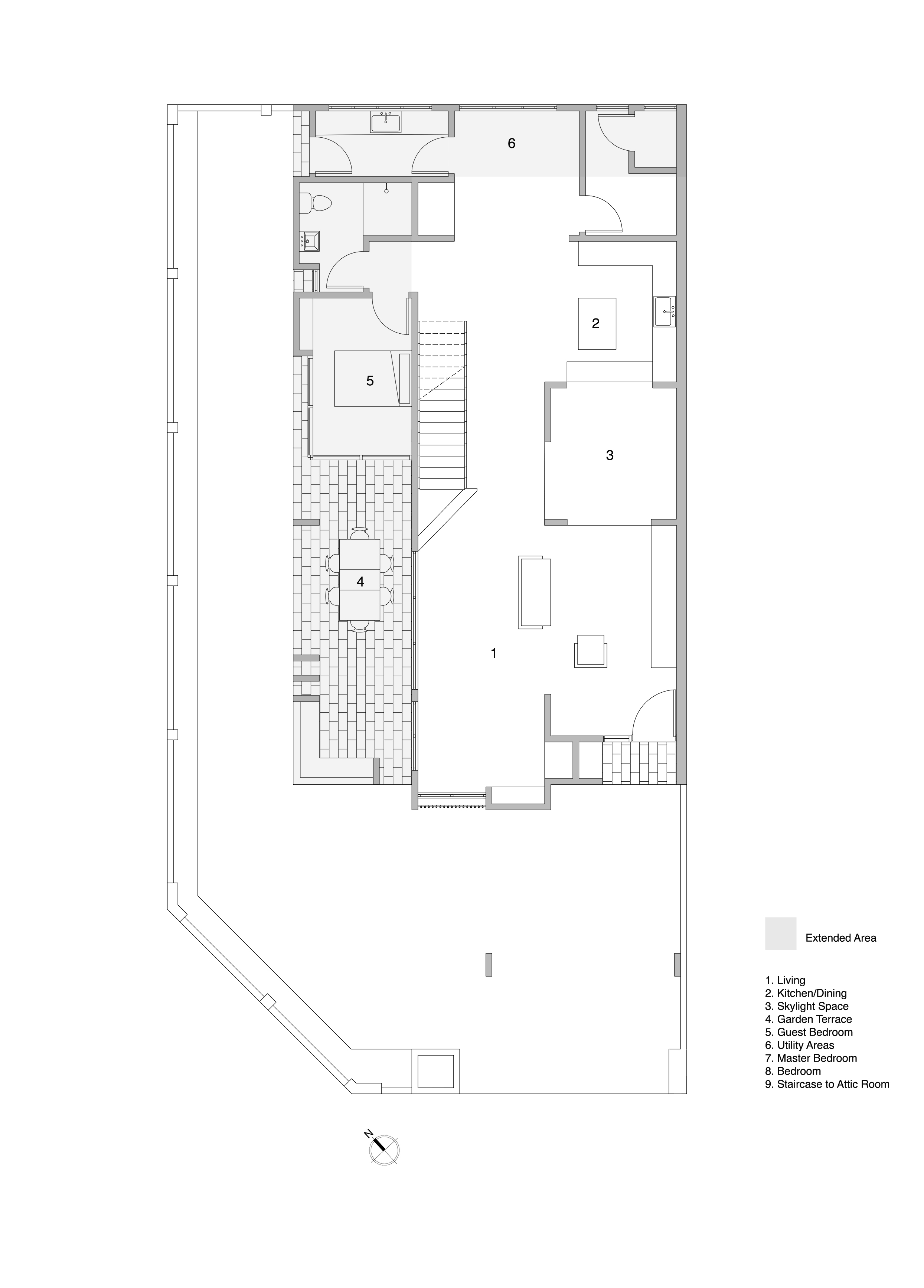 리모델링의 목표는 기존 구조의 허용 범위 내에서 현대적인 공간을 구현하고 채광과 환기를 개선하는 것이었다. 건축주는 자녀가 크면서 사용 할 공간도 필요로 했다. 이에 따라 1층은 정원과 건물 뒤쪽 방향으로 확장되어 그늘진 테라스, 게스트룸, 유틸리티 공간을 추가로 계획했다. 다락은 작은 방으로 리모델링 되었으며, 좁고 낮은 공간의 제약을 극복하기 위해 교차 계단을 설치했다.