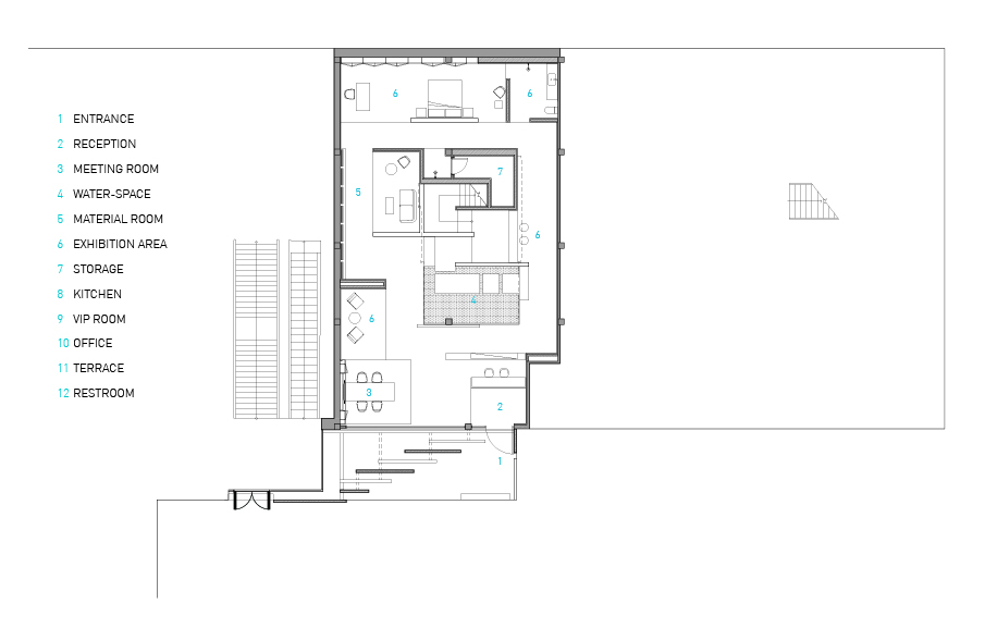 벽 사이에는 다양한 테마 전시 공간과 샘플 구역이 배치되어 있어 사람들이 벽 사이를 거닐며 제품의 특성을 느낄 수 있다. 때로는 물 위를 걷고, 때로는 벽에 기대어 휴식을 취하는 등 마치 산을 걷는 것 같은 자연스러운 경험을 제공한다. 층을 이루는 벽은 주요한 시각적인 요소로, 건물의 외관에서 내부 공간으로 이어지며 부지의 깊이를 극대화한다. 간결하고 깔끔한 흰 매스는 복잡한 도시 환경에서 돋보이며 브랜드의 시각적 아이덴티티를 강화한다. 층을 이루는 벽은 왼쪽에서 오른쪽으로 비스듬히 배치된다. 이러한 배치는 일부는 땅에 서 있고 일부는 공중에 떠 있는 바위 같은 질감의 모습은 산을 공간적으로 해석한 것이다.