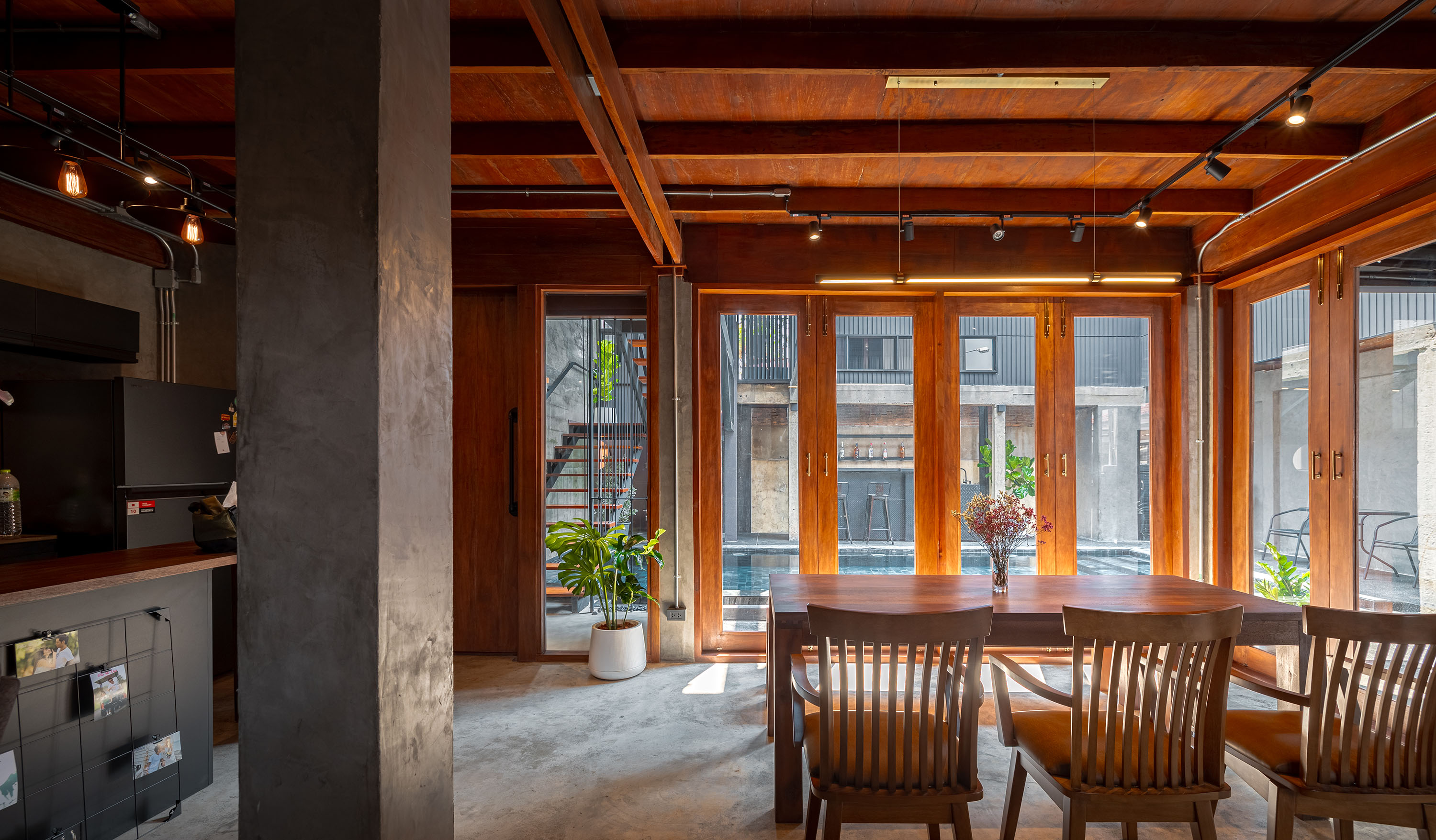 아래층 거실은 실내외 공간을 원활하게 연결하기 위해 오래된 벽을 철거하고 자연광이 들어올 수 있게 구성해 개방감 넘치는 거실로 바꿨다. 이는 태눈(태국 전통 가옥의 아래층처럼 열린 공간)과 유사하다. 위층의 안방은, 새로운 벽 재료들이 기존 구조와 결합되어, 전통과 현대 디자인 개념의 조화를 이뤘다. 계단은 밝고 환한 공간으로 탈바꿈하여 두 층을 연결하고 실내외의 경계를 넘나드는 중요한 역할을 했다.
