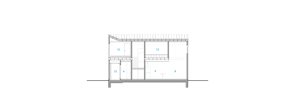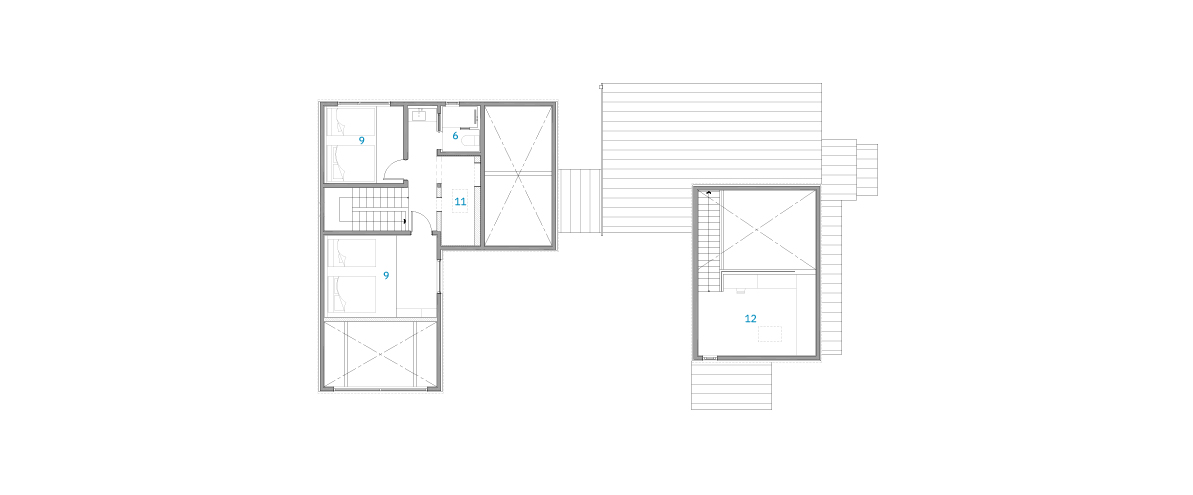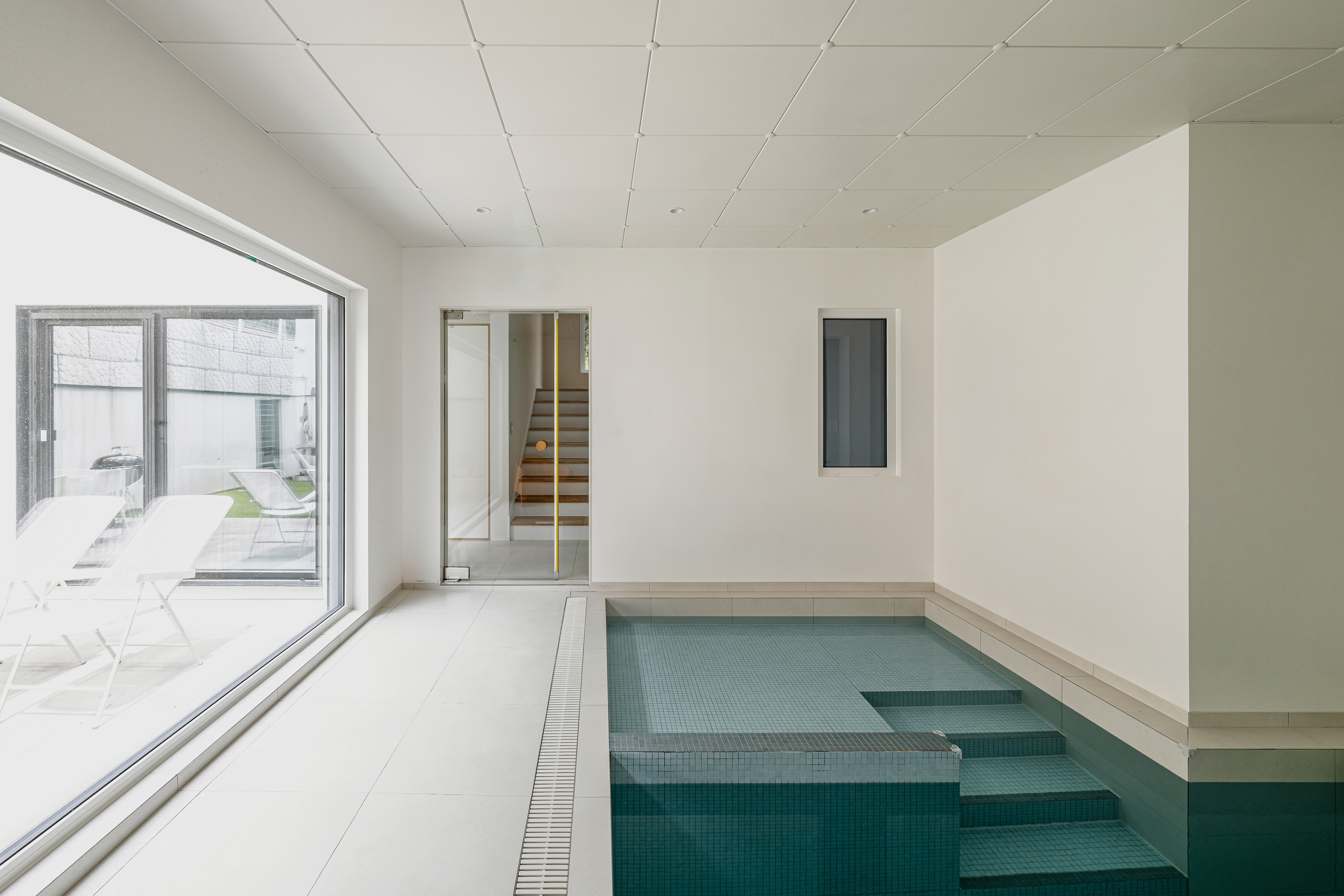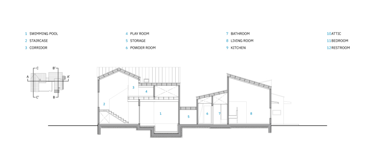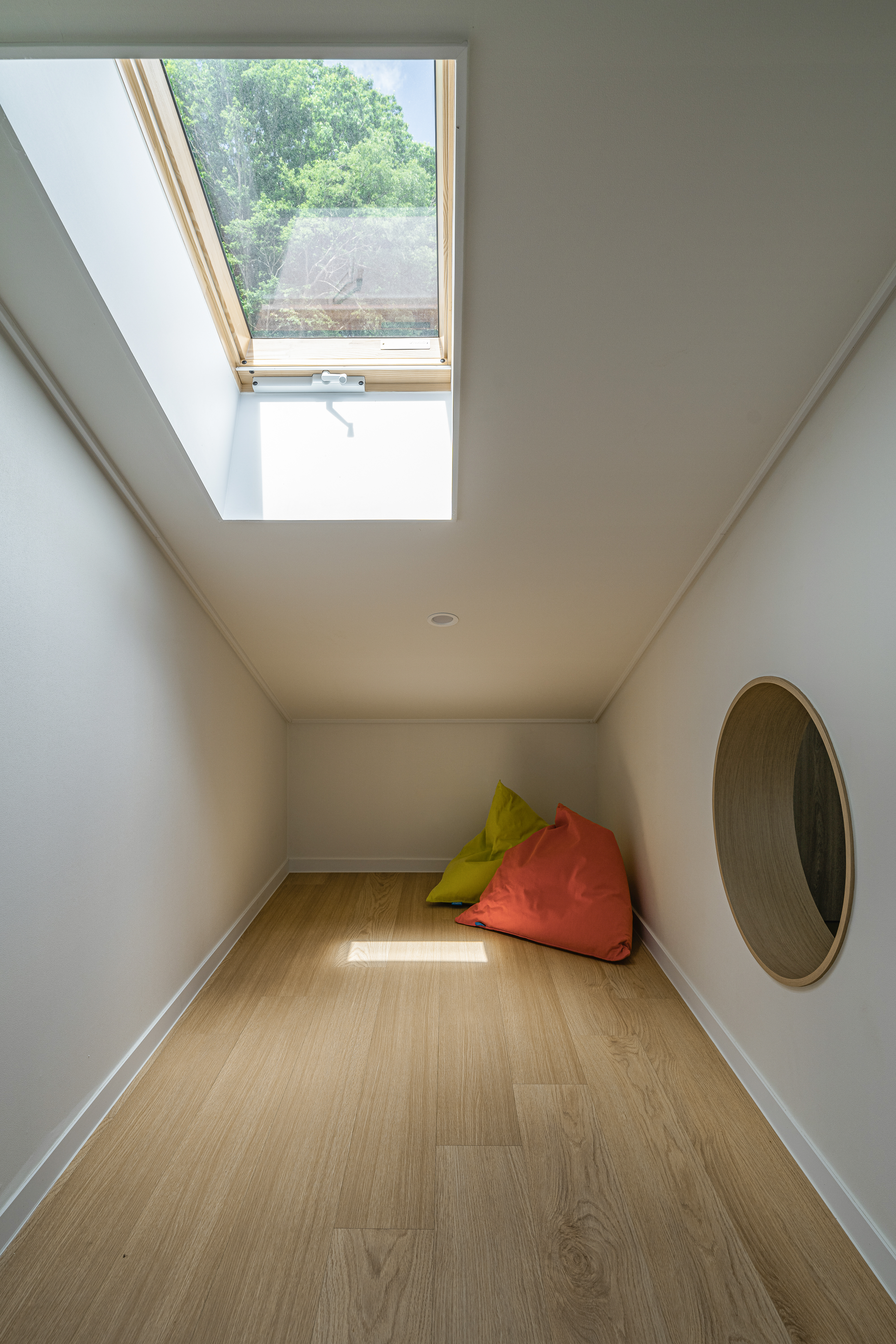 실내에 마련된 수영장은 산월에 특별함을 더하는데, 전면의 통창을 통해 외부 공간과 시각적으로 연결되고 사계절 내내 이용할 수 있는 장점이 있다. 2층에는 두 개의 객실과 작은 놀이방이 마련되어 있다. 경사 지붕 아래 다락 공간을 활용한 놀이방은 아이들의 눈높이에 맞춘 특별한 놀이 공간이다. 원형의 개구부는 아이들의 상상력을 자극하고 즐거움을 준다.