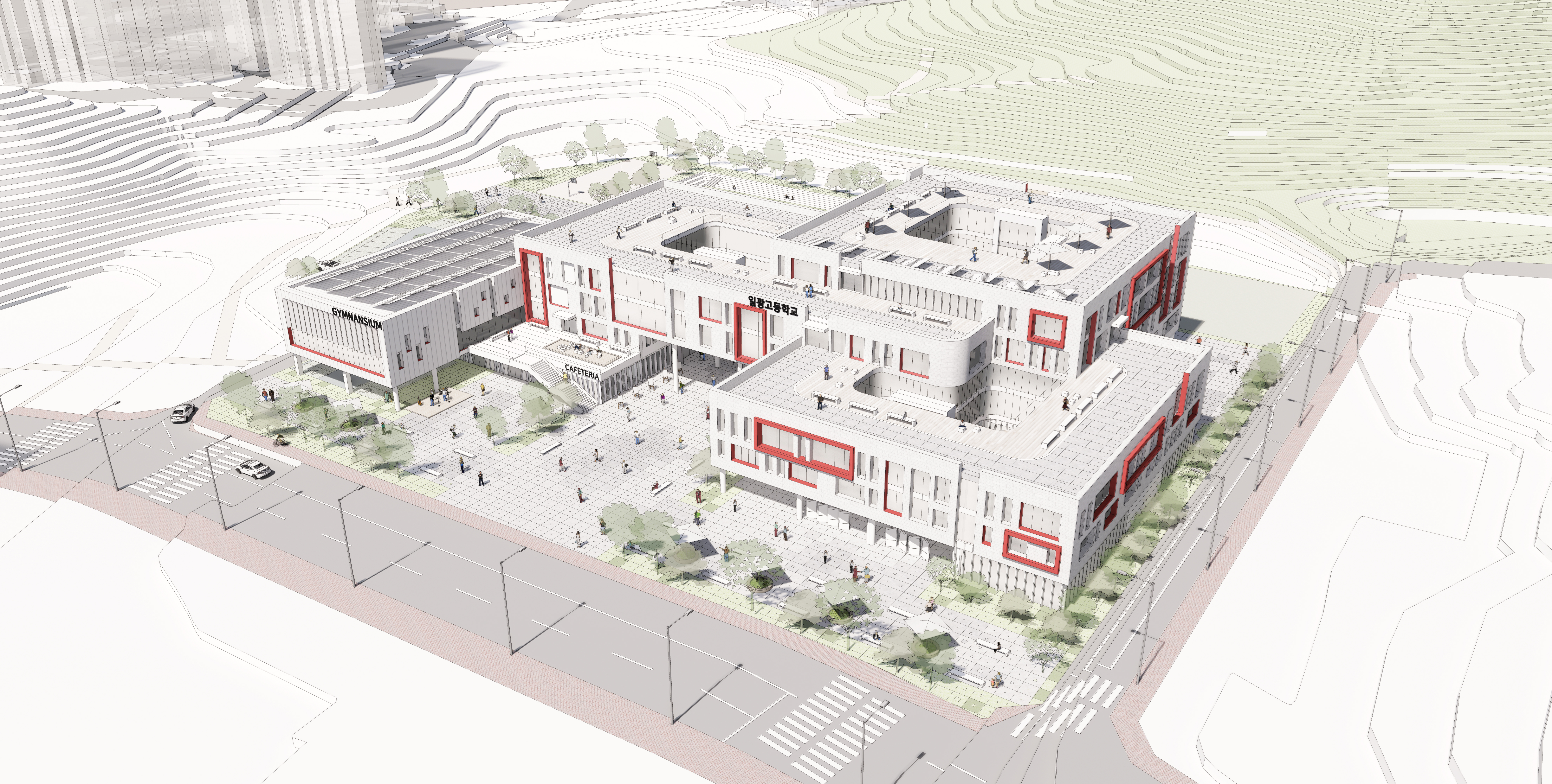 또한, "지역과 호흡하다"라는 키워드를 중심으로, 열린 가로에 다양한 이벤트를 포함하여 지역사회와 자연이 융합될 수 있는 ‘문화예술가로’를 제공하였다. 이를 통해 학교를 단순한 교육공간이 아닌, 지역과 함께 호흡하는 교육공간으로 조성하였다.
